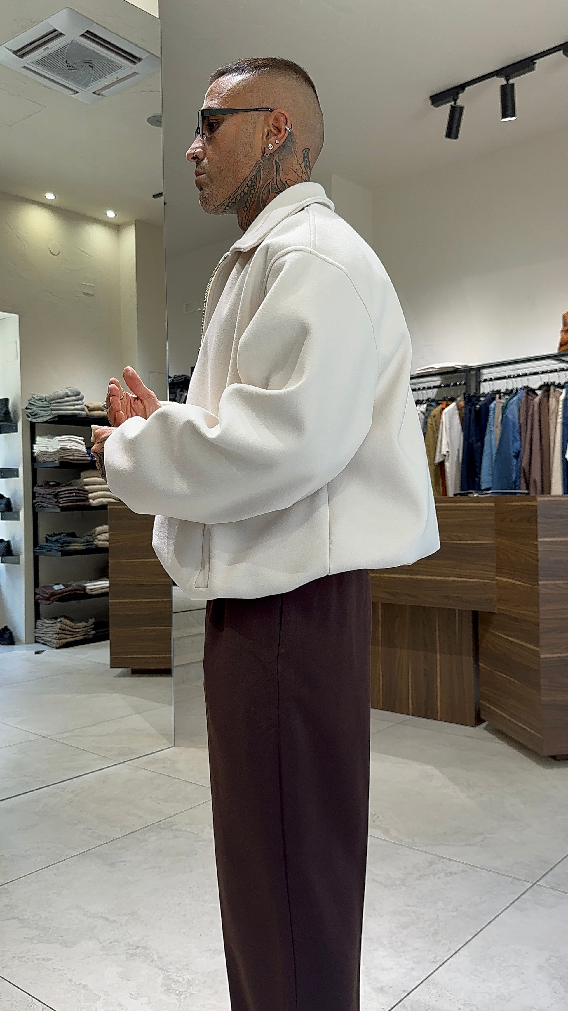Modello H 1.83 x 85 kg indossa taglia L. Vestono over. Chiusura zip. Manica e fondo arricciato. Collo camicia. Tessuto poliestere.