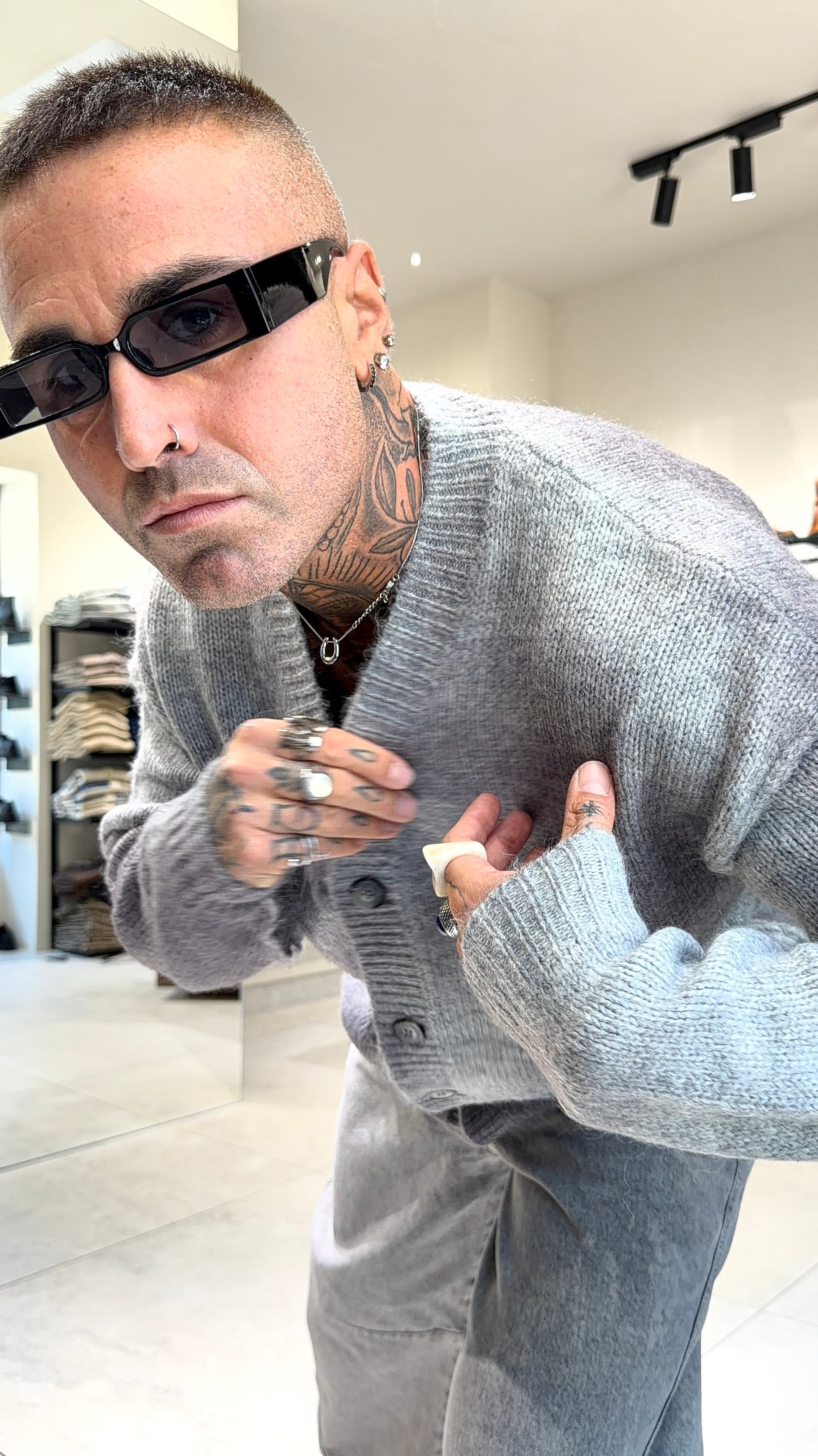 Modello H 1.83 x 85 kg indossa taglia L. Vestibilità over. Chiusura bottoni. Pelo lungo. Misto lana.