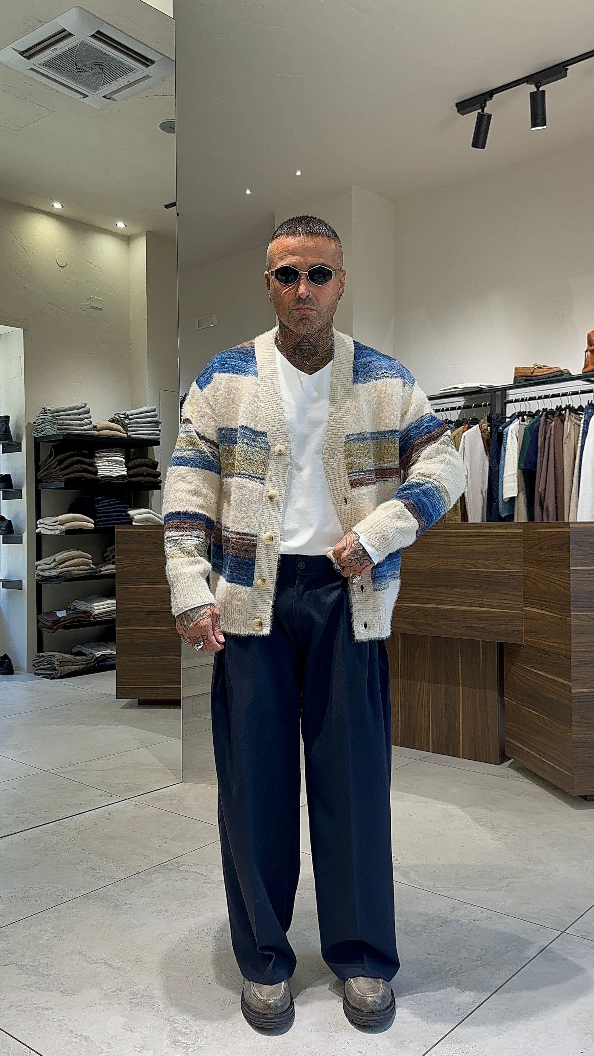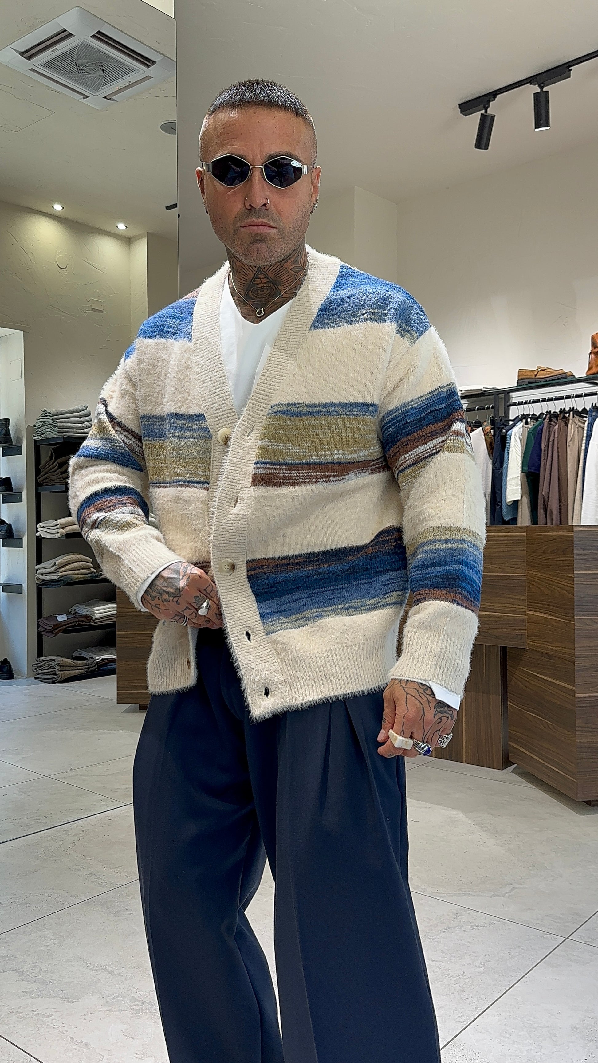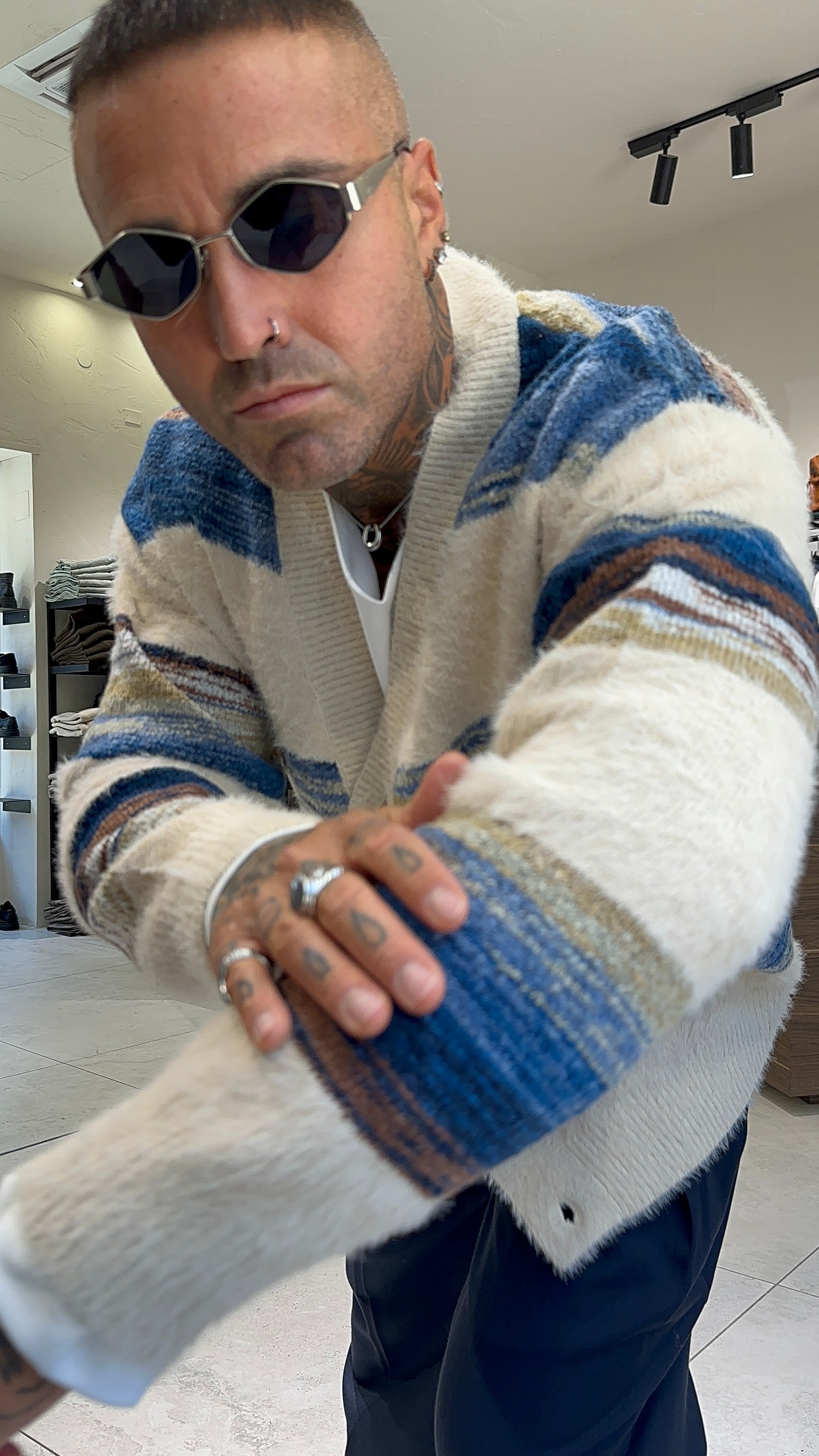Modello H 1.83 x 85 kg indossa taglia L. Vestibilità over. Chiusura bottoni. Pelo lungo. Misto lana.
