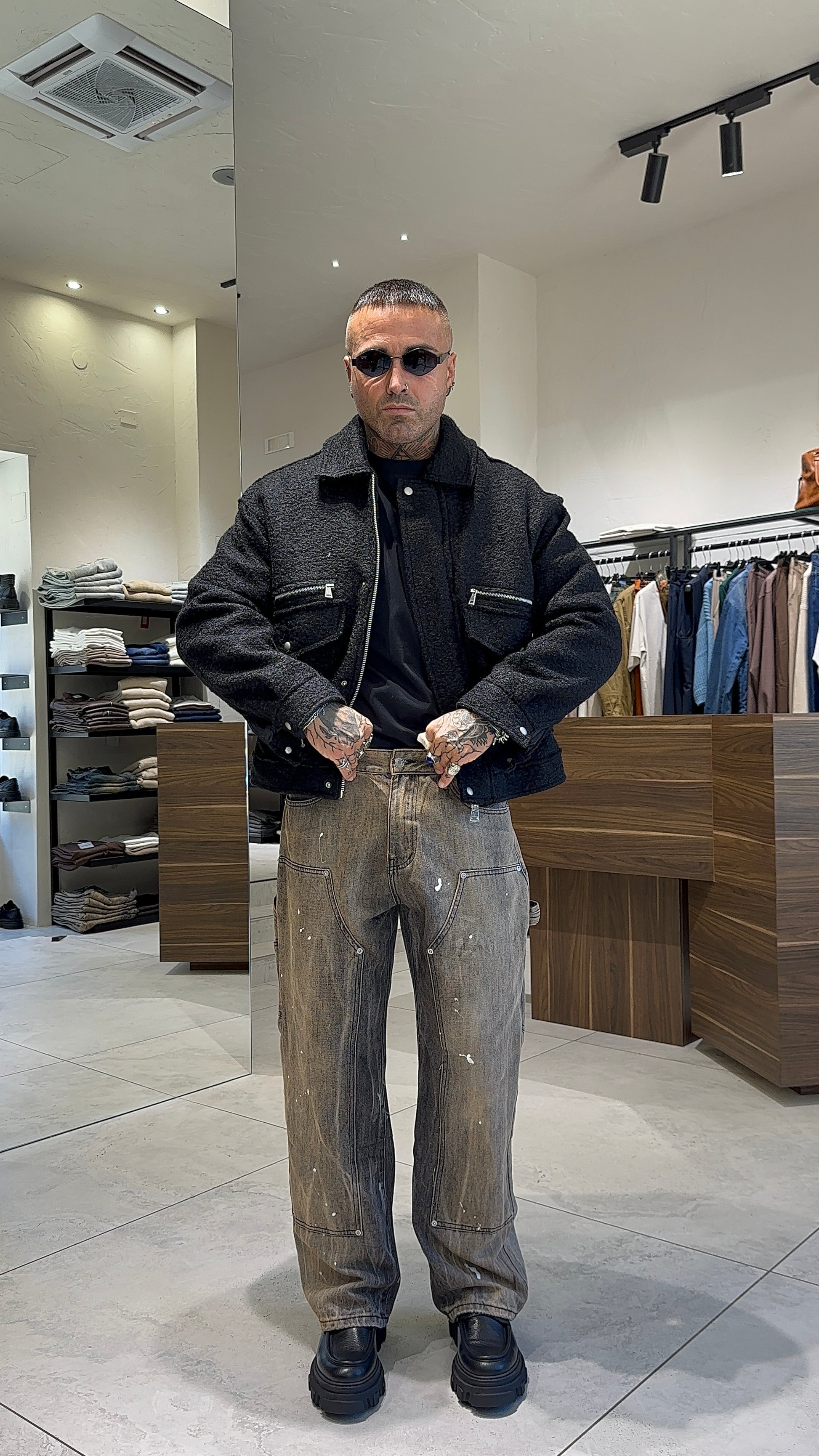 Modello H 1.83 x 85 kg indossa taglia L. Vestibilità over. Chiusure zip. Poliestere.