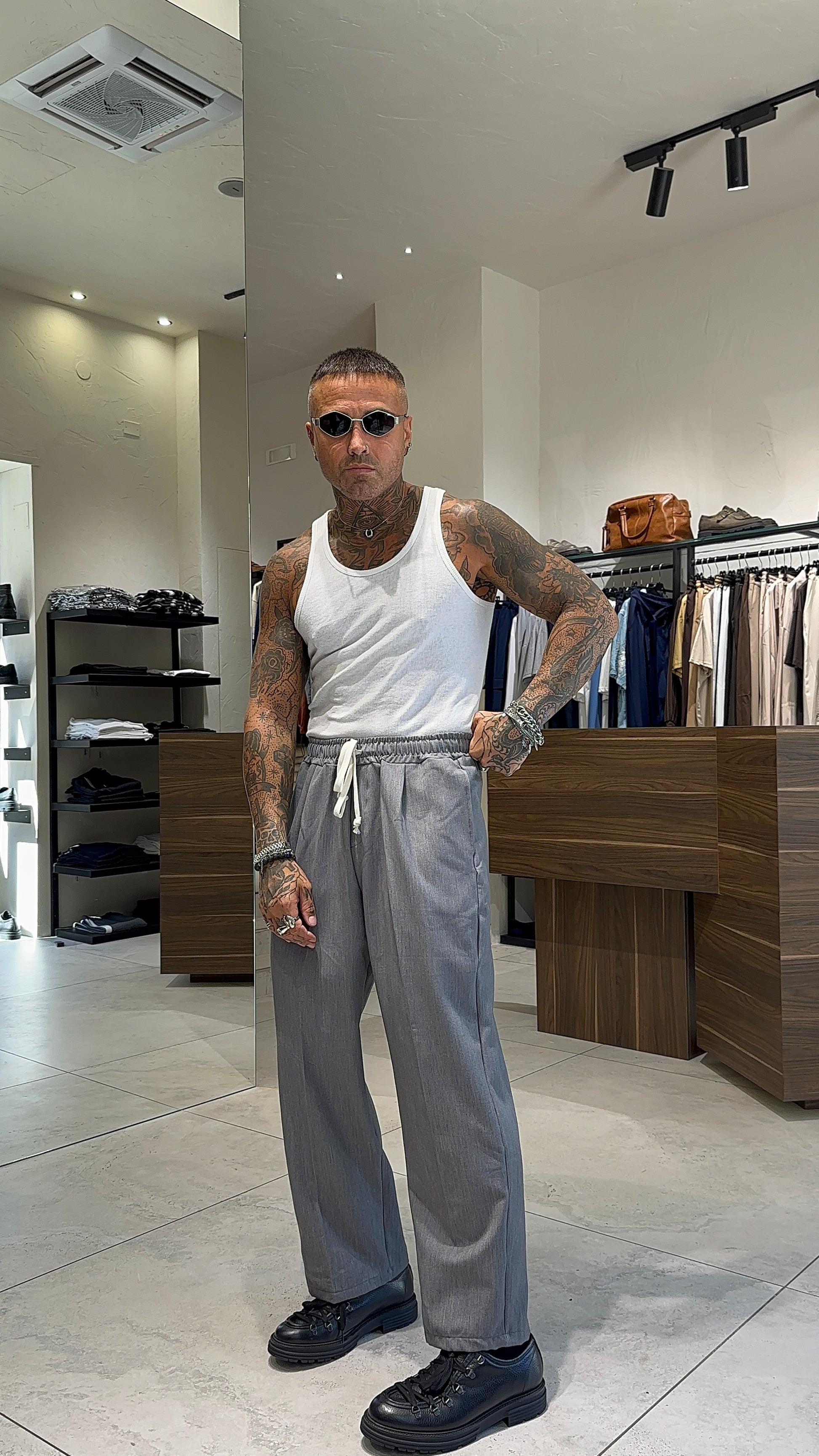 Modello H 1.83 x 85 kg indossa taglia L. Vestibilità larga. Pence larghe. Gamba comoda. Laccio regolabile in vita. Tessuto poliviscosa.