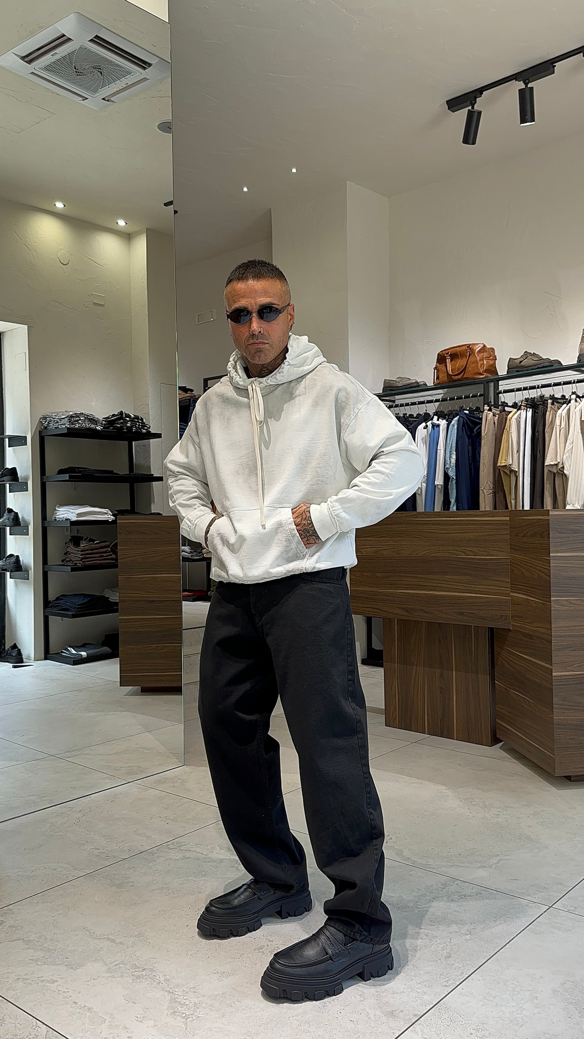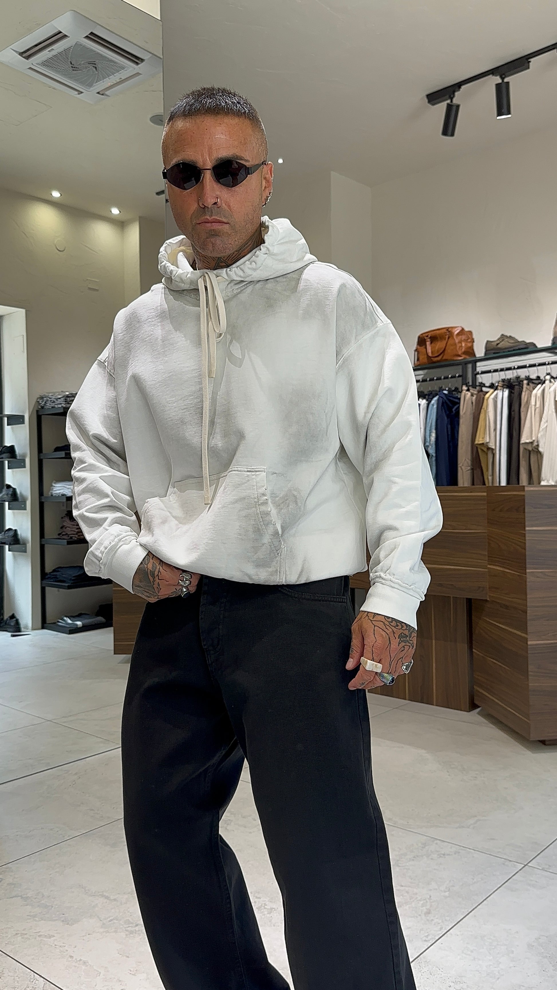 Modello H 1.83 x 85 kg indossa XL. Vestibilità over. Micro abrasioni e sfumature in vari punti. Tessuto 100% cotone.