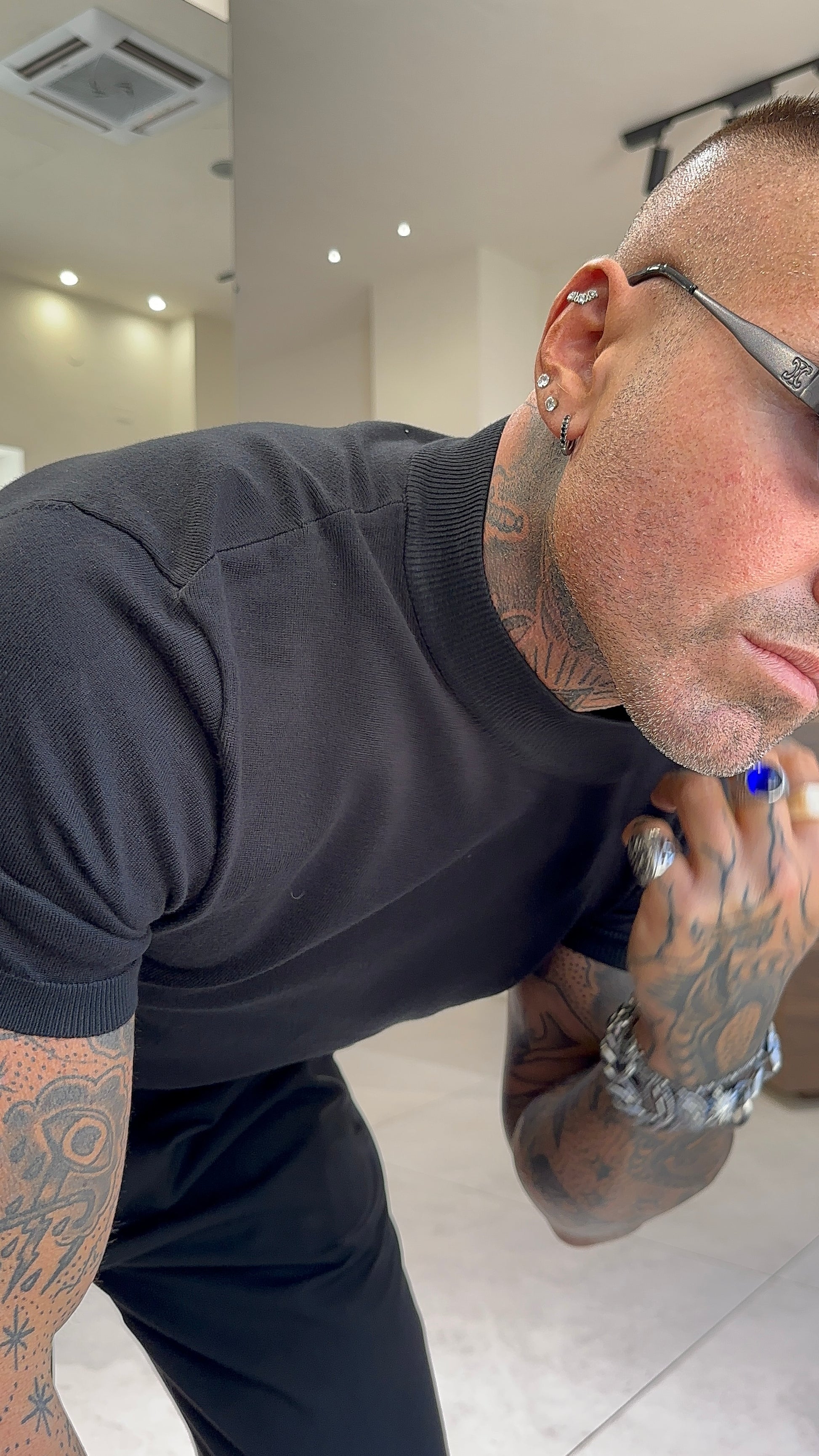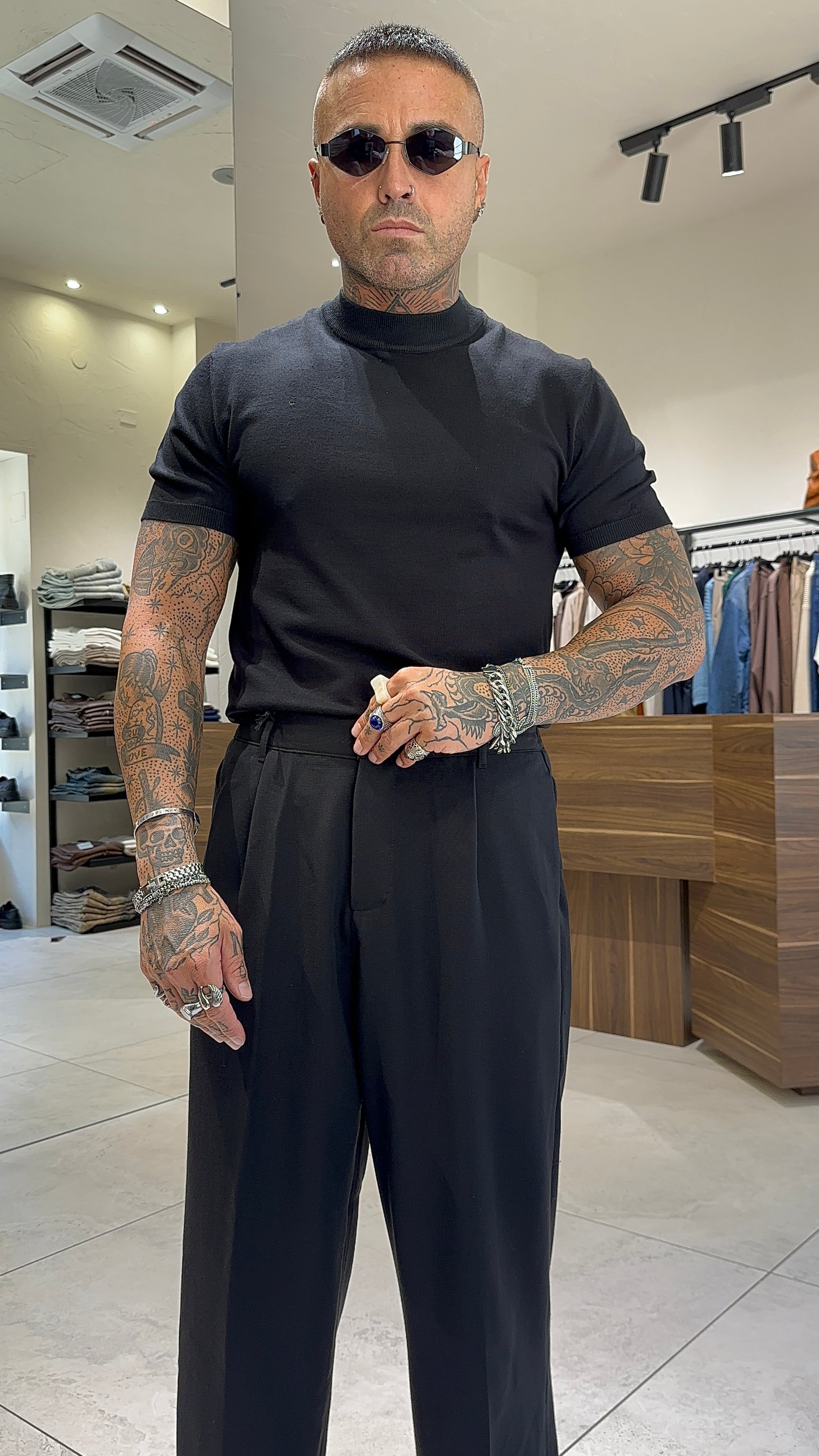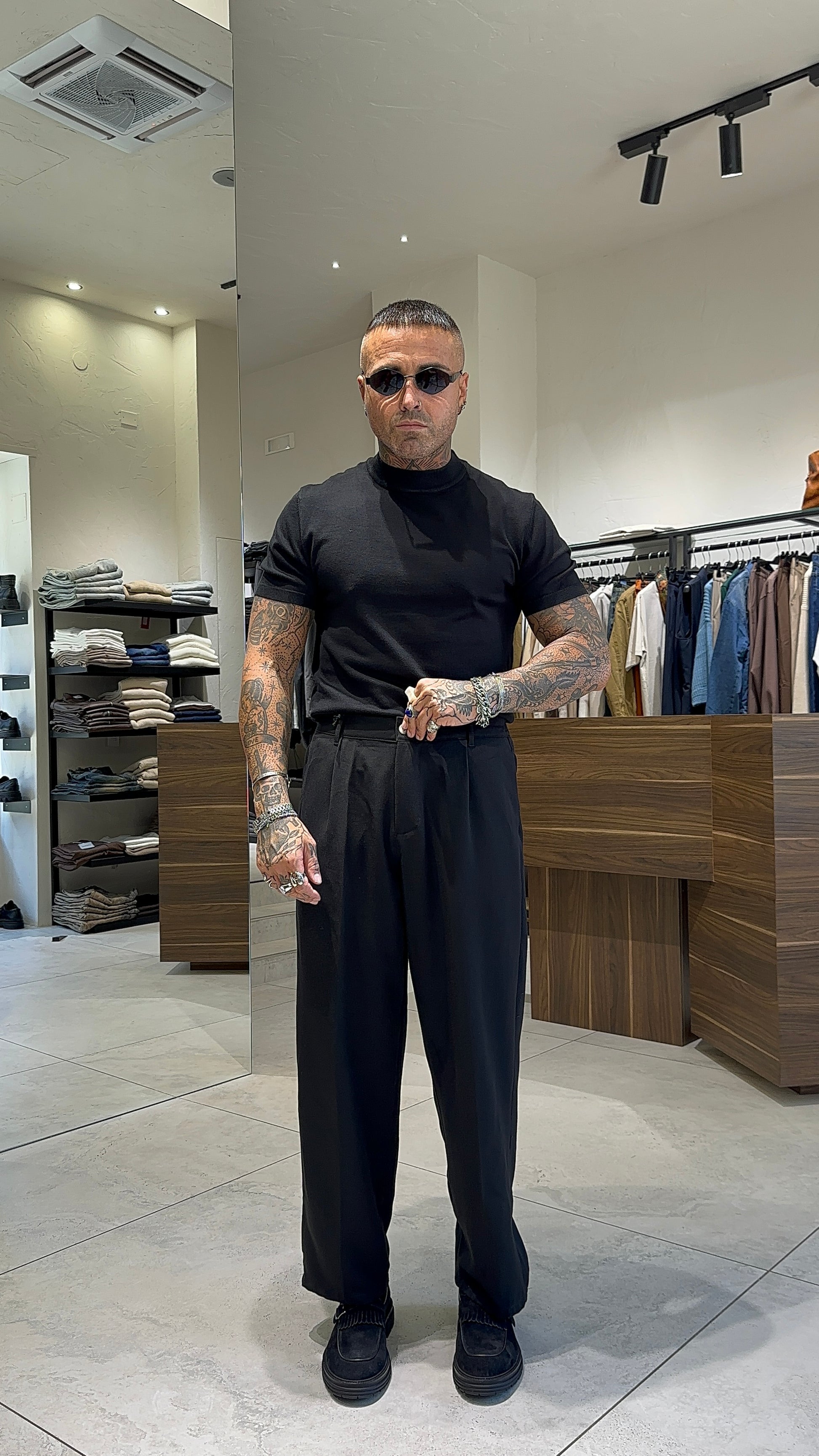 Modello H 1.83 x 85 kg indossa taglia L. Vestibilità stretta. Mezzo collo e mezza manica. Tessuto misto lana.