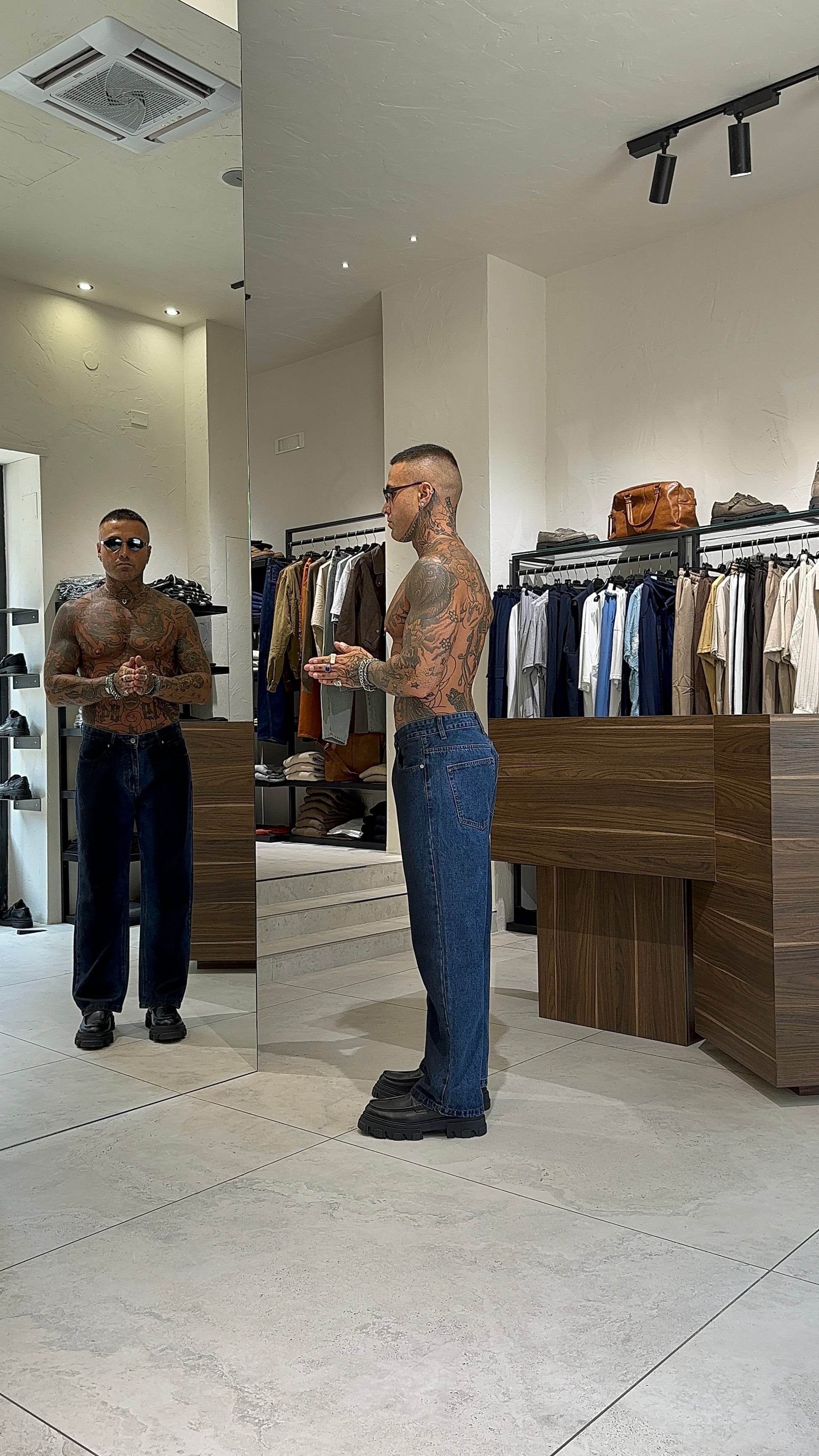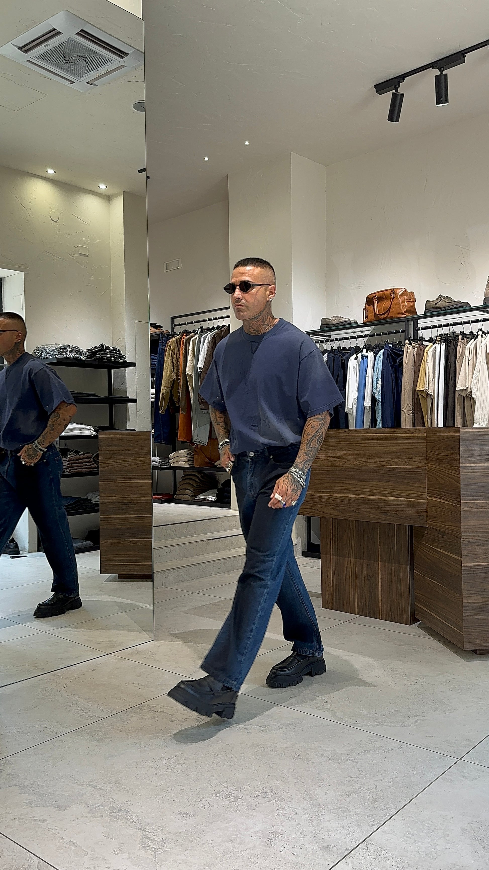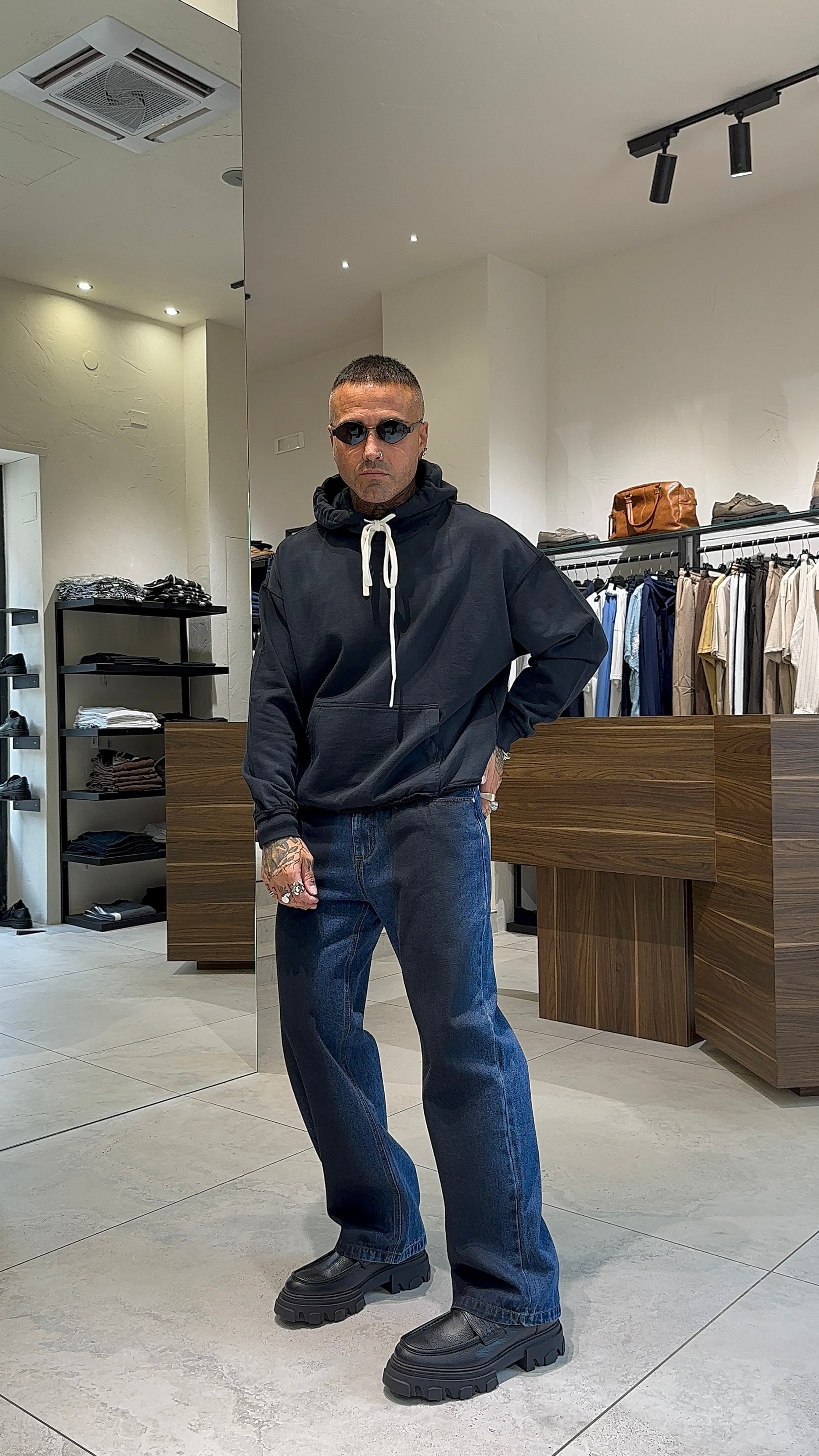 Modello H 1.83 x 85 kg indossa taglia 48. Vestibilità larga. Tela fondo blu sfumato nero.