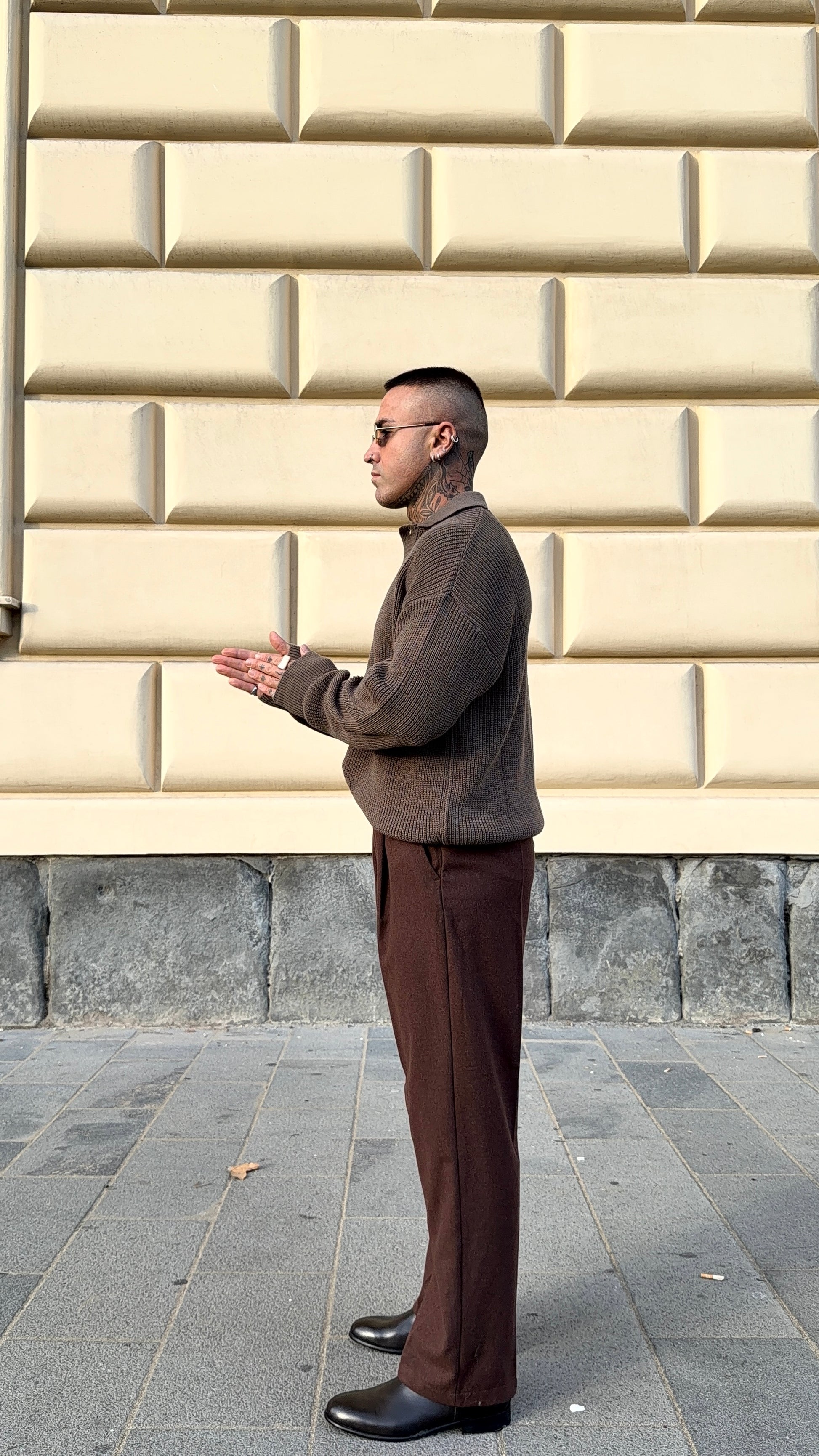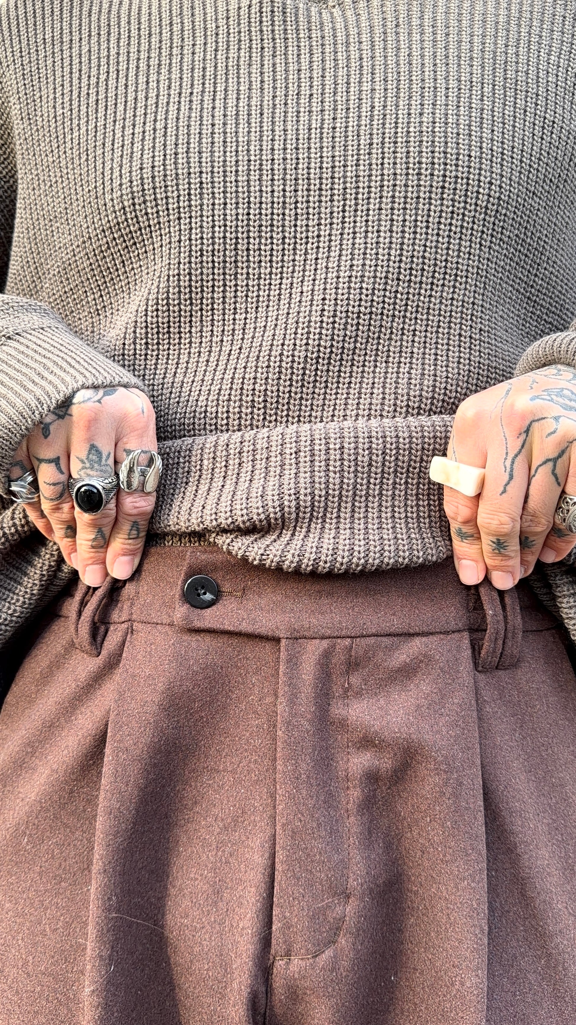 Modello H 1.83 X 85 kg indossa XL. Vestibilità larga. Girovita elastico. Chiusura bottone. Pence. Fondo largo. Misto lana.