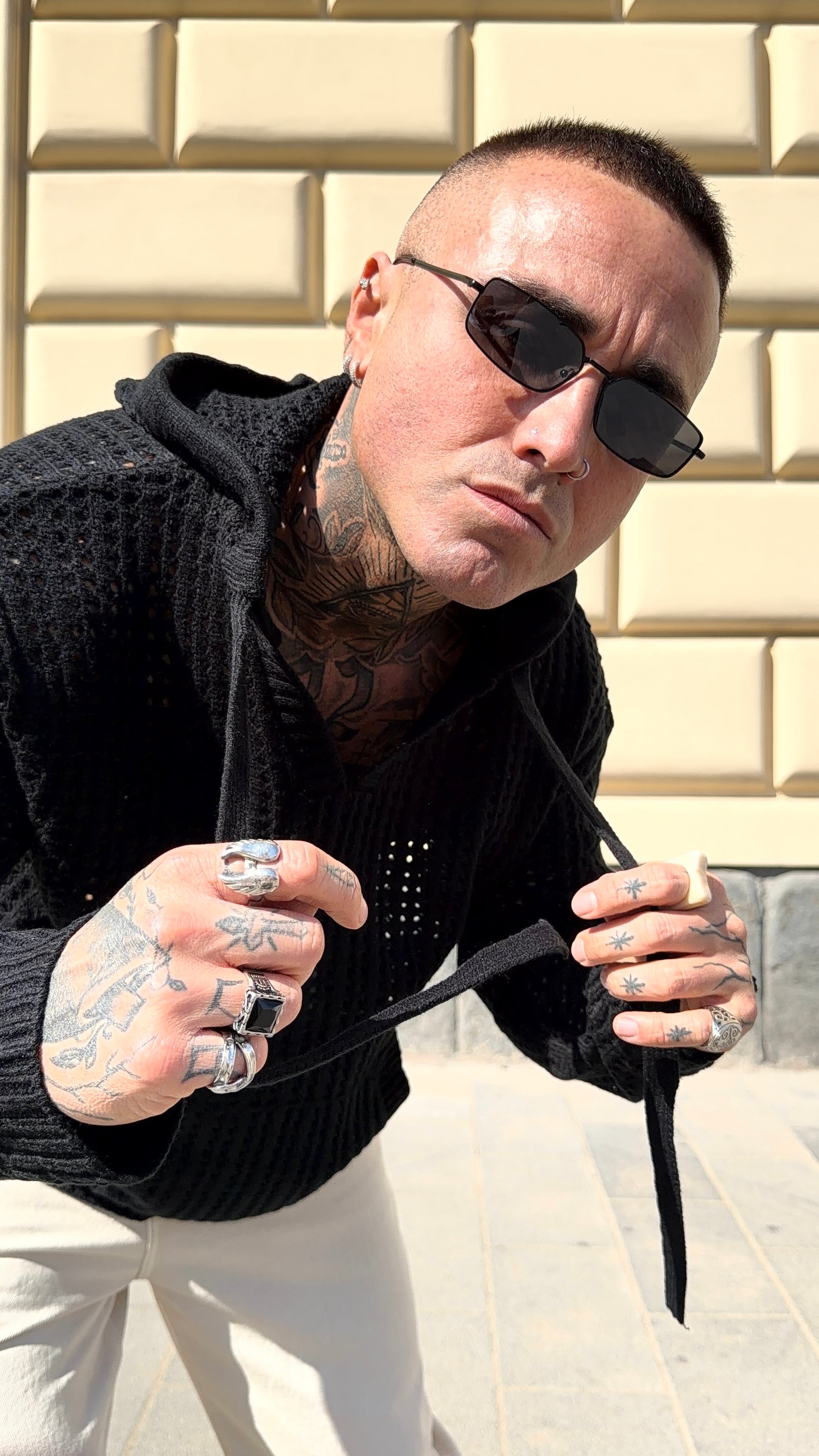 Modello H 1.83 X 85 kg indossa taglia XL. Vestibilità larga. Traforato largo. Cappuccio e laccio regolabile. Misto cotone.