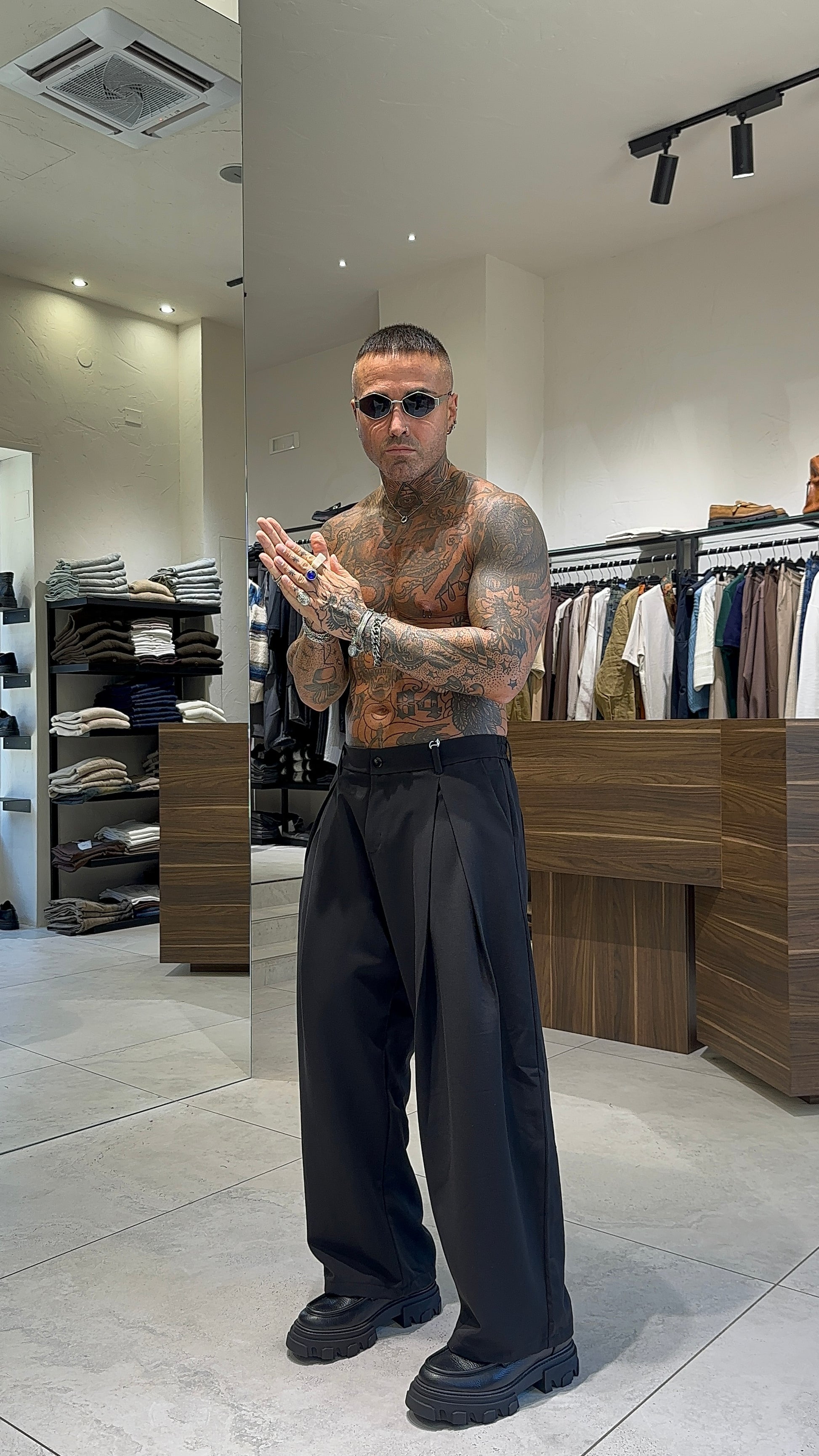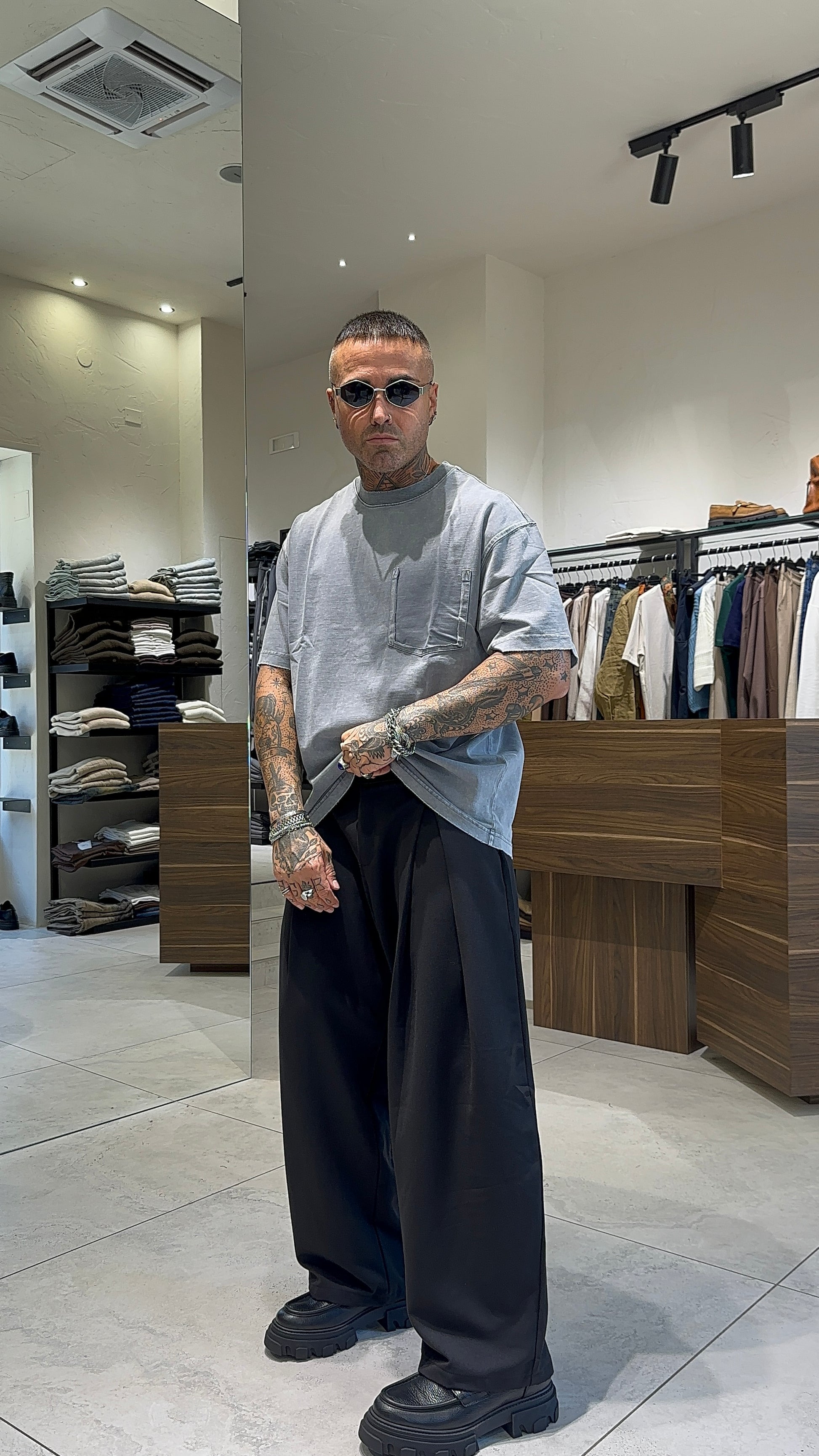 Modello H 1.83 x 85 kg indossa taglia XL. Vestibilità larga. Pence larghe. Gamba ampia.