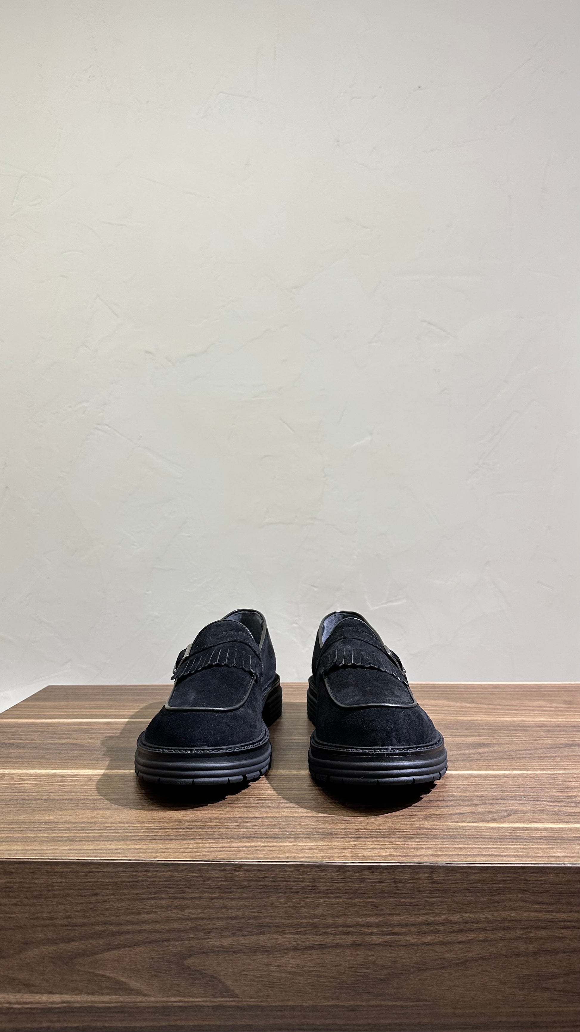 Tessuto camoscio. Punta rotonda. Gomma alta. Tacco largo. Fibbia con cinturino.