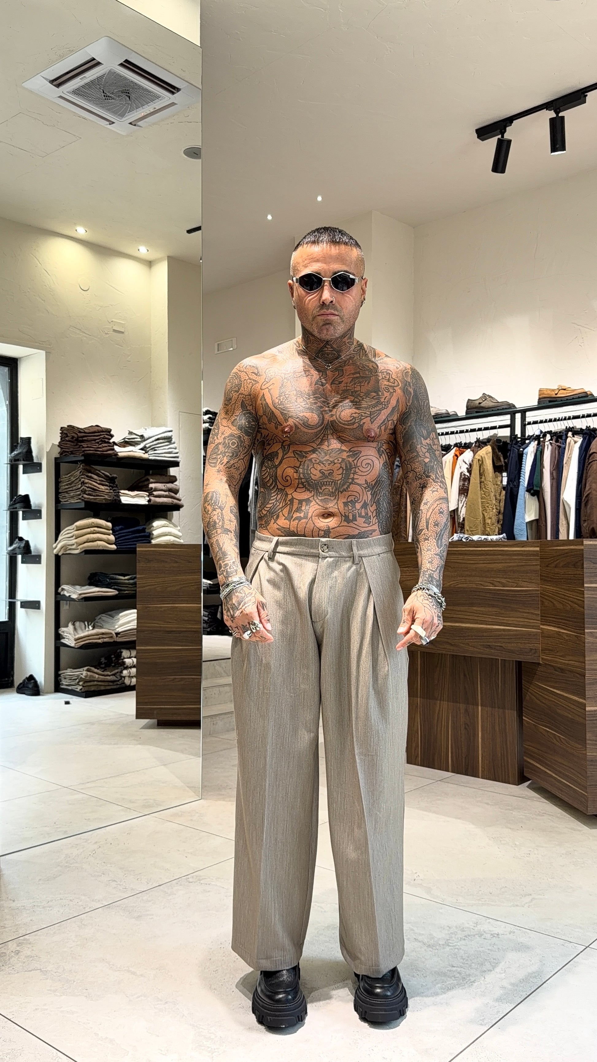 Modello H 1.83 x 85 kg indossa taglia XL. Vestibilità ampia. Pence. Gamba larga. Ampio alla caviglia. Tessuto poliviscosa.
