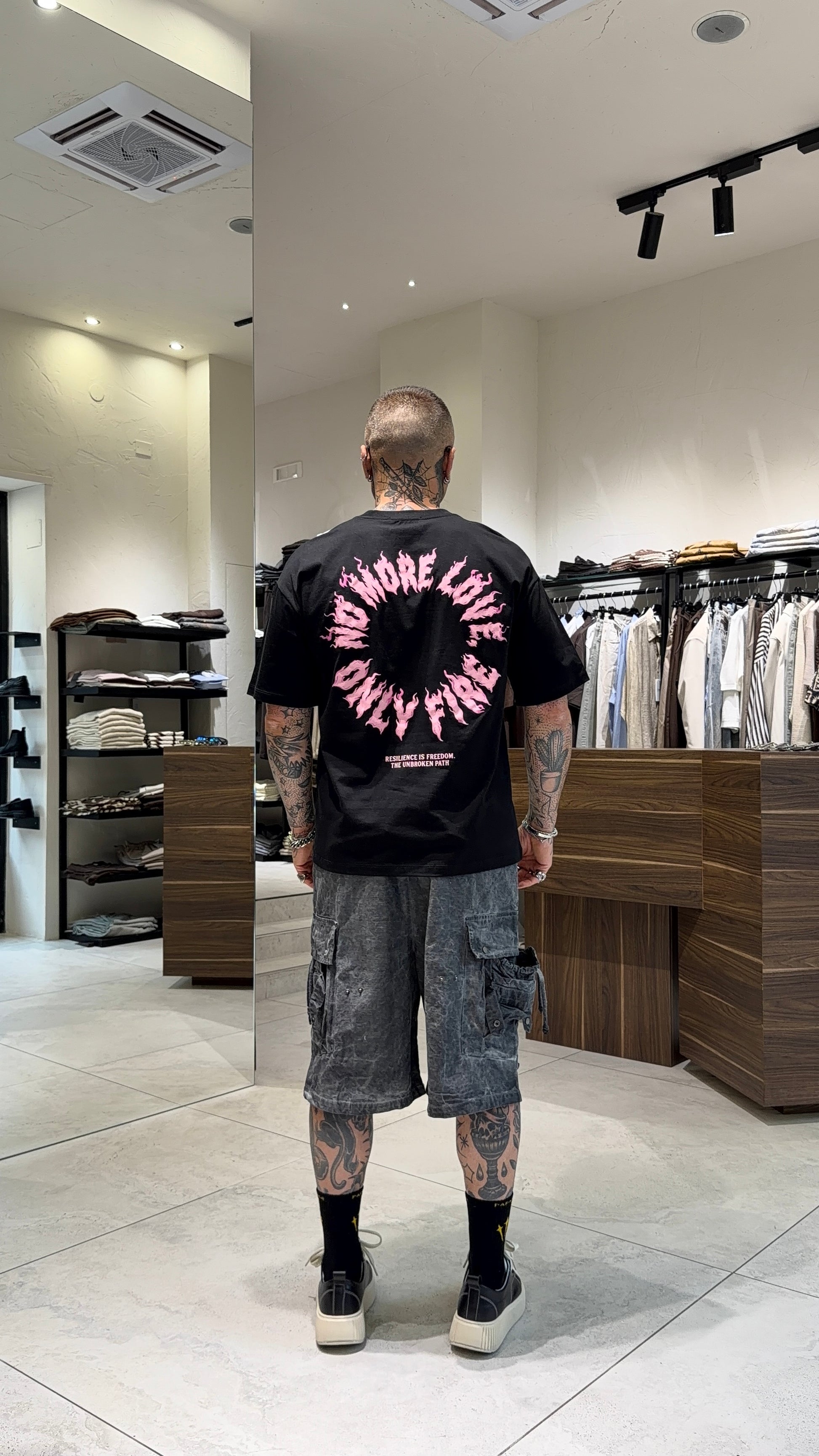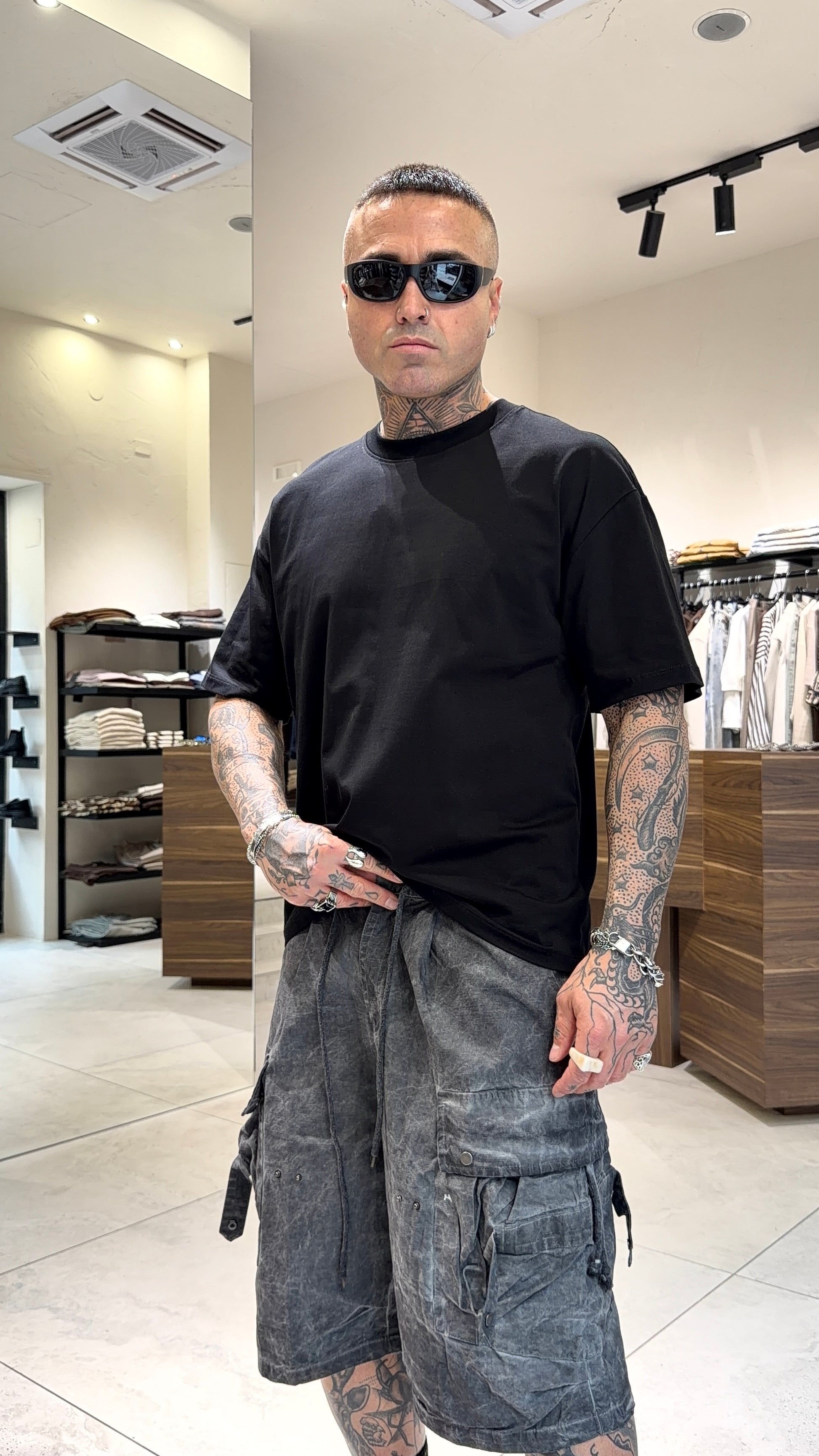 Modello H 1.83 X 85 kg indossa taglia XL. Vestibilità larga. Stampa frontale. Cotone.