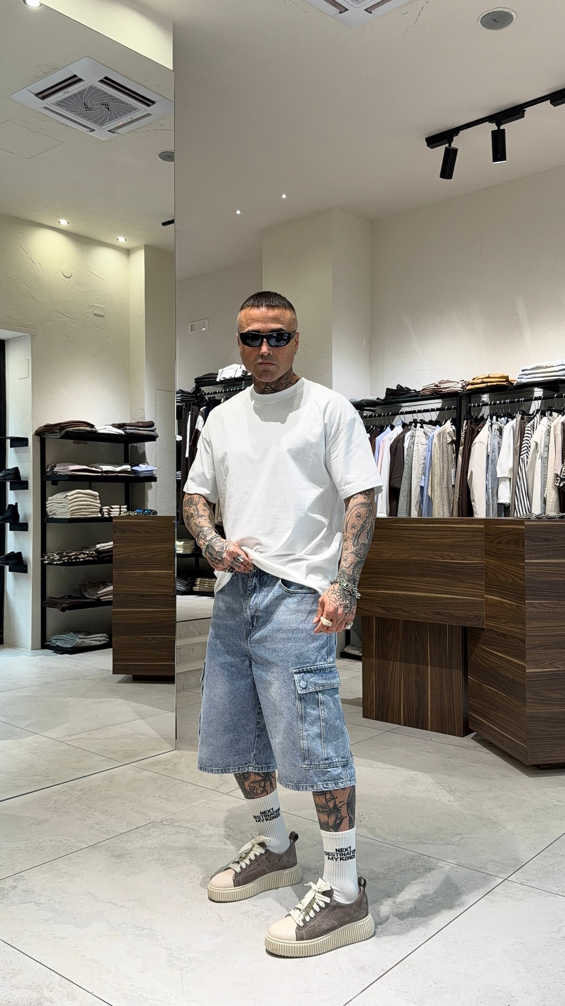 Modello H 1.83 X 85 kg indossa taglia XL. Vestibilità larga. Stampa frontale. Cotone.
