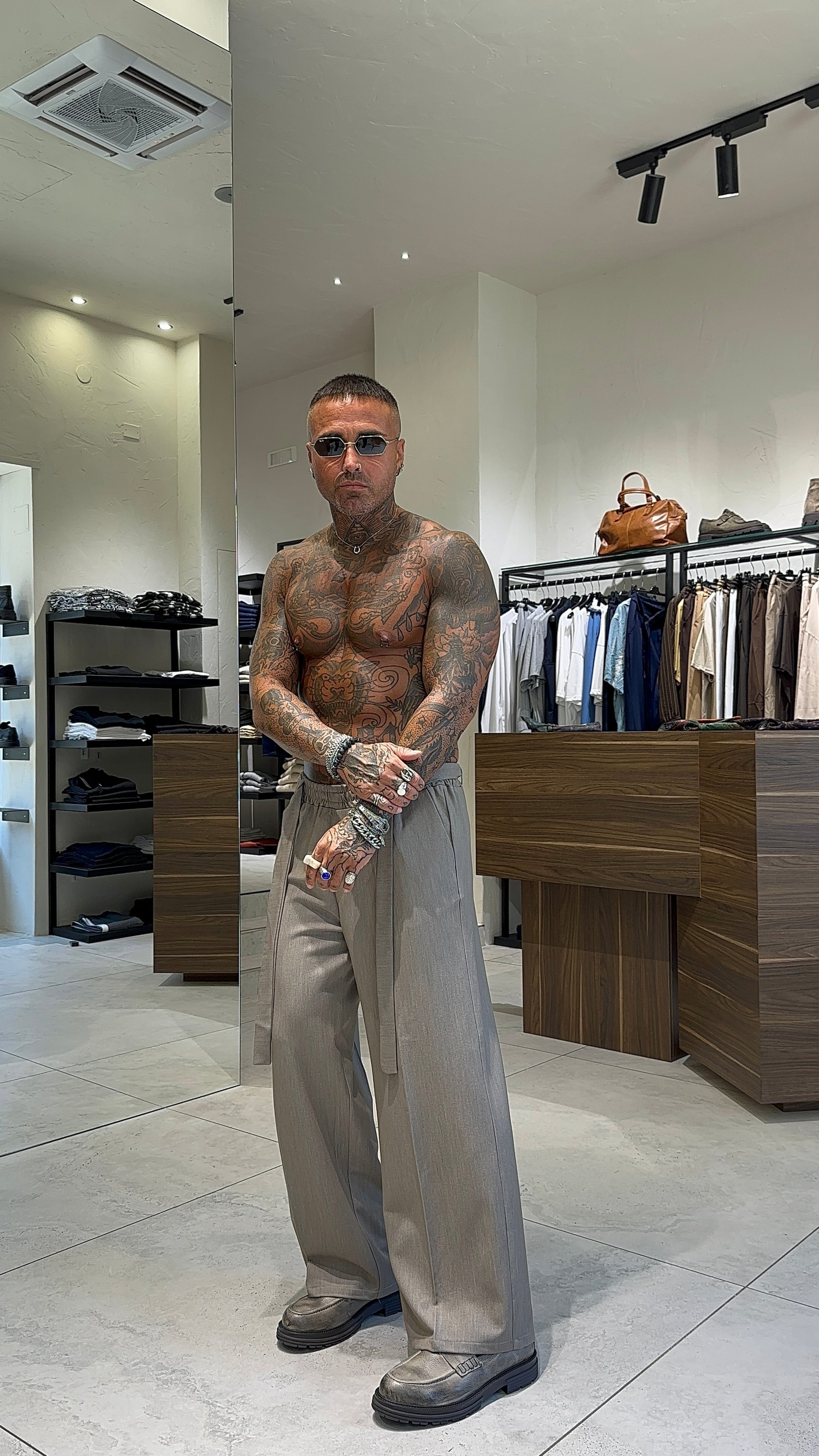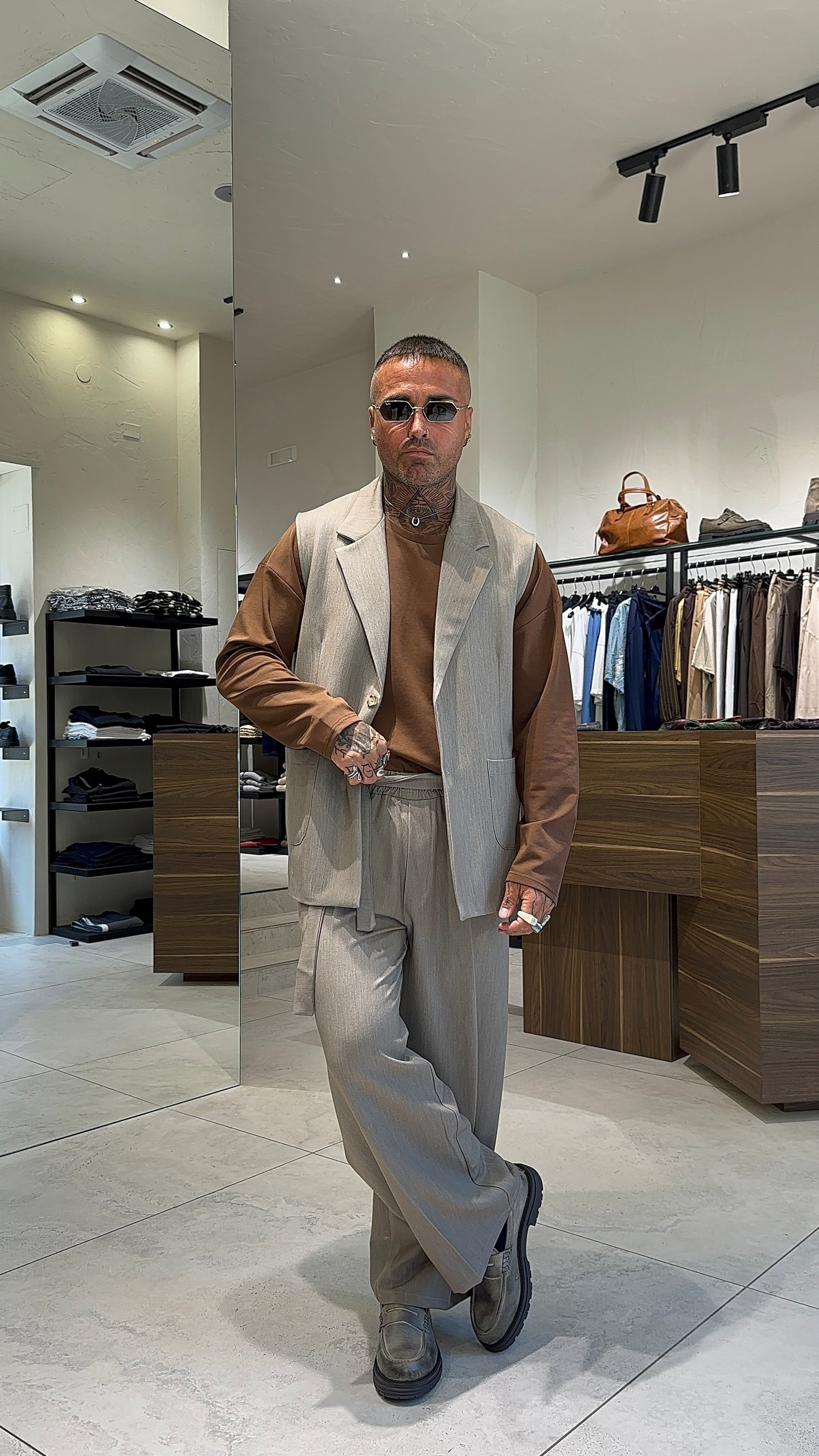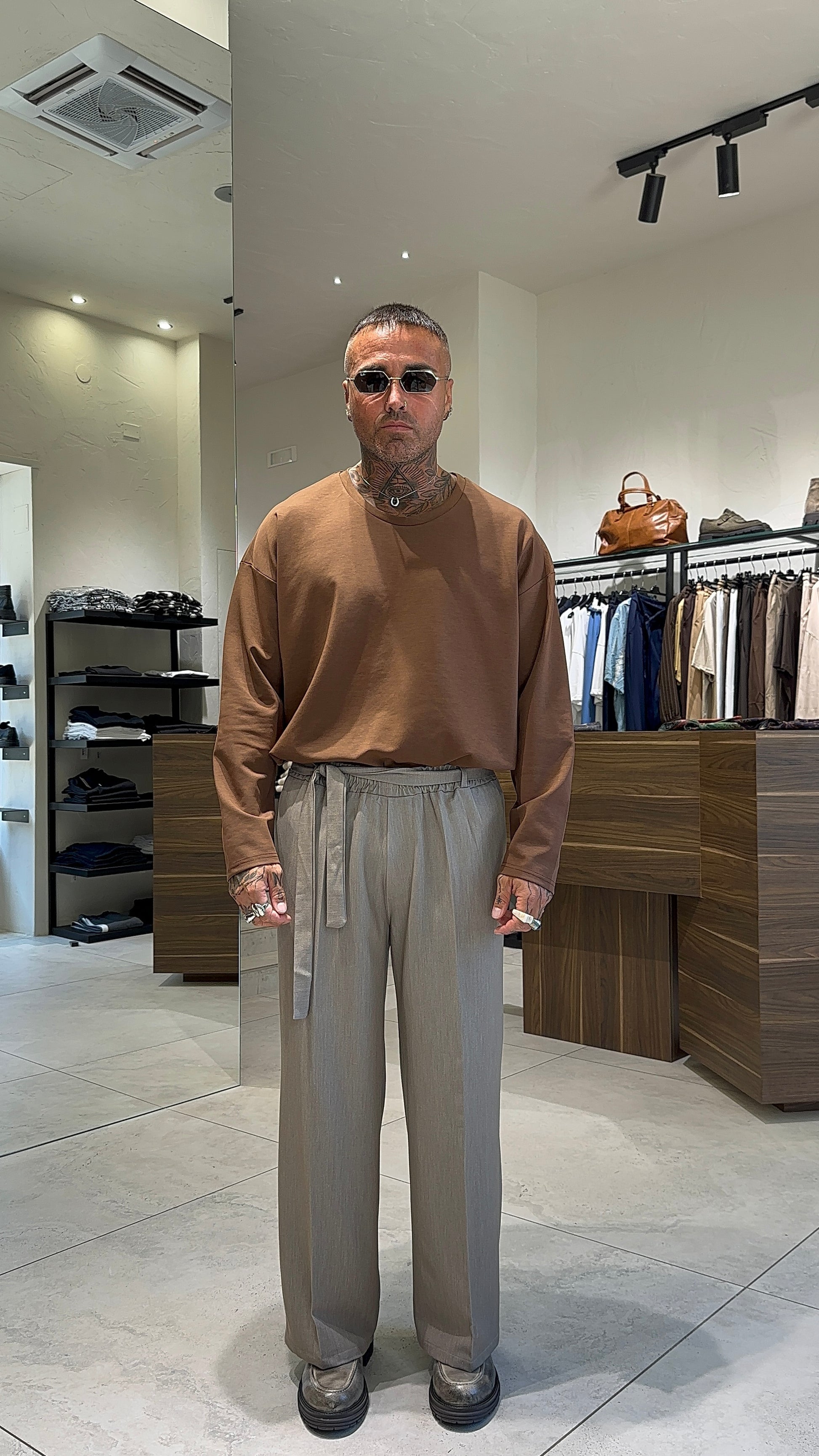 Modello H 1.83 x 85 kg indossa taglia XL. Vestibilità ampia. Cintura removibile nei passanti. Gamba larga. Girovita elastico. Ampio alla caviglia. Tessuto poliviscosa.