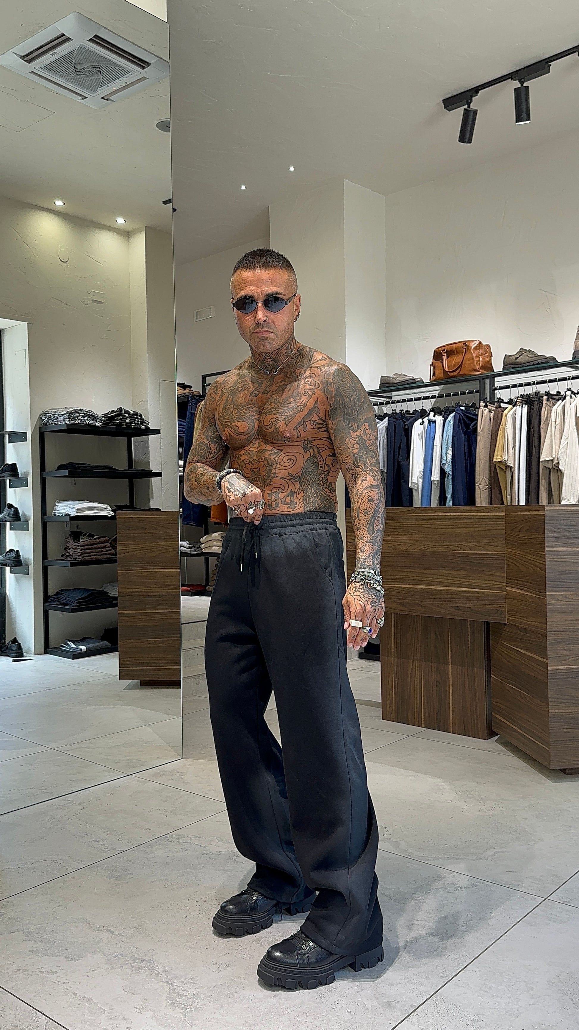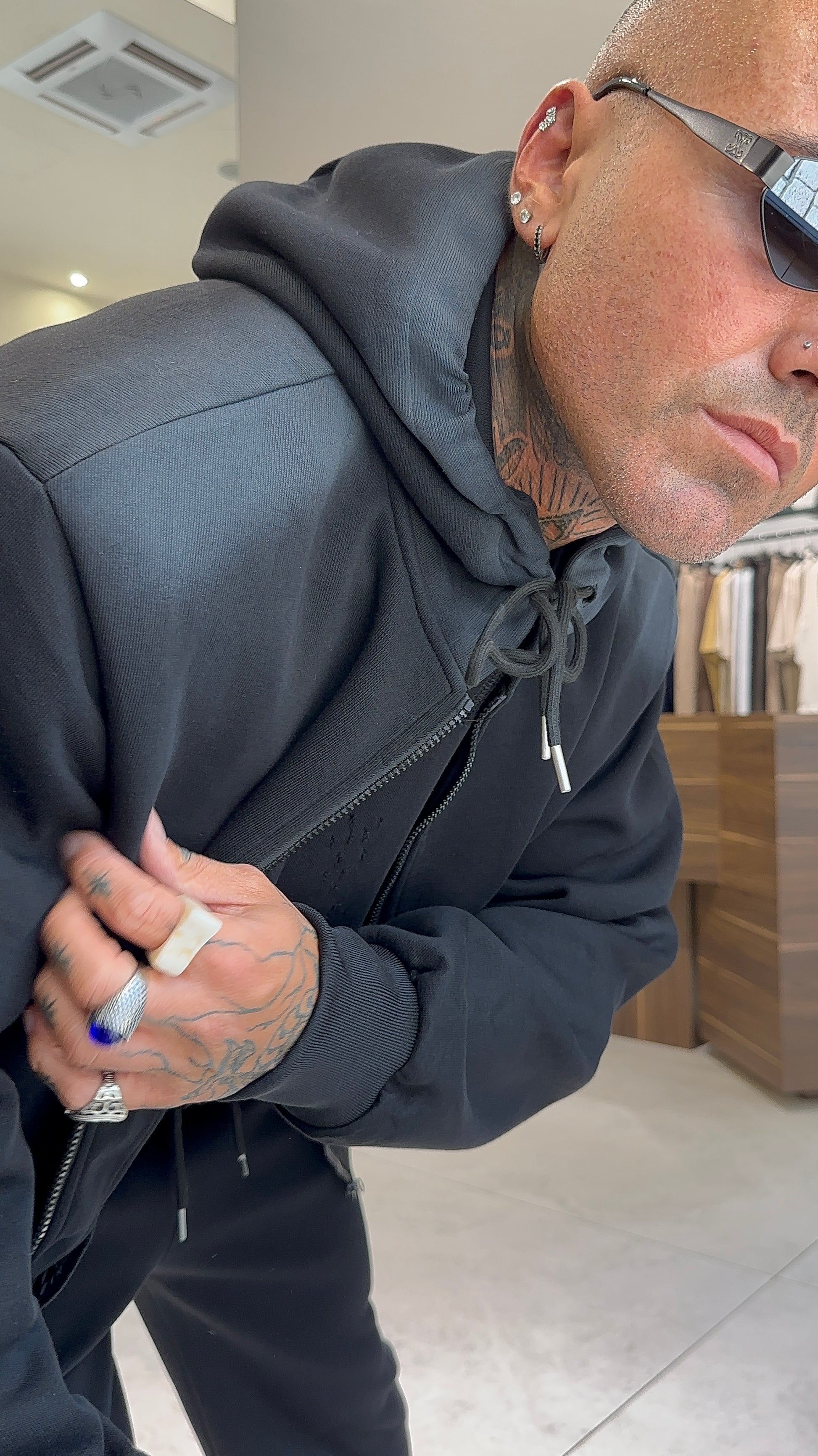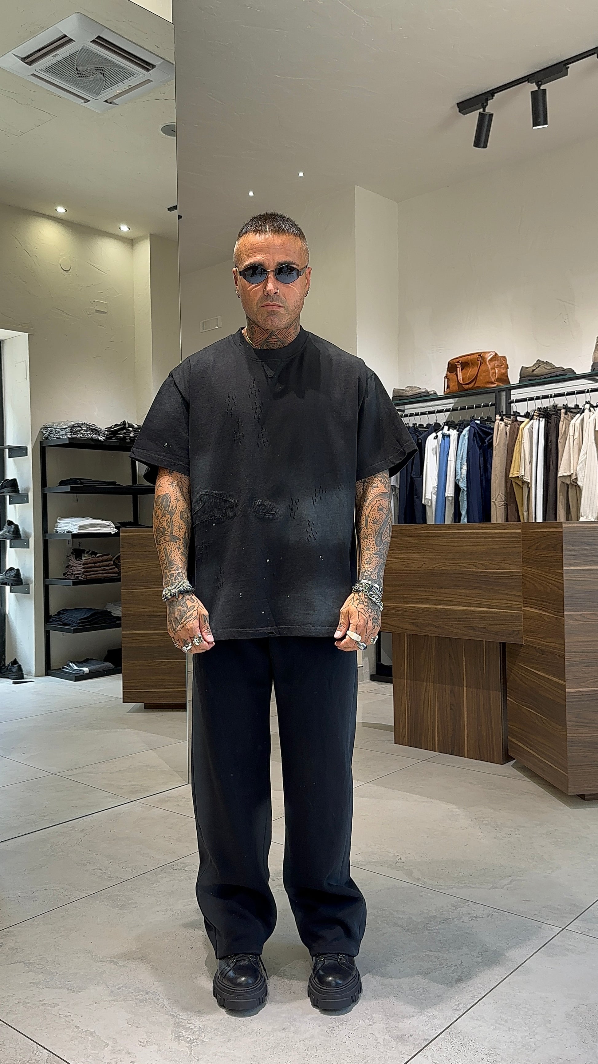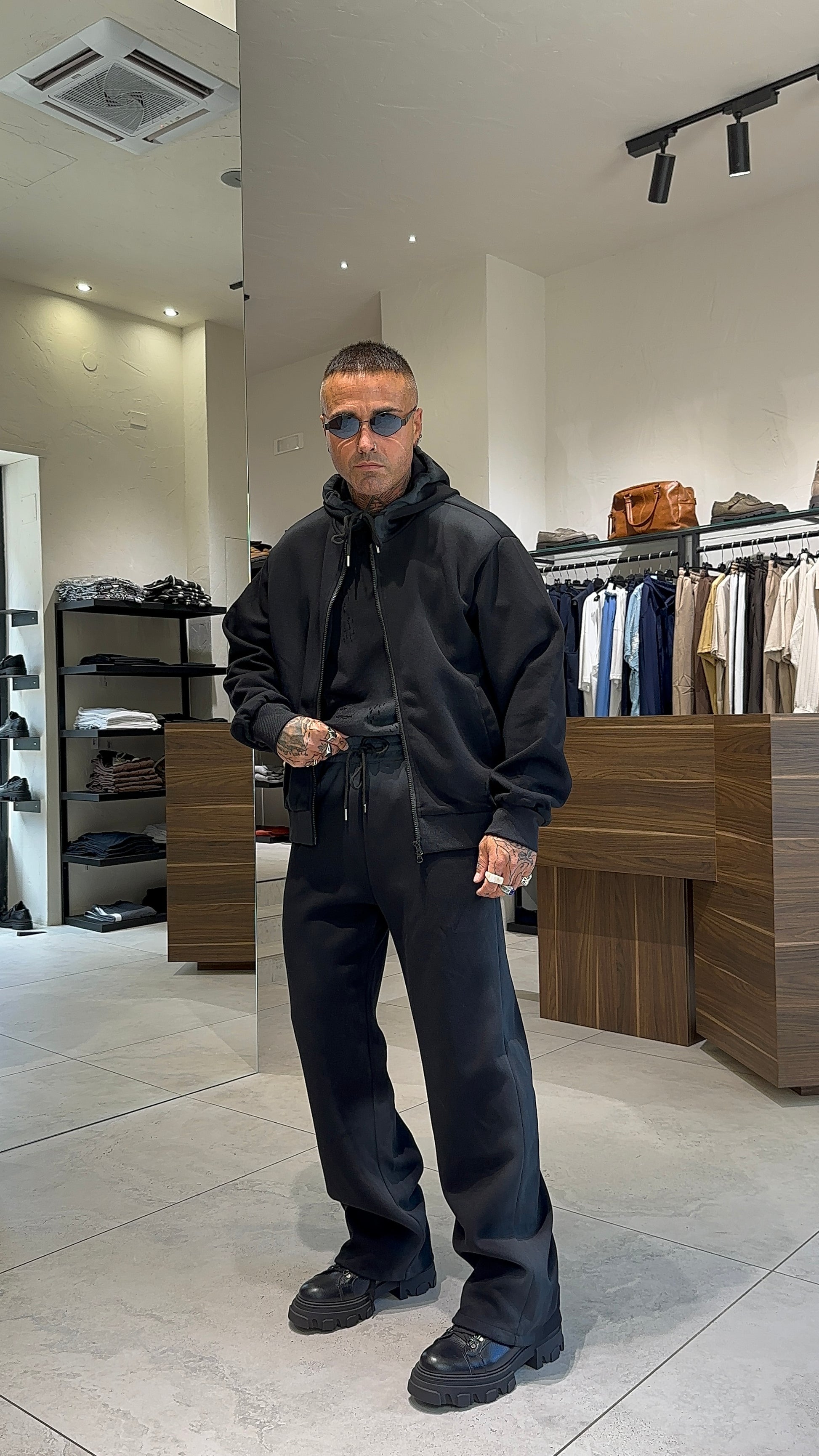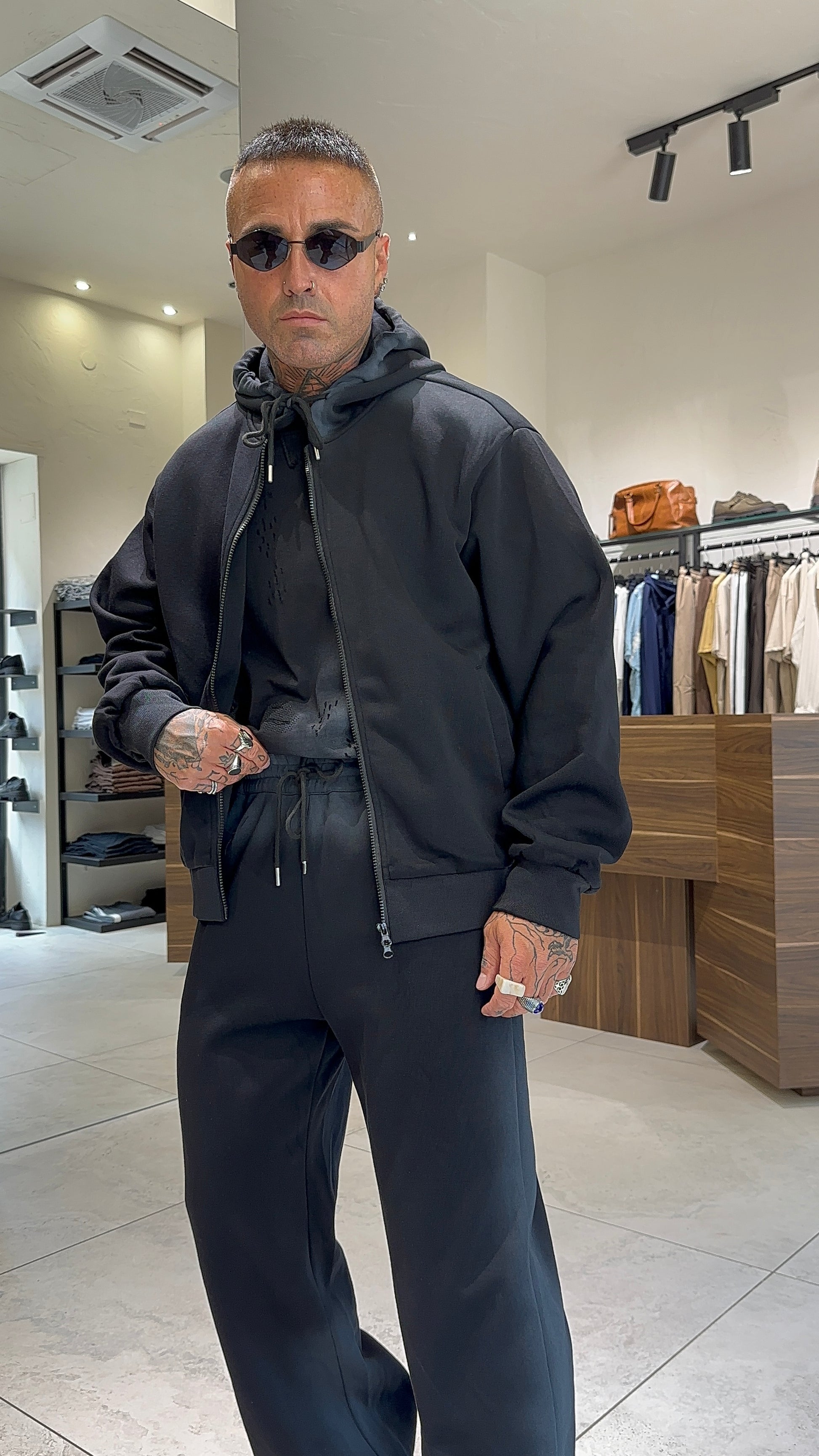 Modello H 1.83 x 85 kg indossa taglia XL. Vestibilità over. Felpa con chiusura zip, tasche, abrasioni, cappuccio. Pantalone con laccio regolabile in vita, gamba ampia, abrasioni, sfumature. Tessuto poliestere.
