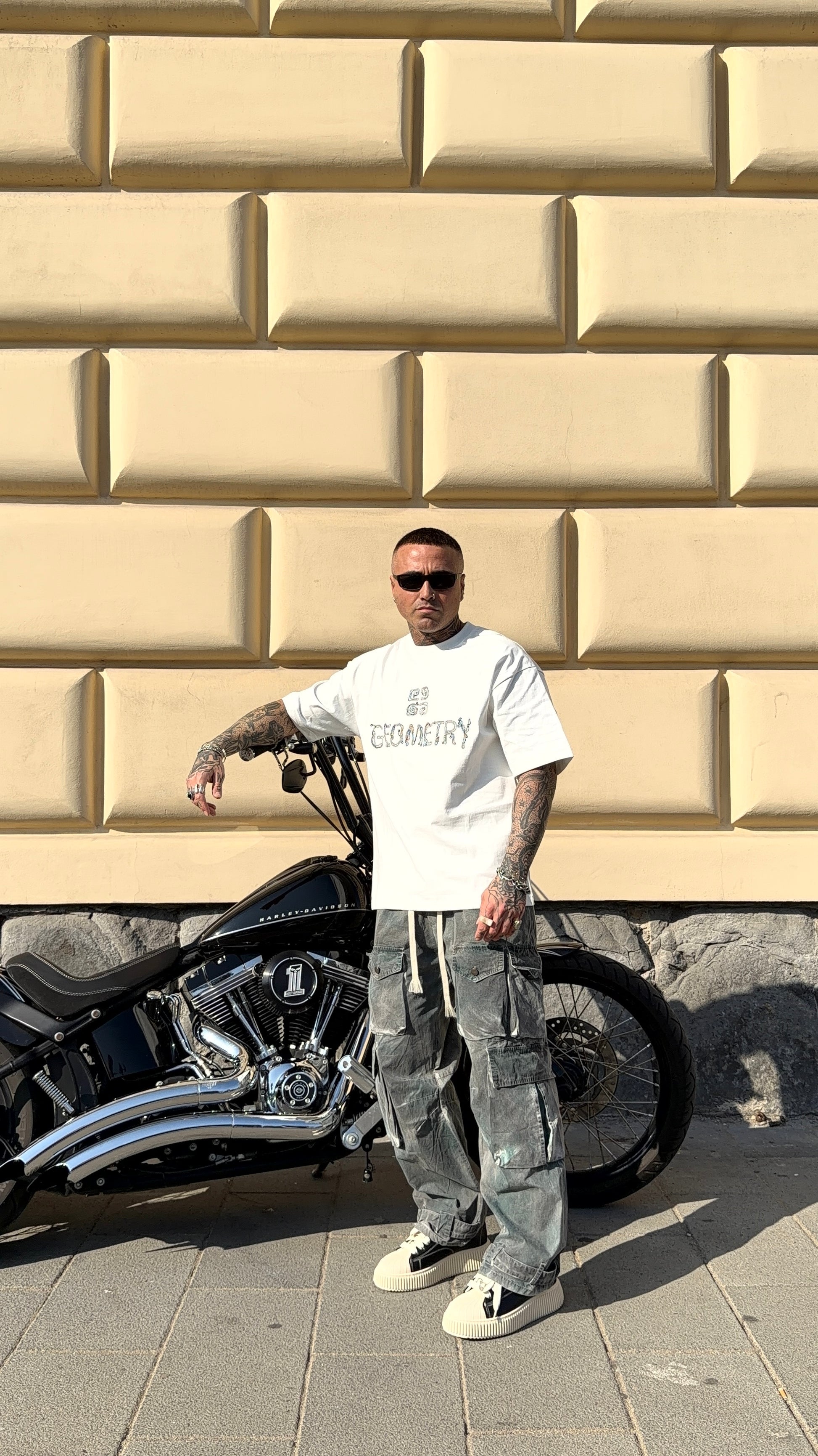 Modello H 1.83 X 85 kg indossa XL. Vestibilità over. Stampa ricamata fronte e retro. Cotone.