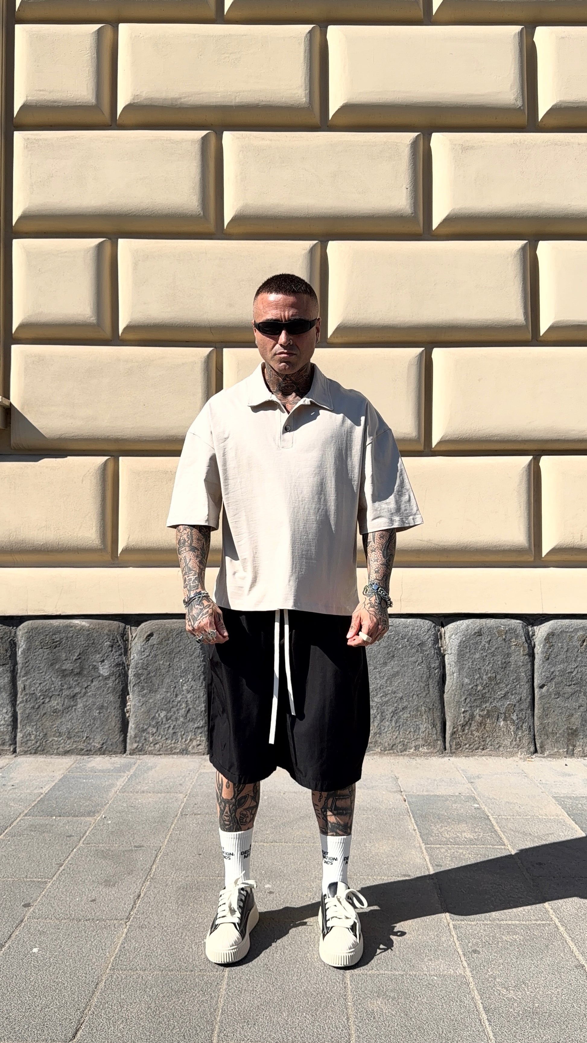 Modello H 1.83 X 85 kg indossa taglia L. Vestibilità corta e larga. Collo con bottoni. 100% cotone.