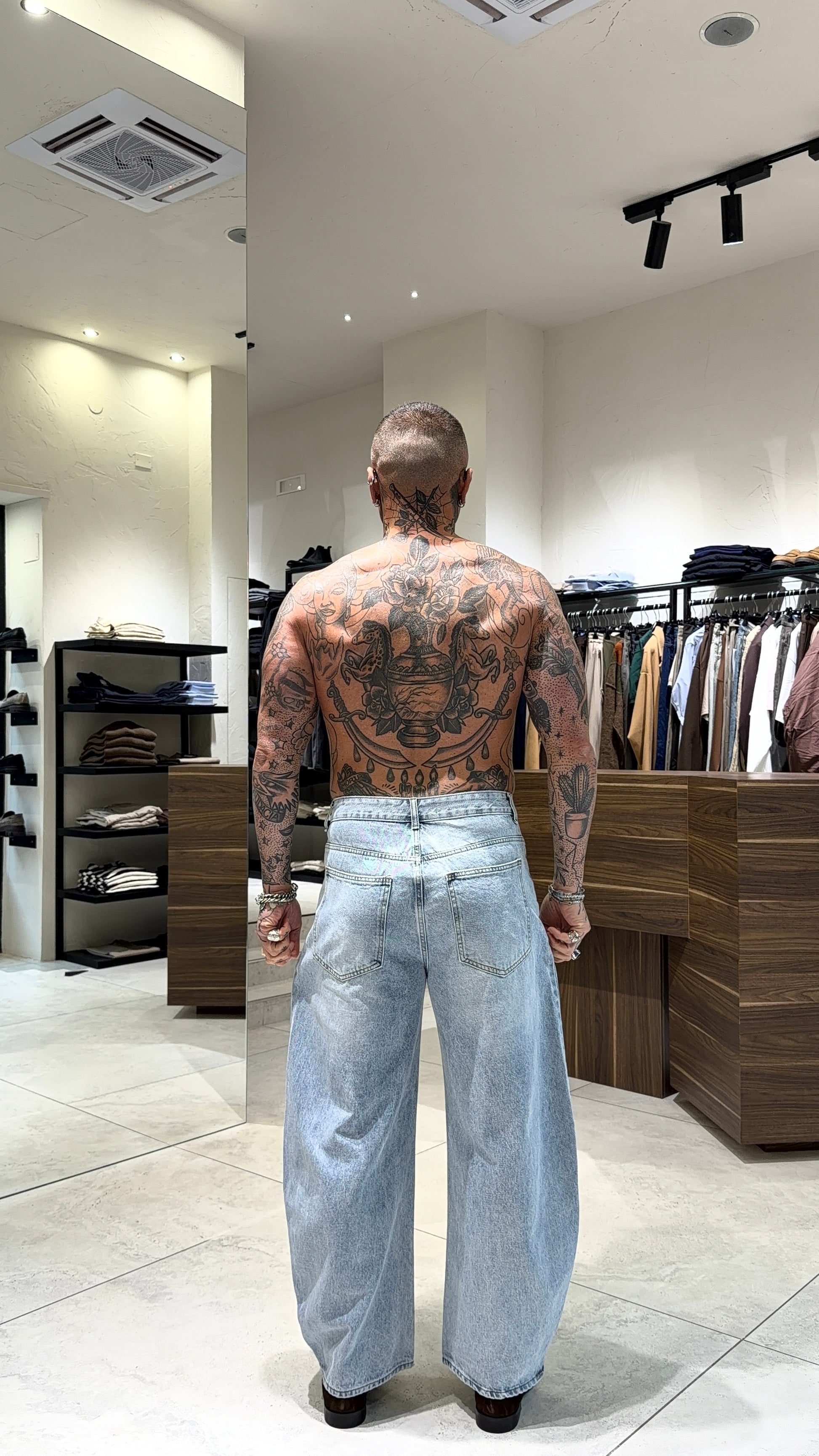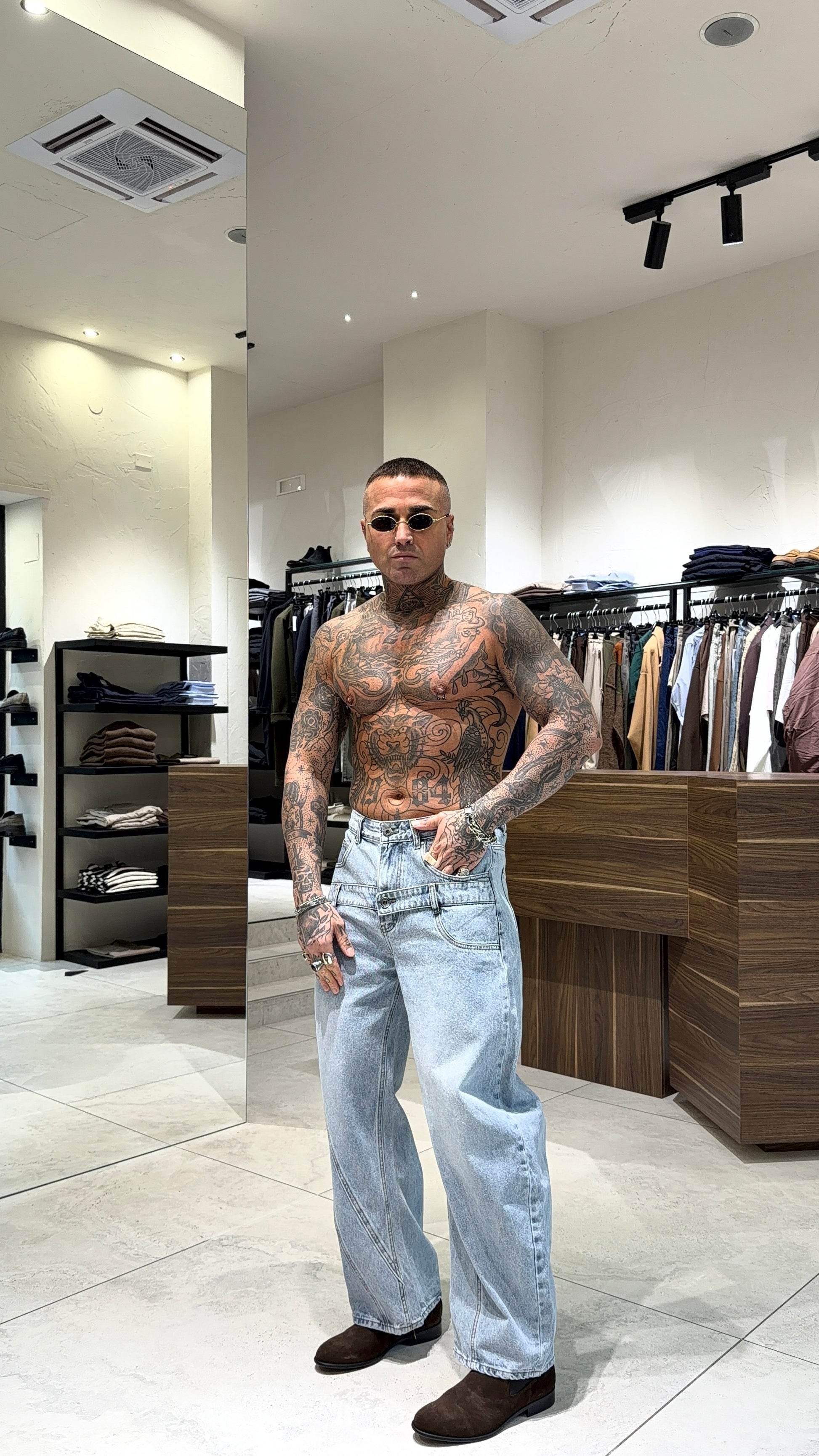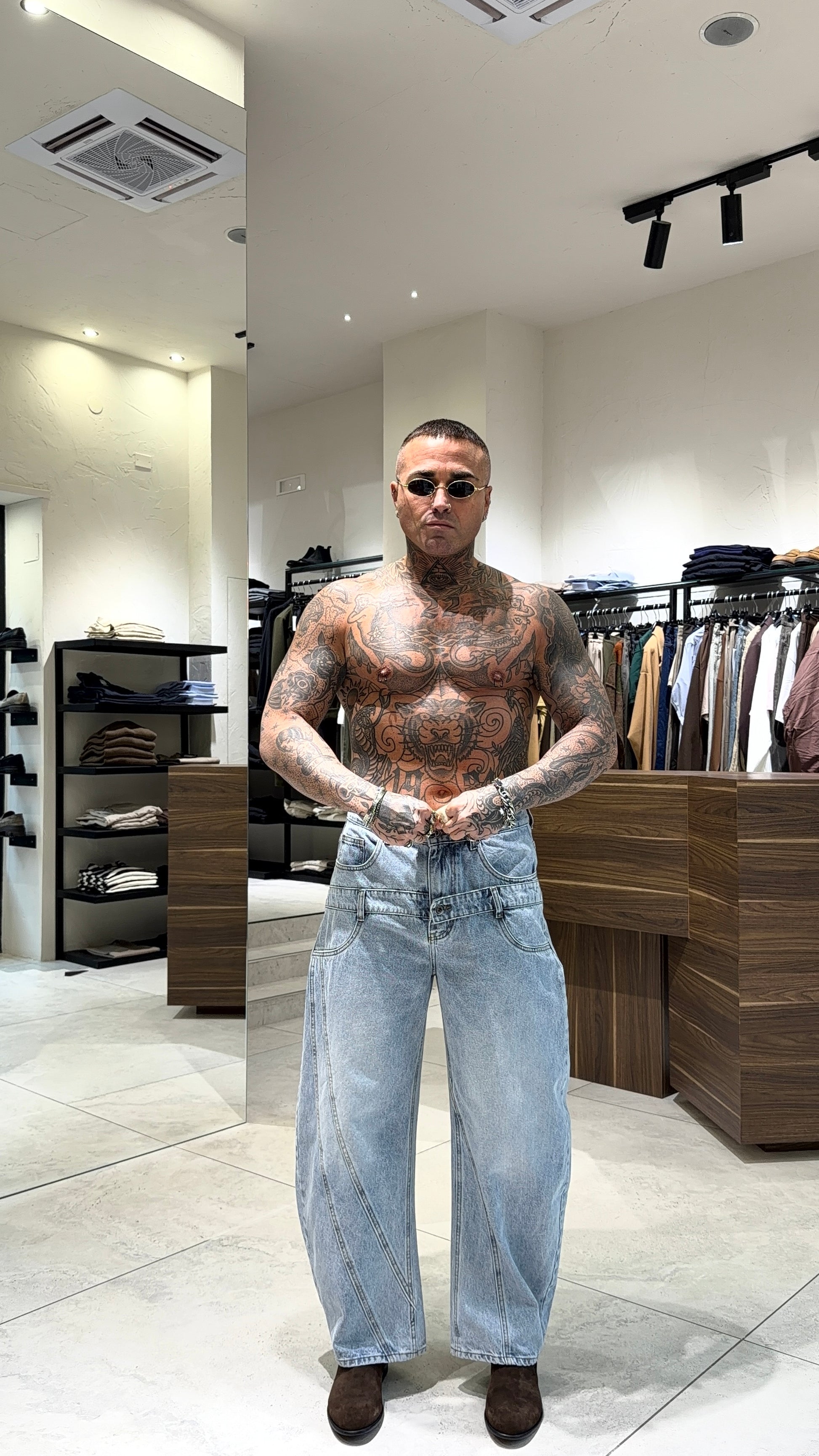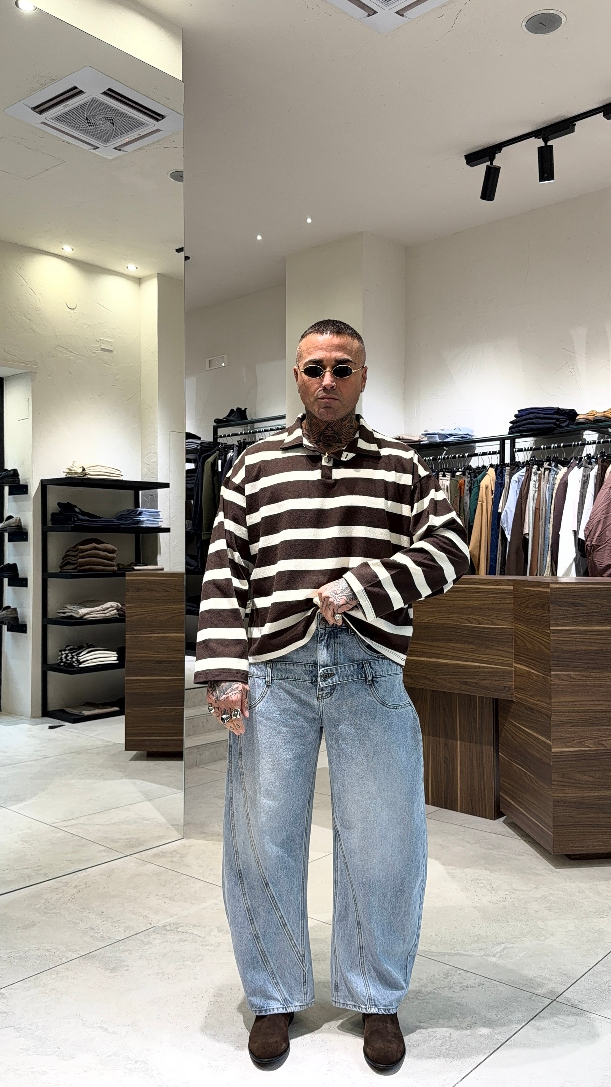 Modello H 1.83 x 85 kg indossa taglia 48. Vestibilità larga. Gamba ampia.