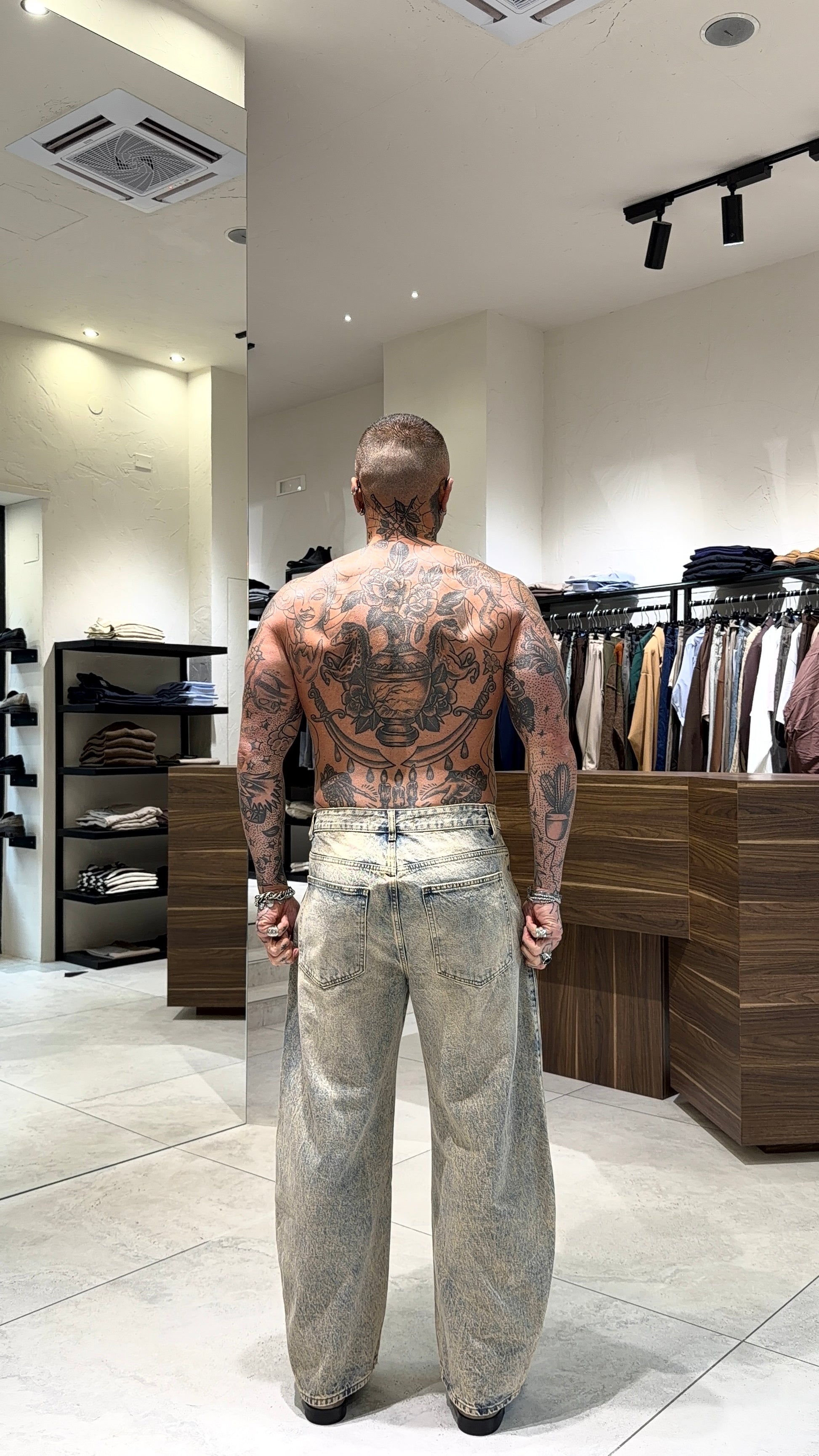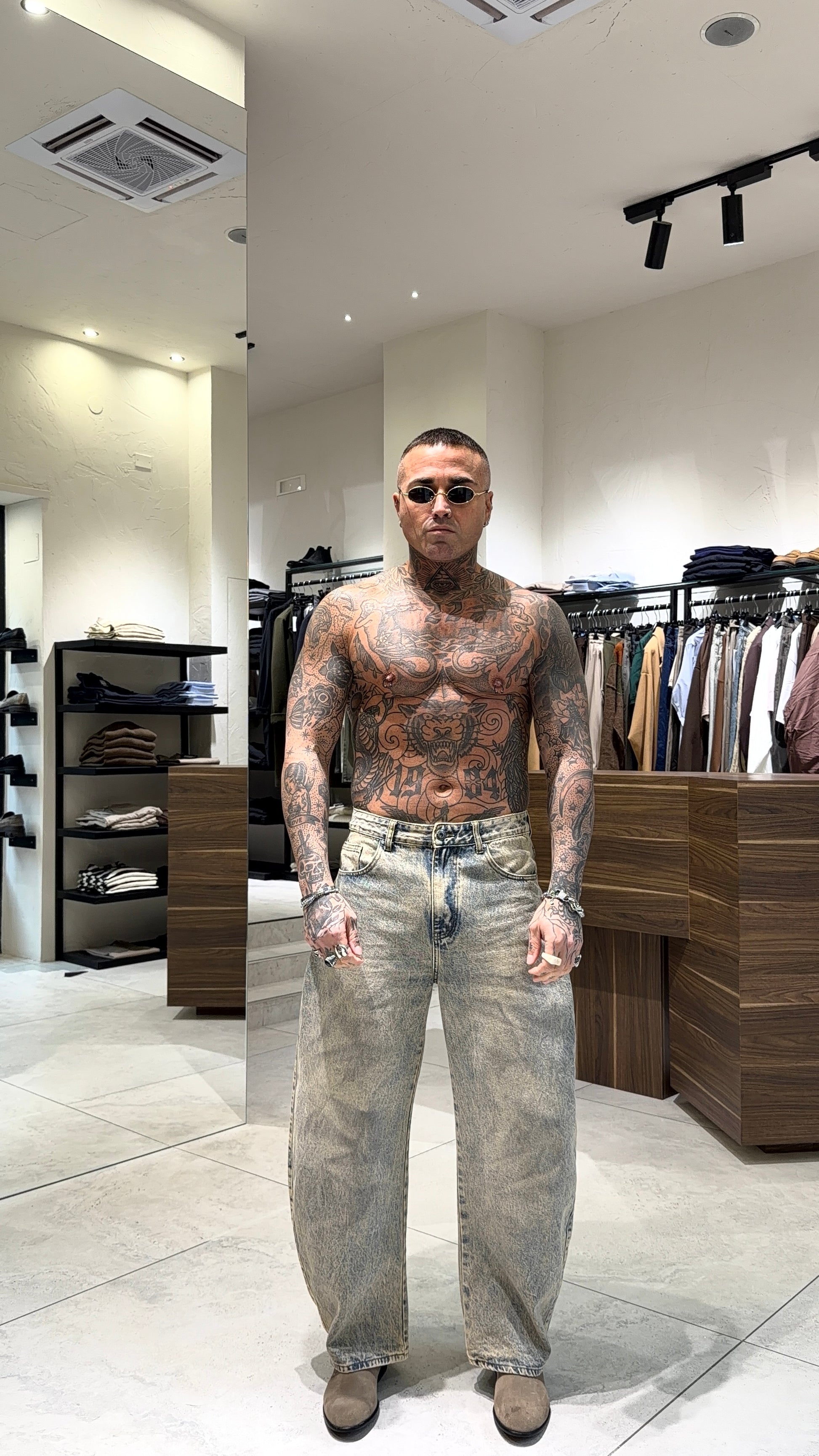 Modello H 1.83 x 85 kg indossa taglia 48. Vestibilità larga. Gamba ampia.