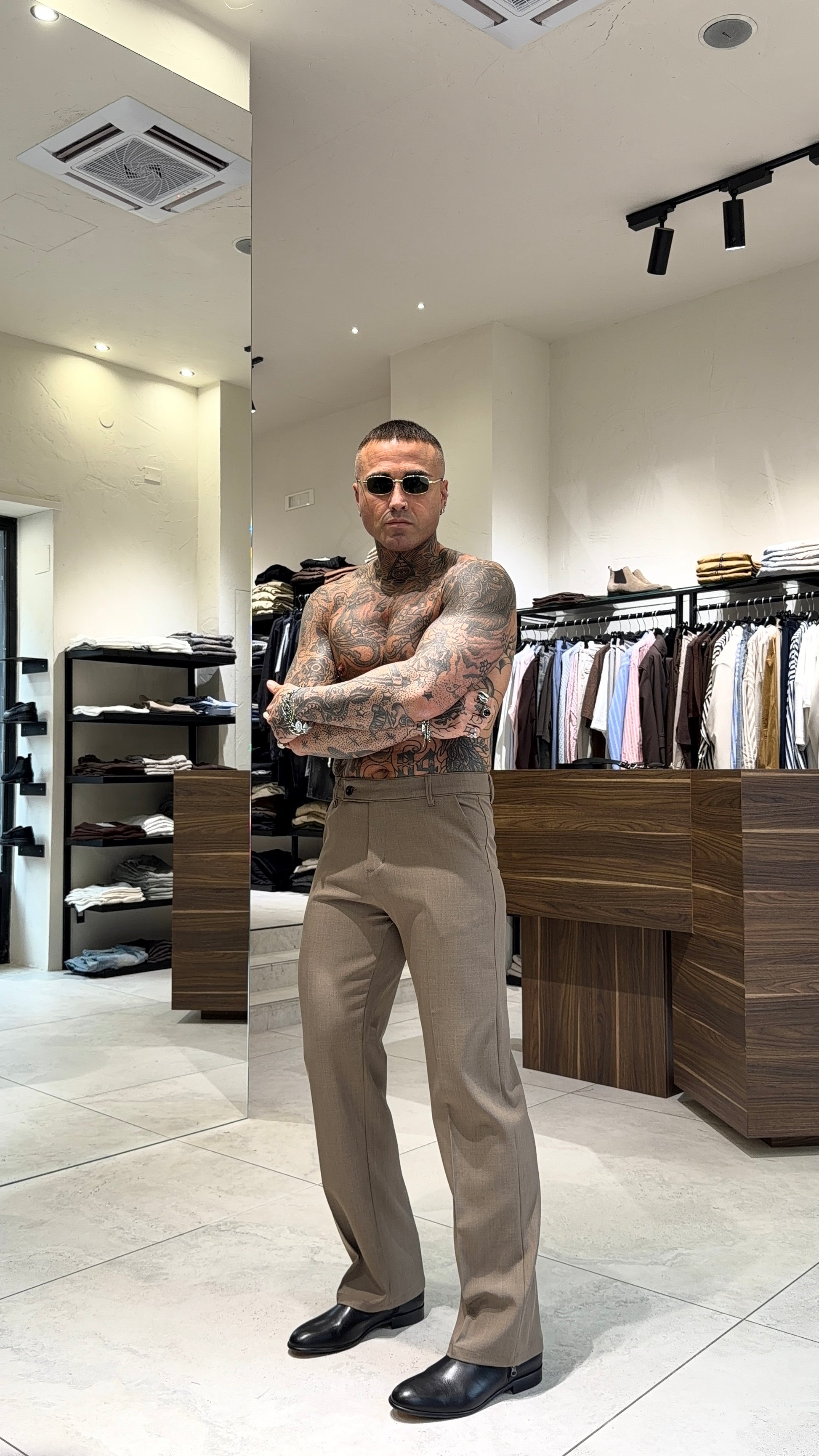 Modello H 1.83 X 85 kg indossa taglia L. Vestibilità gamba semi larga. Chiusura bottone laterale. Poliviscosa.