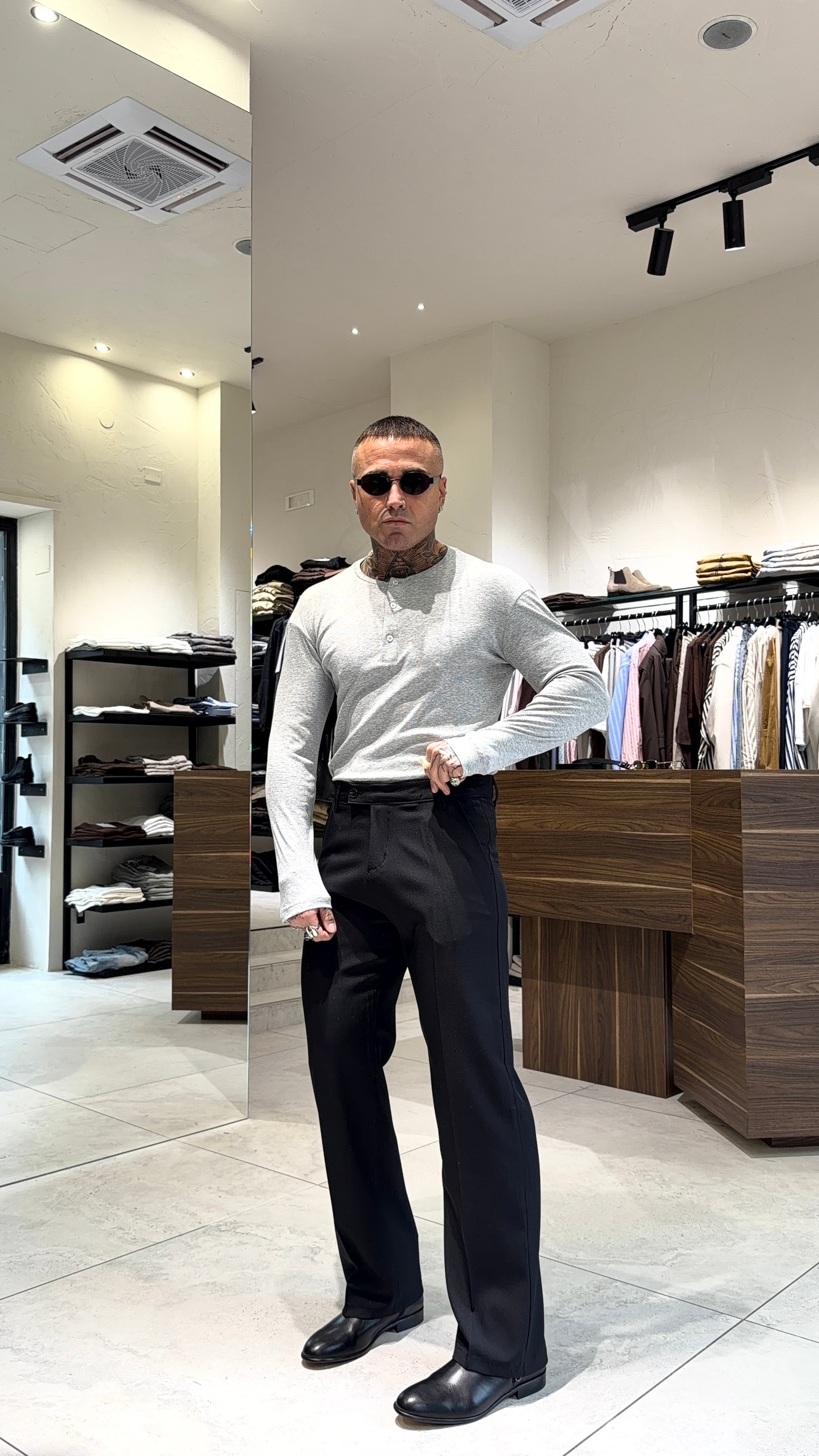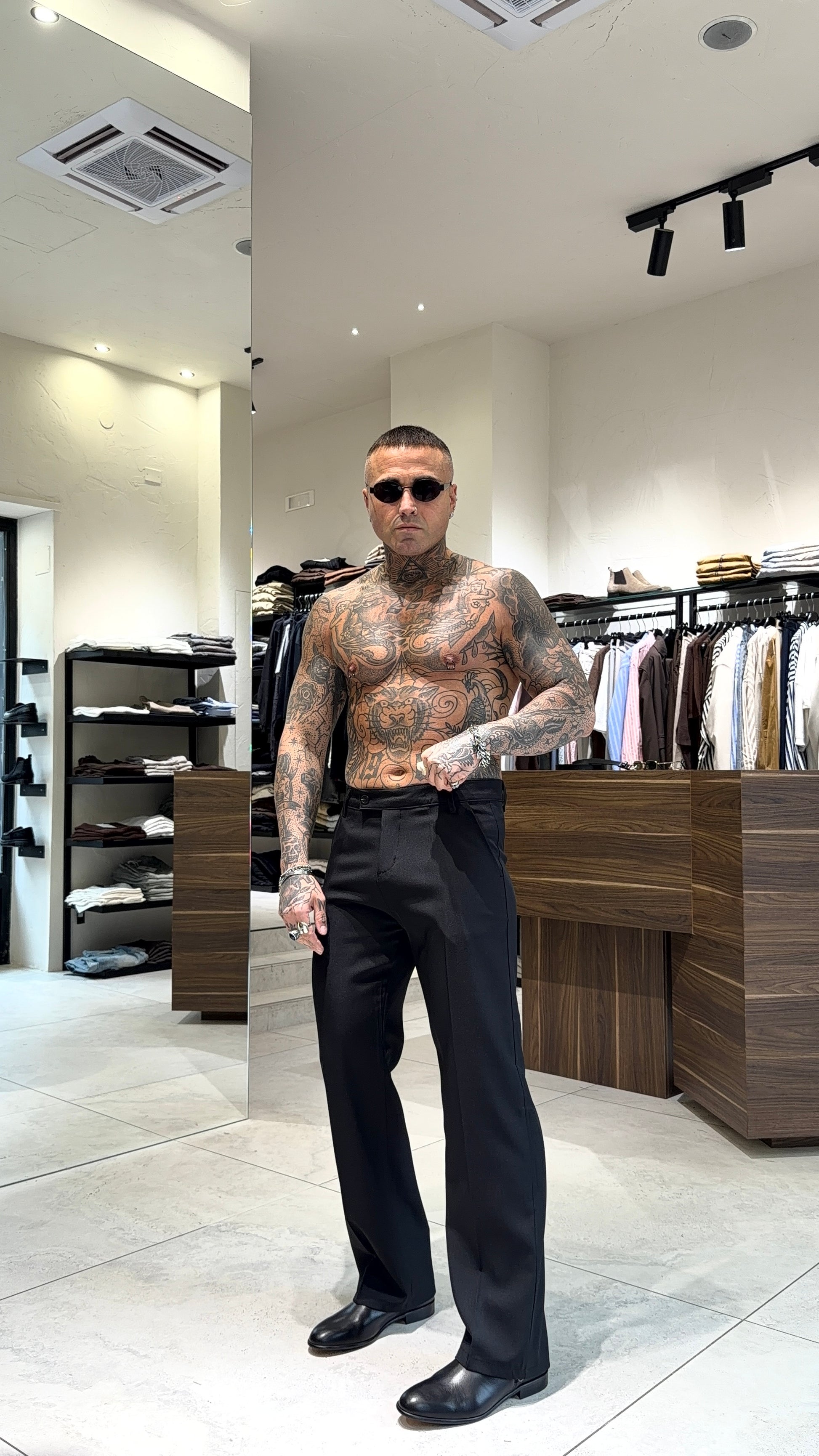 Modello H 1.83 X 85 kg indossa taglia L. Vestibilità gamba semi larga. Chiusura bottone laterale. Poliviscosa.