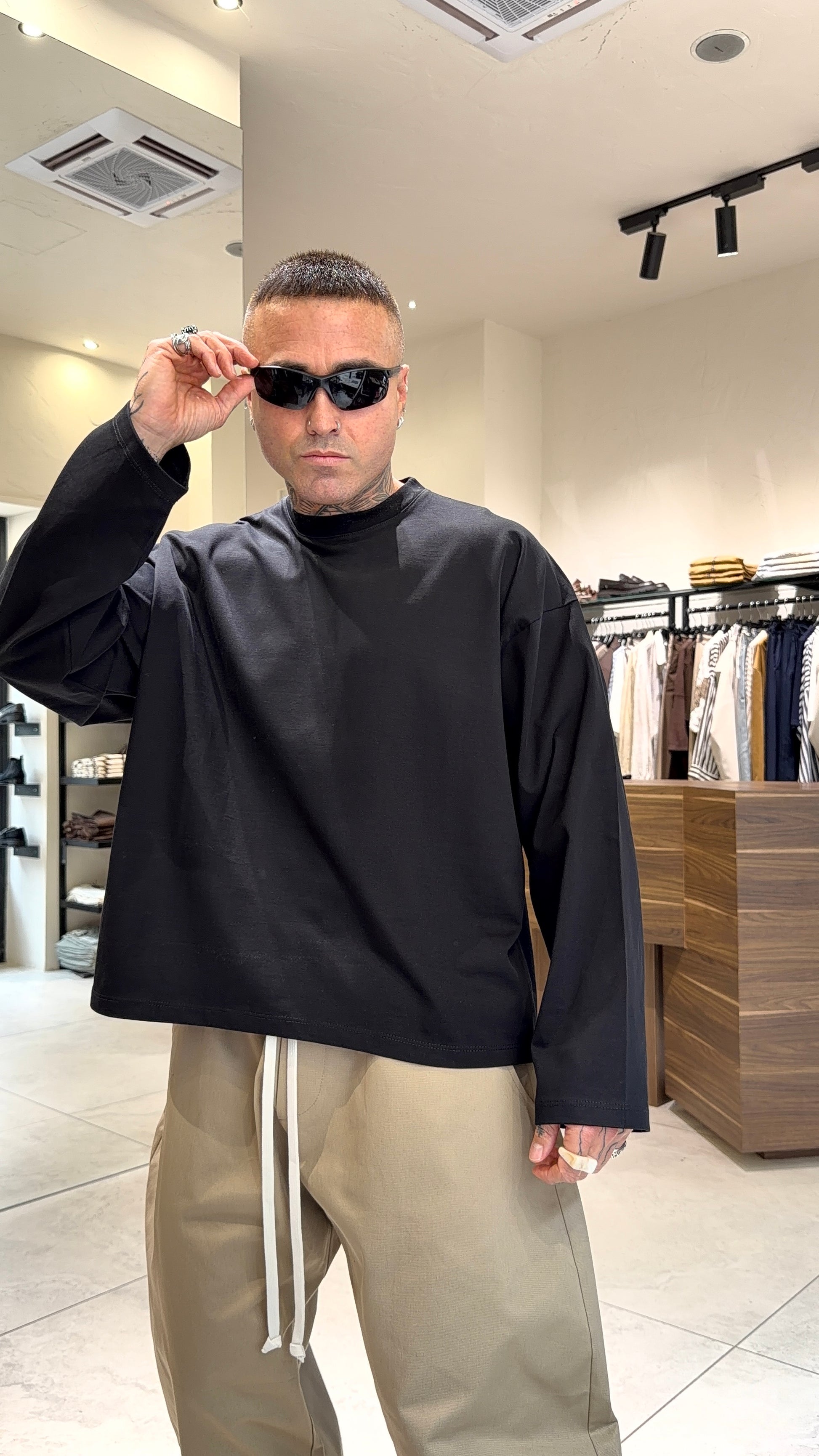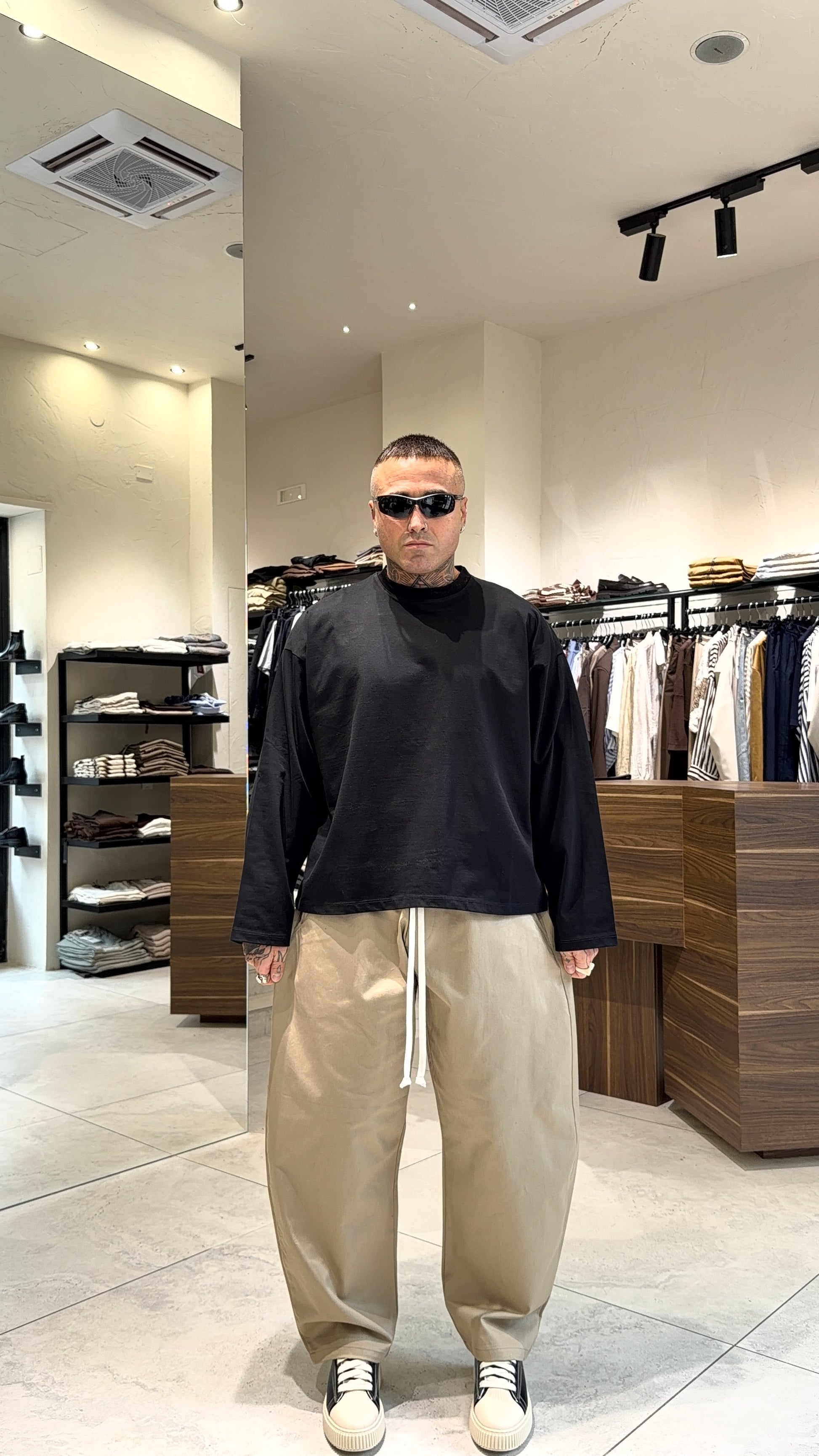 Modello H 1.83 X 85 kg indossa taglia L. Vestibilità corta over. Manica larga. Tessuto cotone.