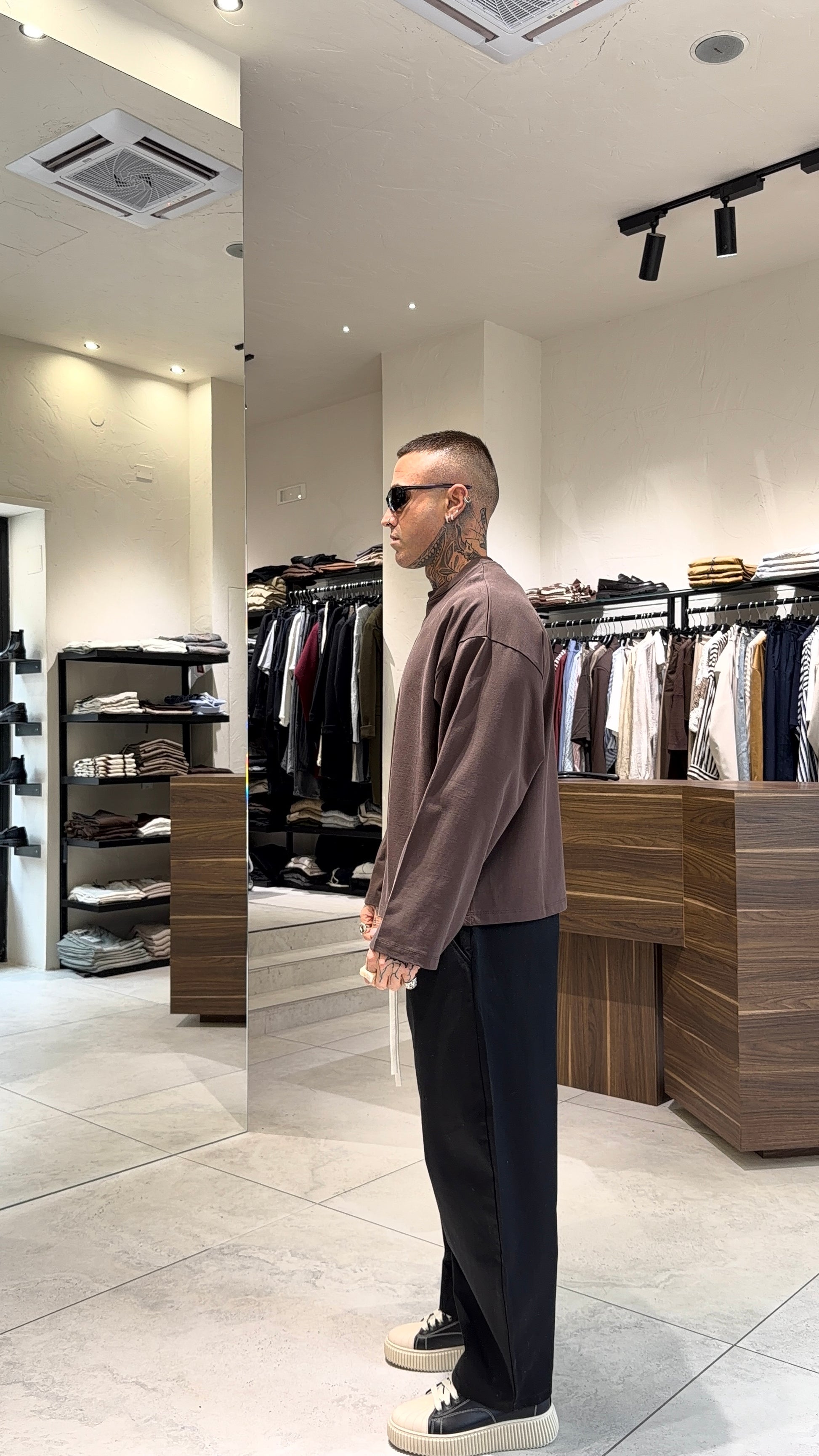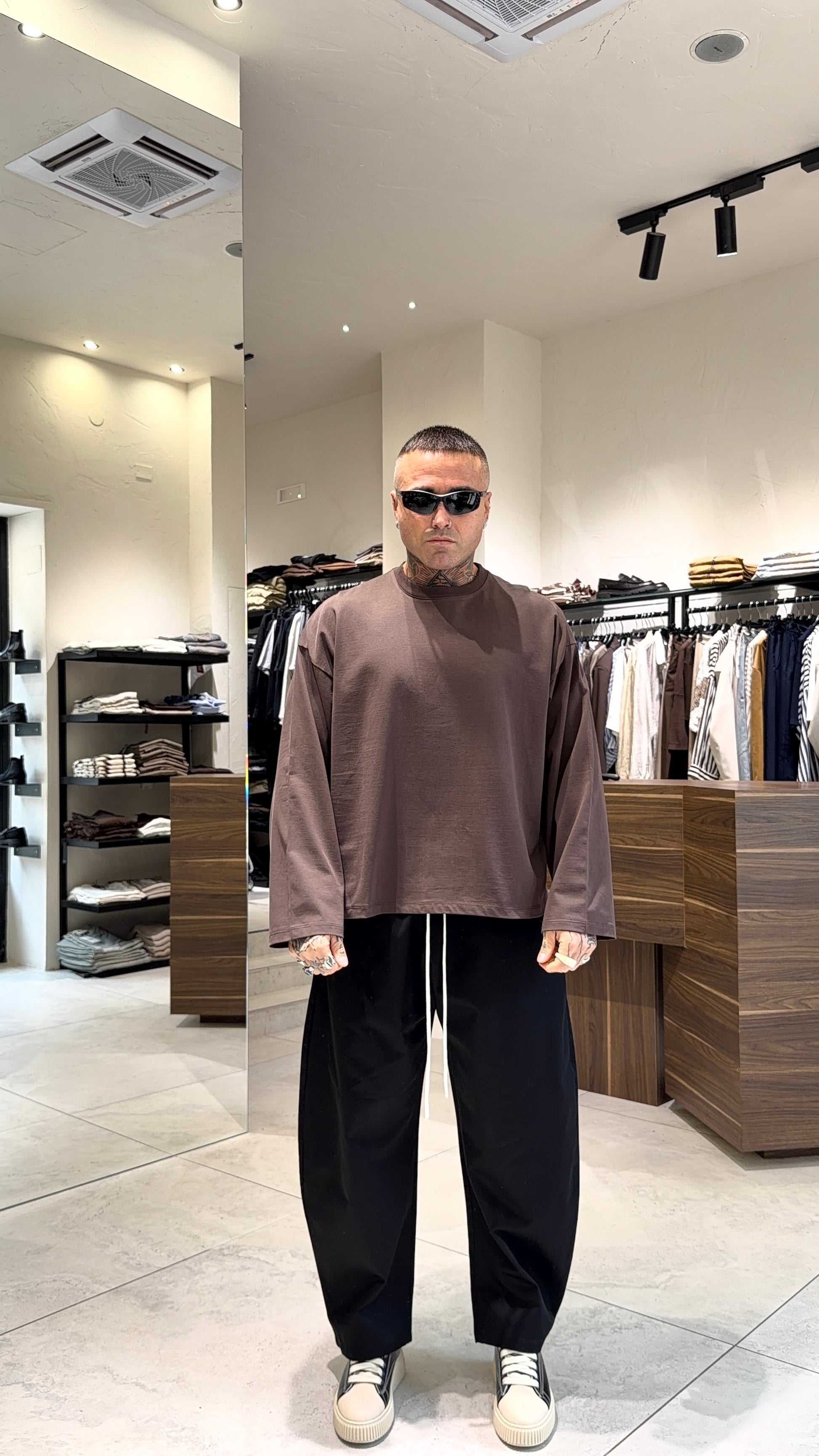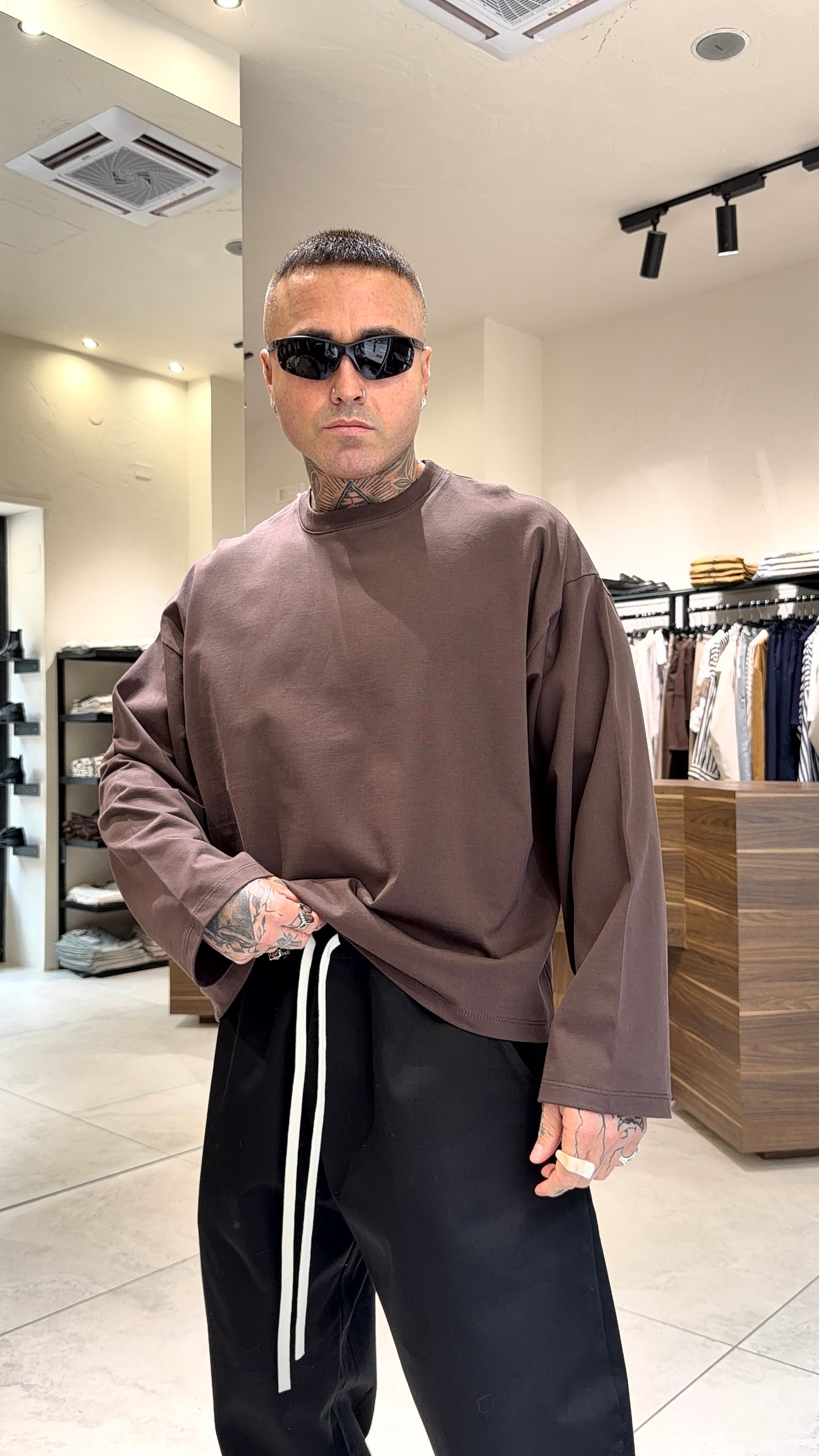 Modello H 1.83 X 85 kg indossa taglia L. Vestibilità corta over. Manica larga. Tessuto cotone.