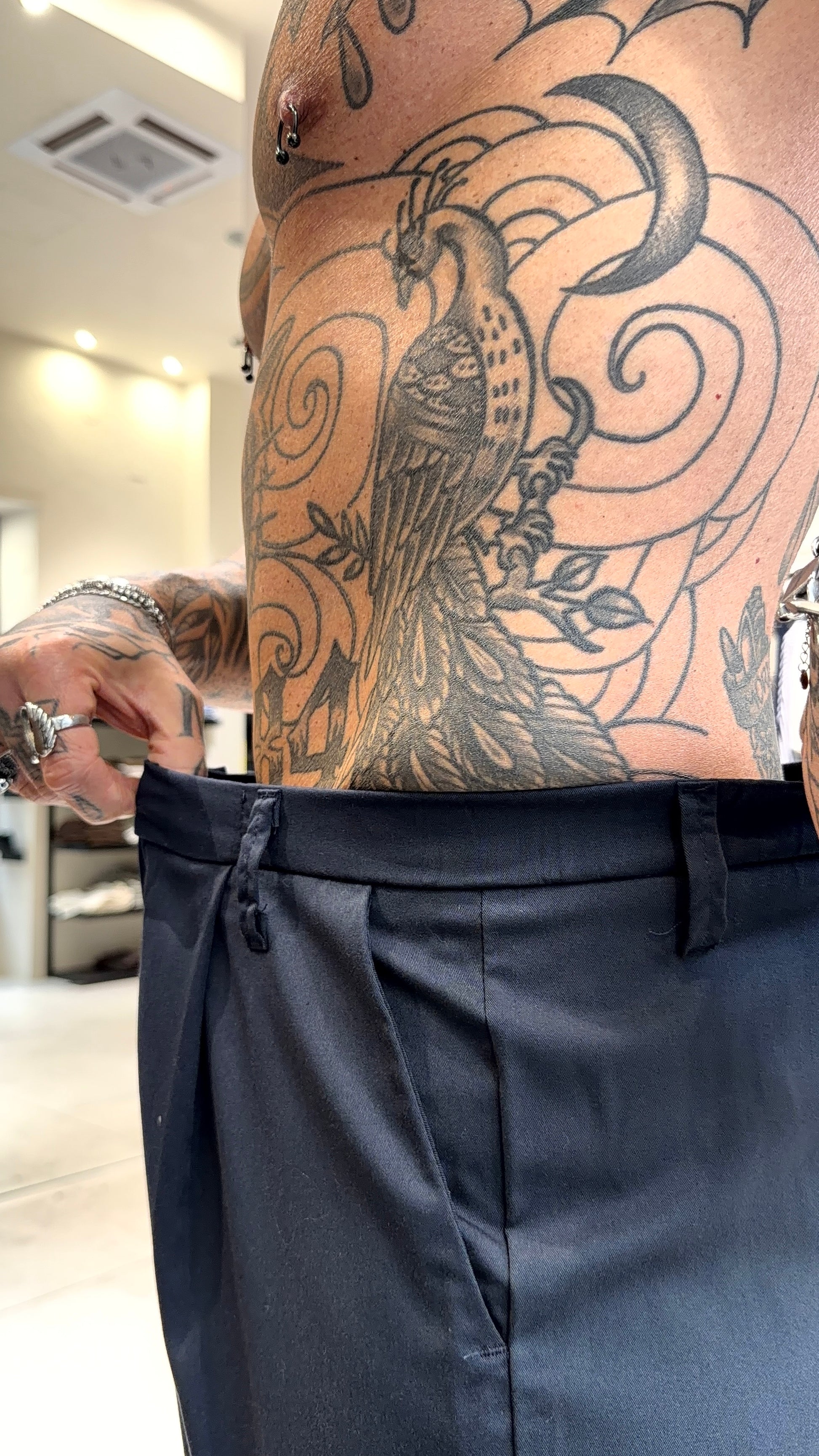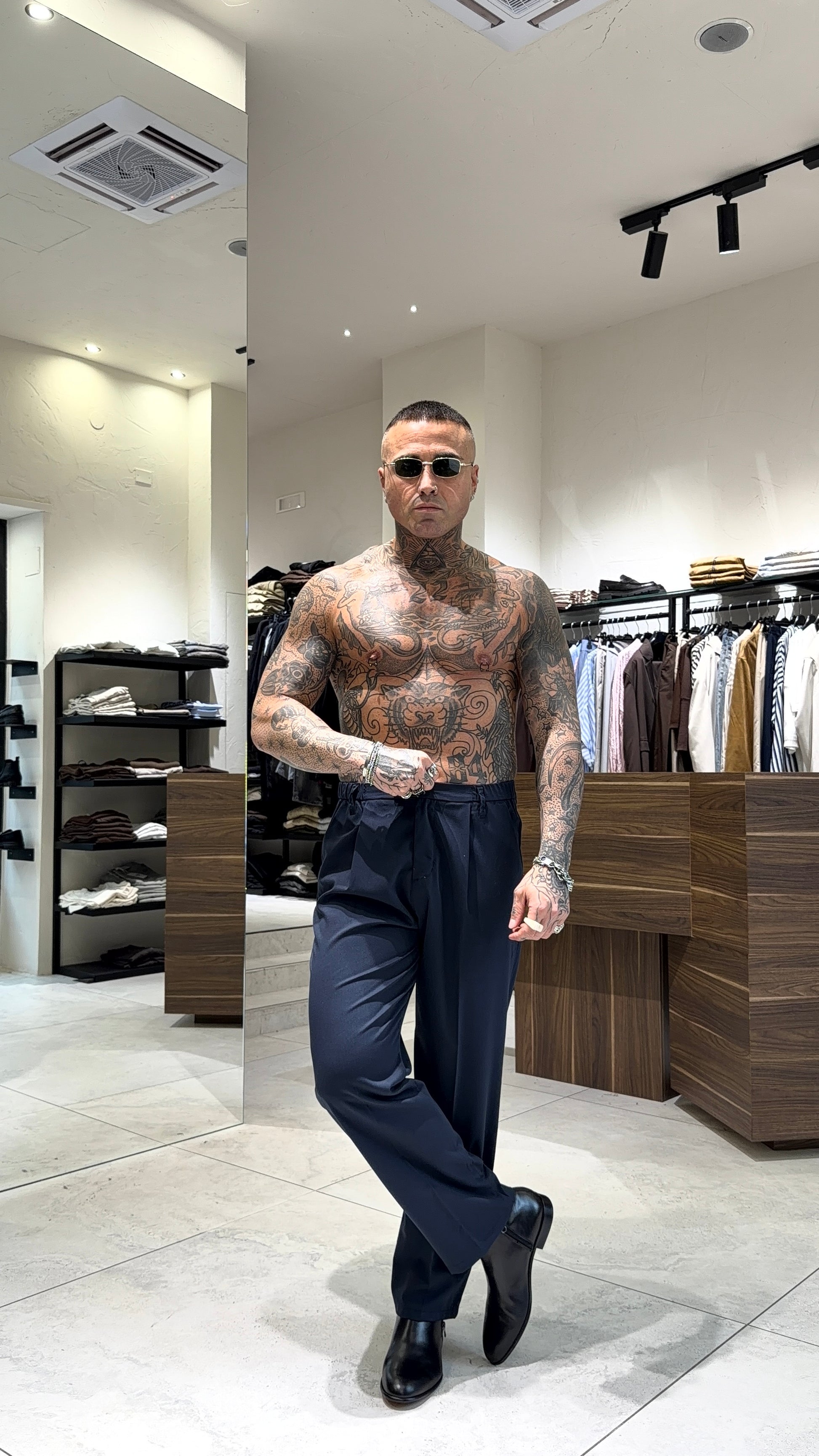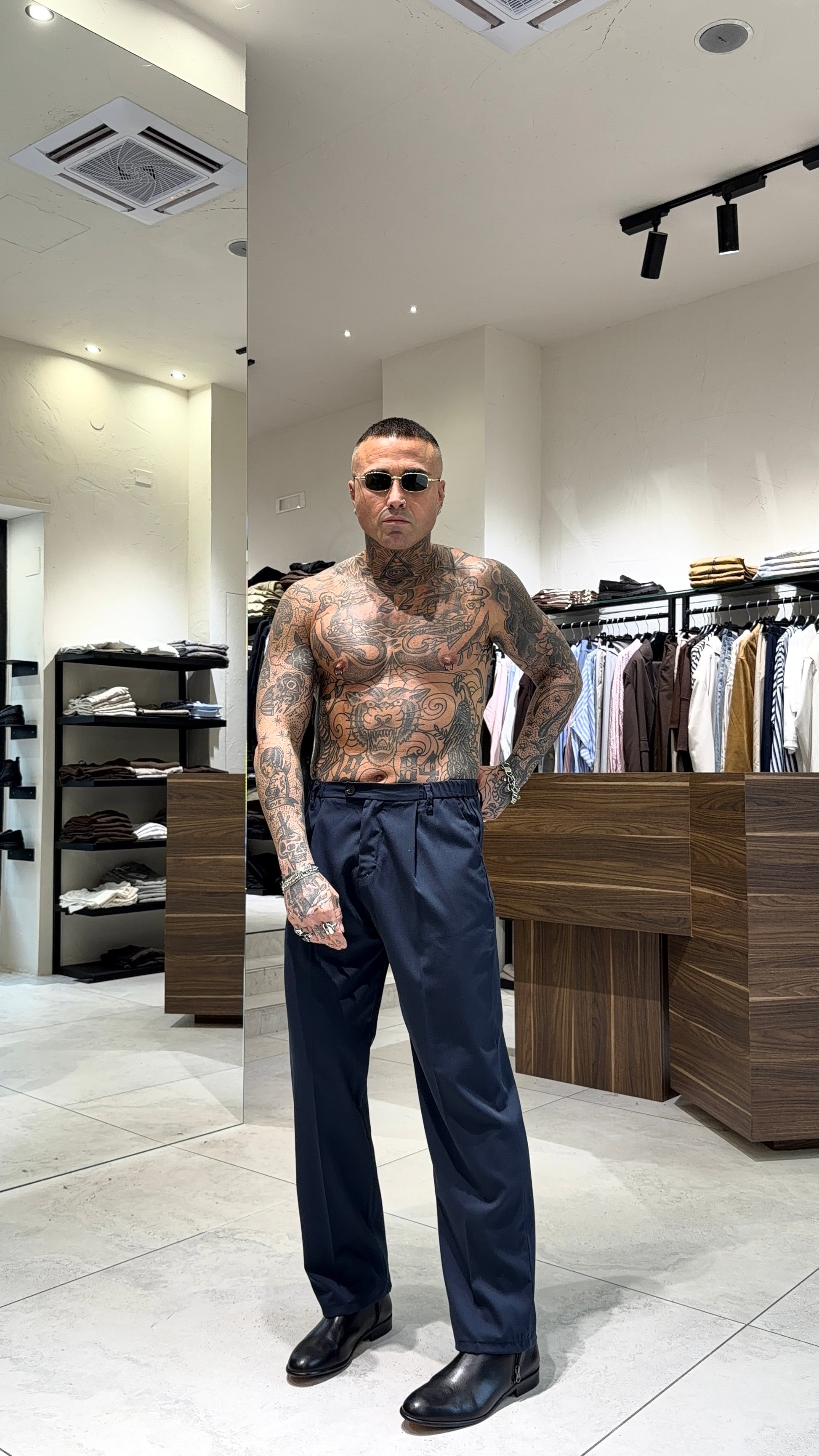 Modello H 1.83 X 85 kg indossa taglia XL. Vestibilità gamba semi larga. Poliviscosa. Chiusura bottone e zip. Pence.