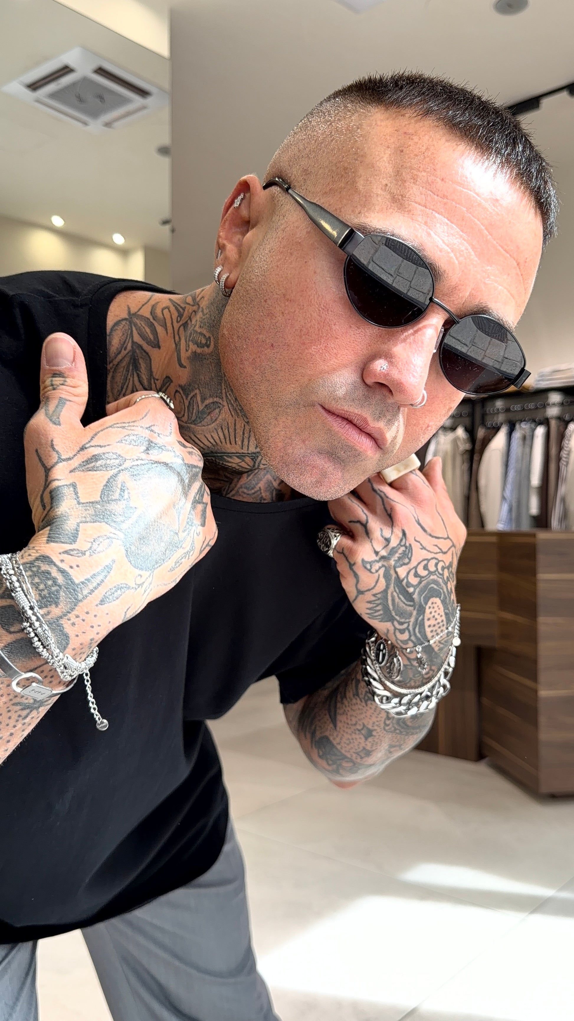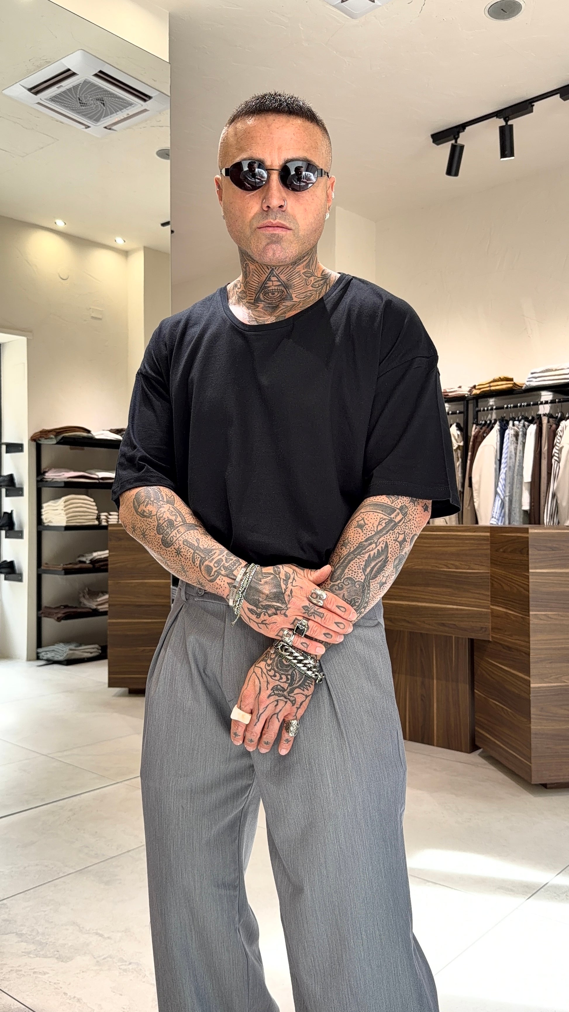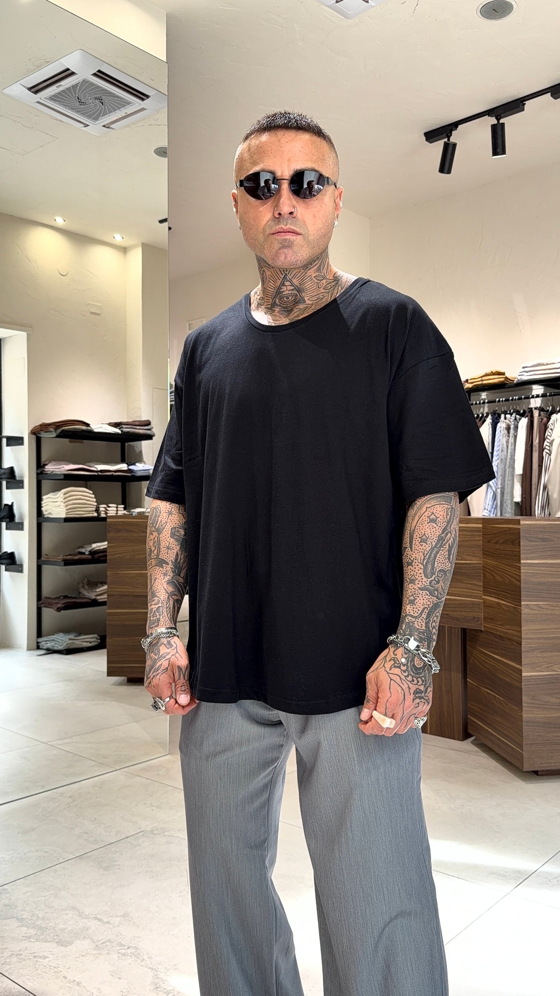 Modello H 1.83 X 85 kg indossa taglia L. Vestibilità over. Girocollo largo. Cotone.