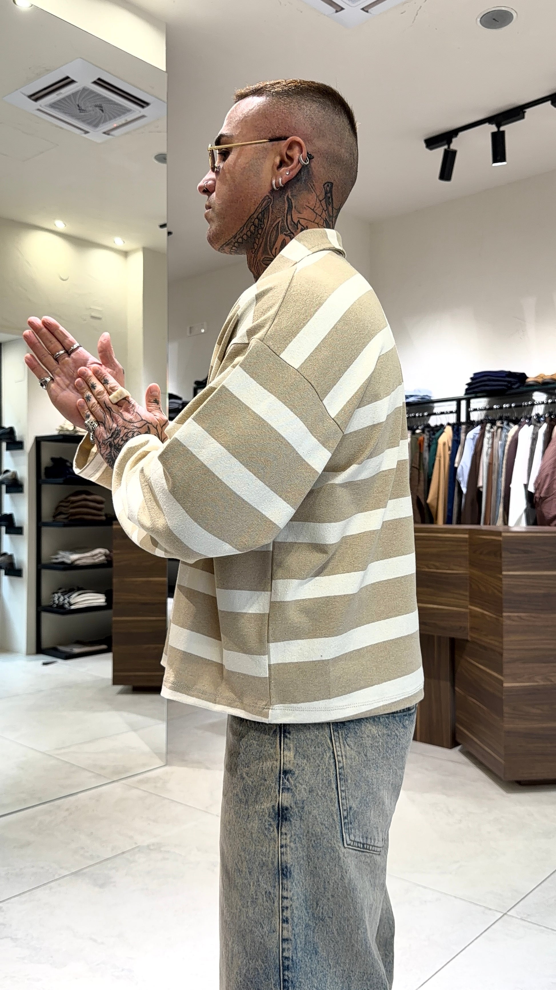 Modello H 1.83 X 85 kg indossa taglia L. Vestibilità corta e larga. Collo con bottoni. Misto cotone.