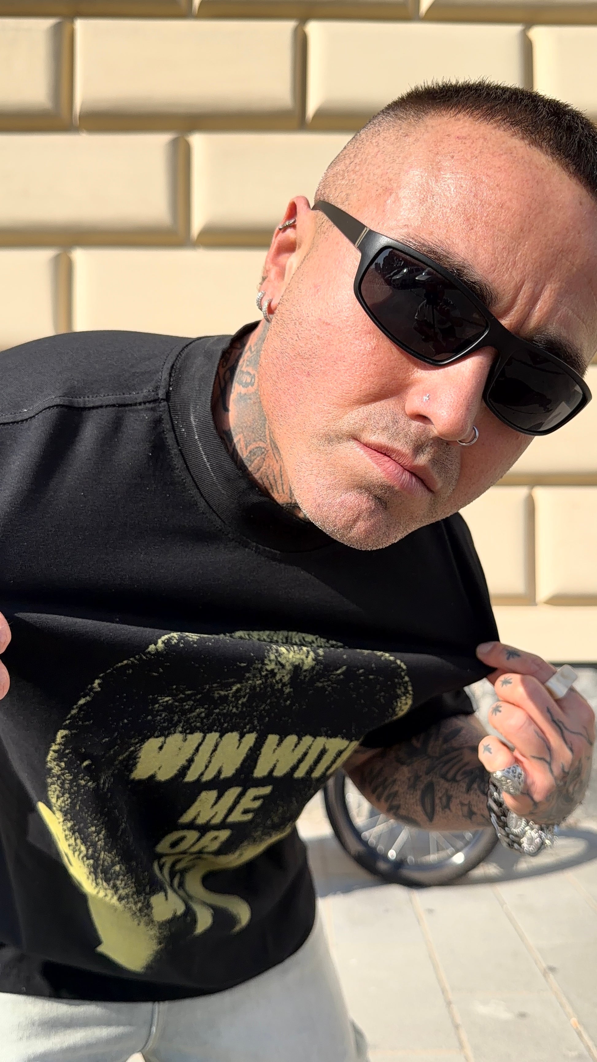 Modello H 1.83 X 85 kg indossa XL. Vestibilità over. Stampa fronte. Cotone.