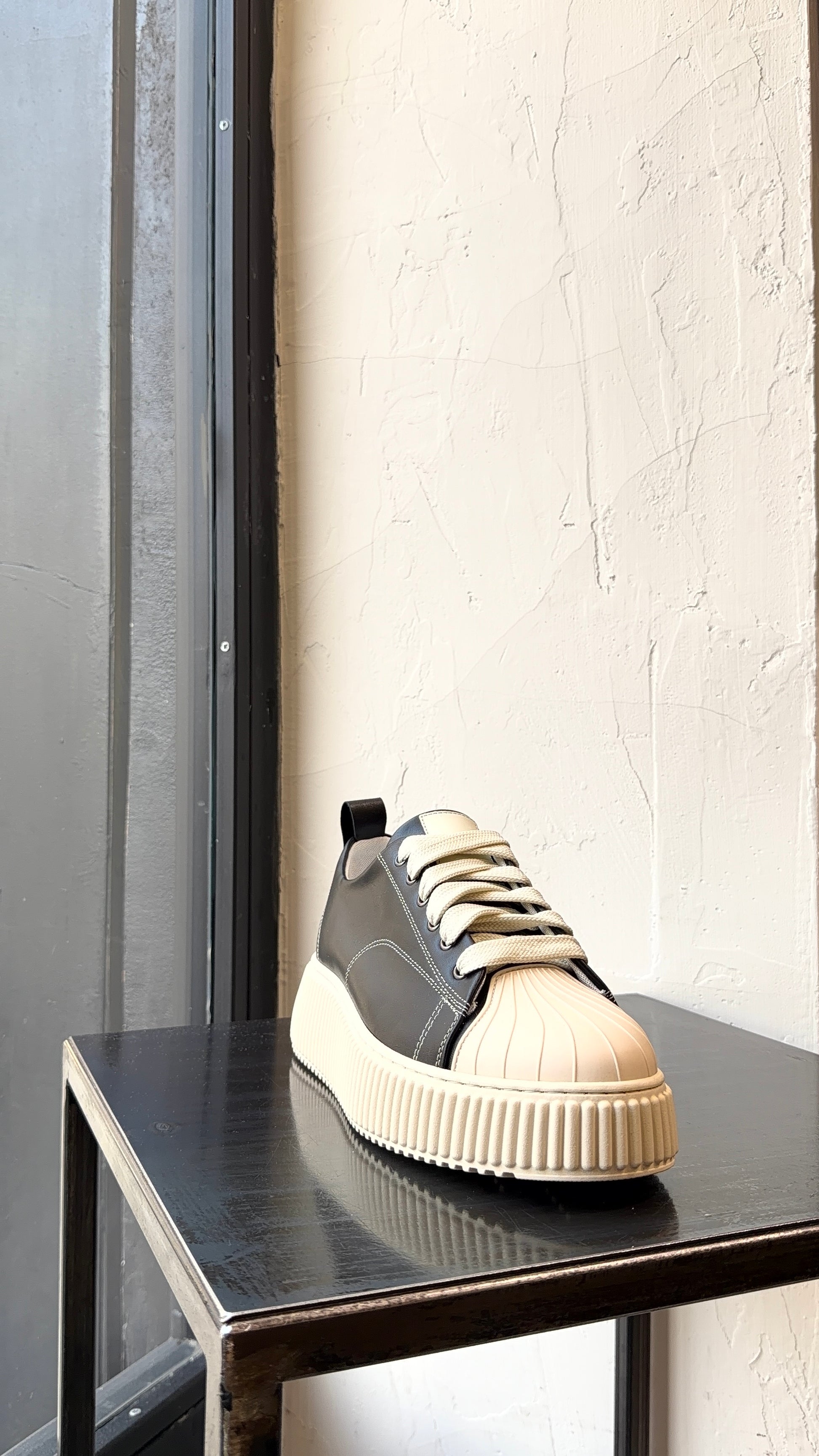 Gomma alta. Punta rotonda. Calzata ampia. Pelle.