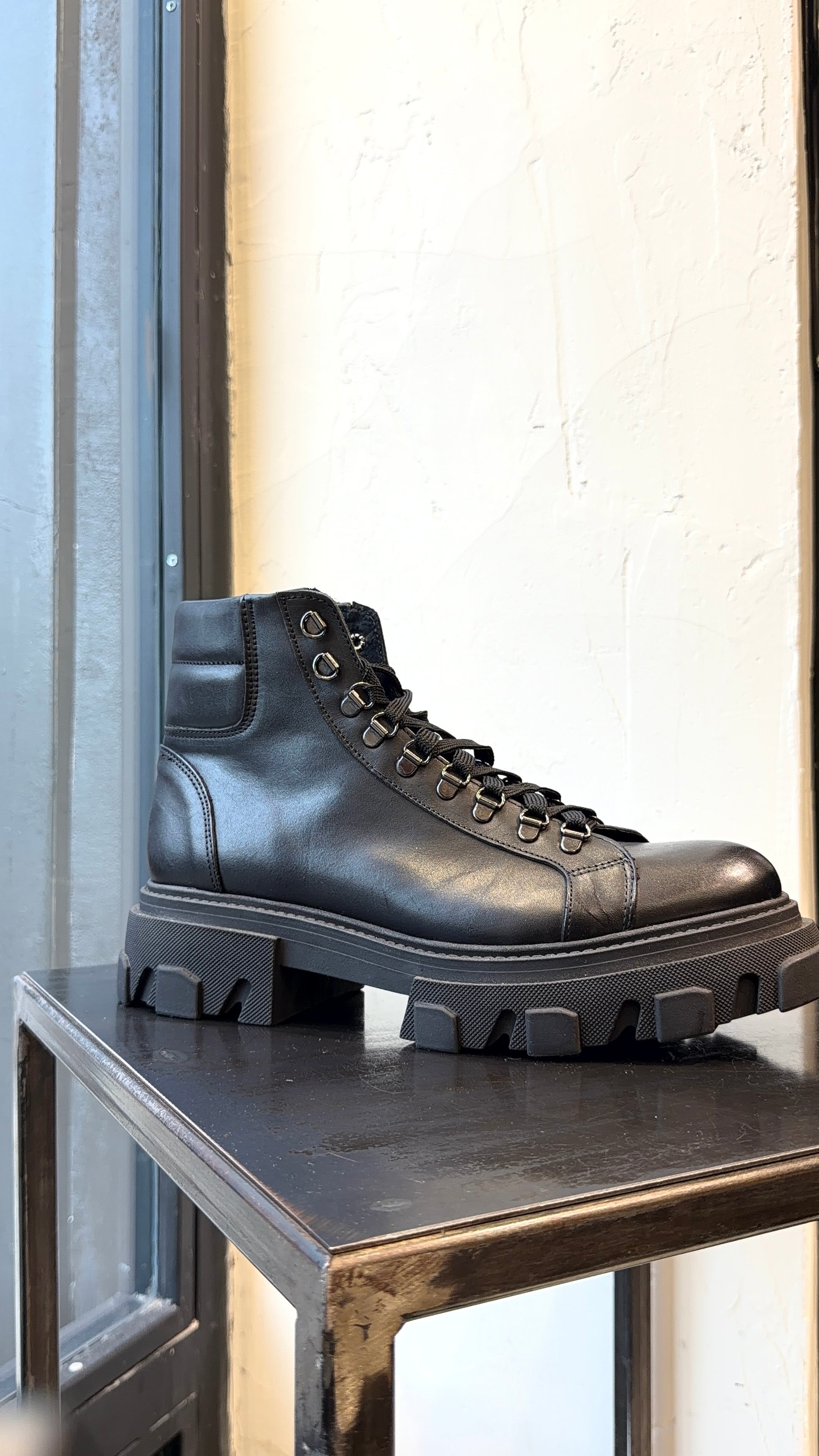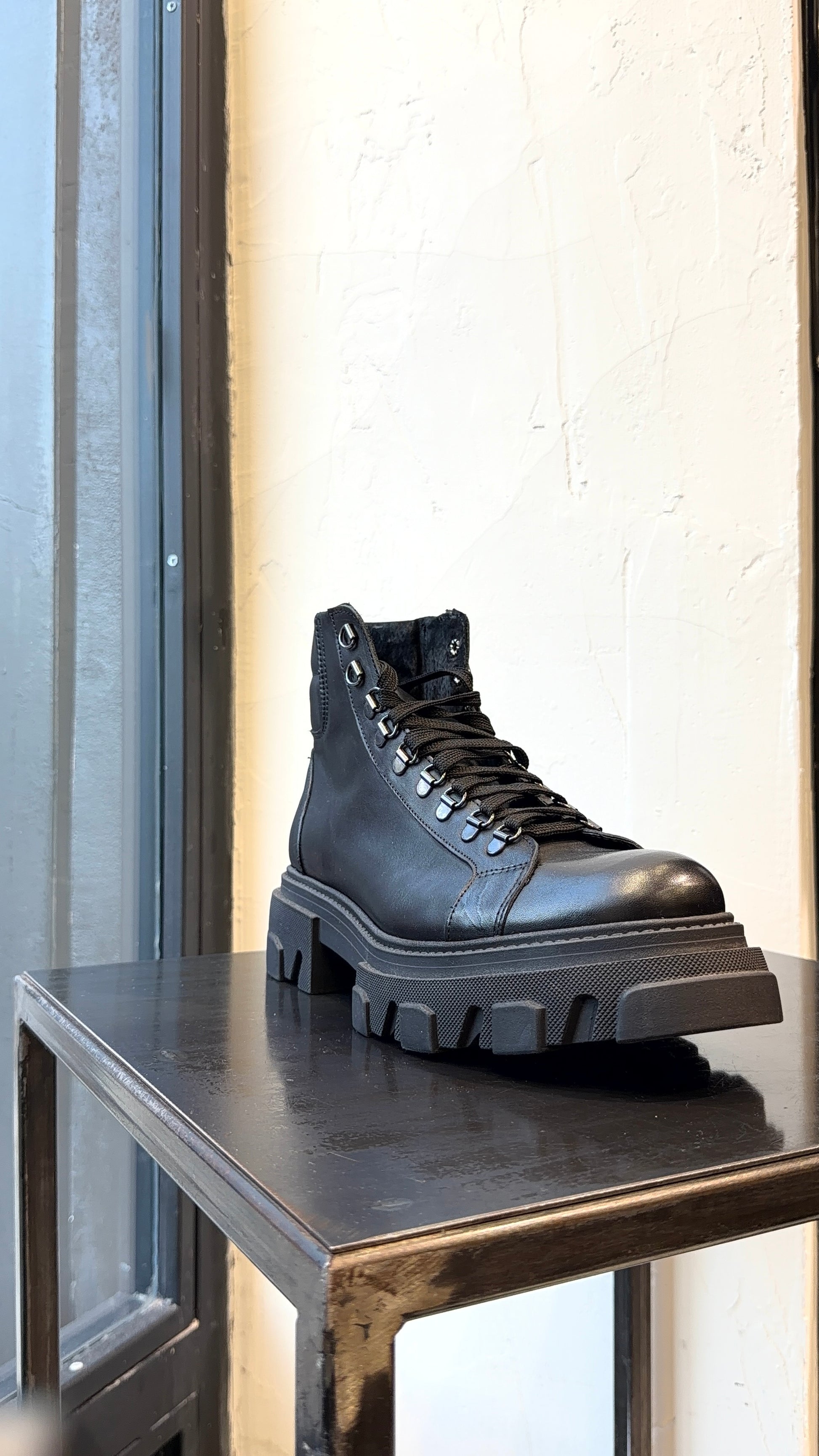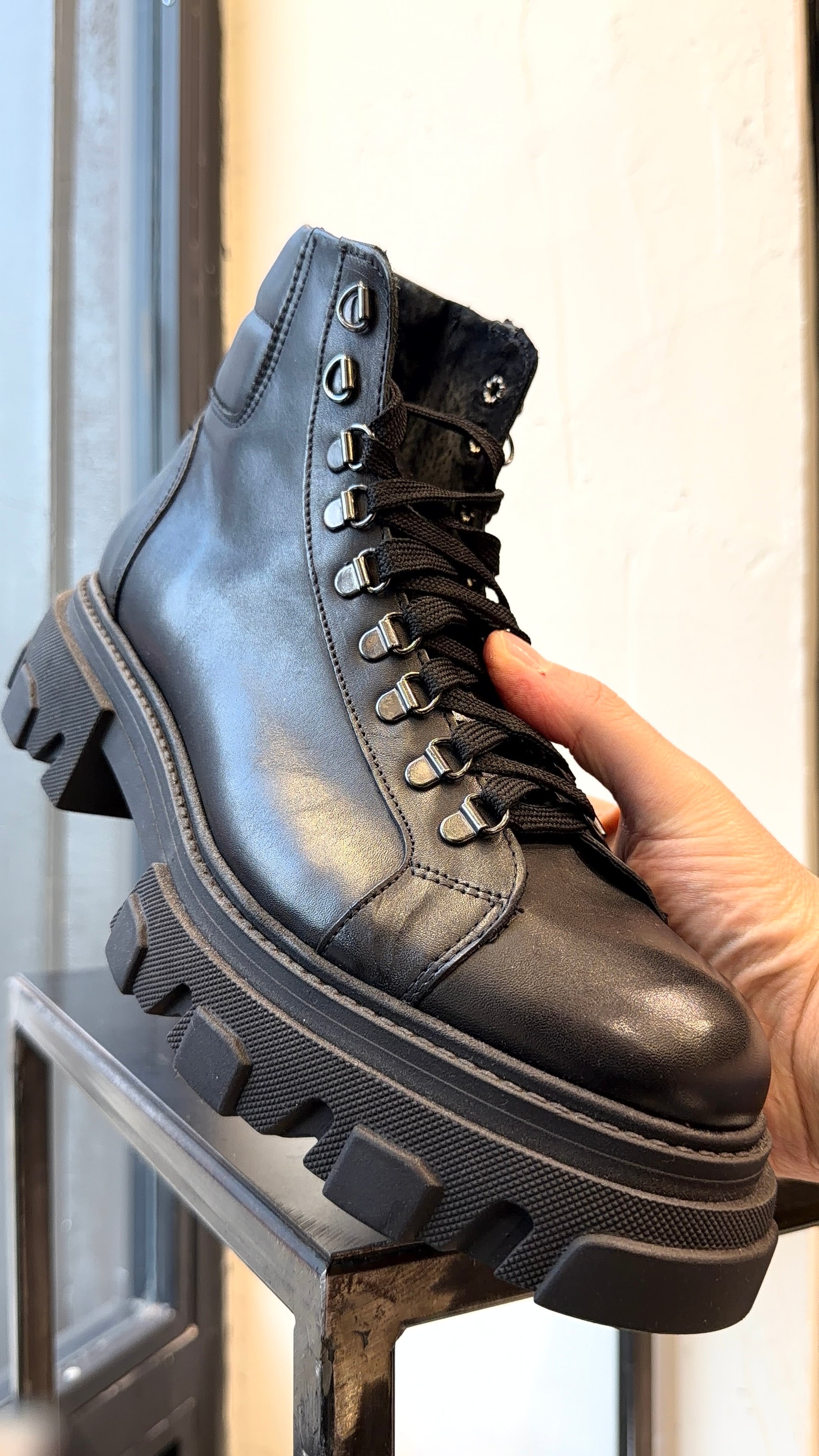 Tessuto pelle. Chiusura lacci frontale. Gomma alta con tacco largo.