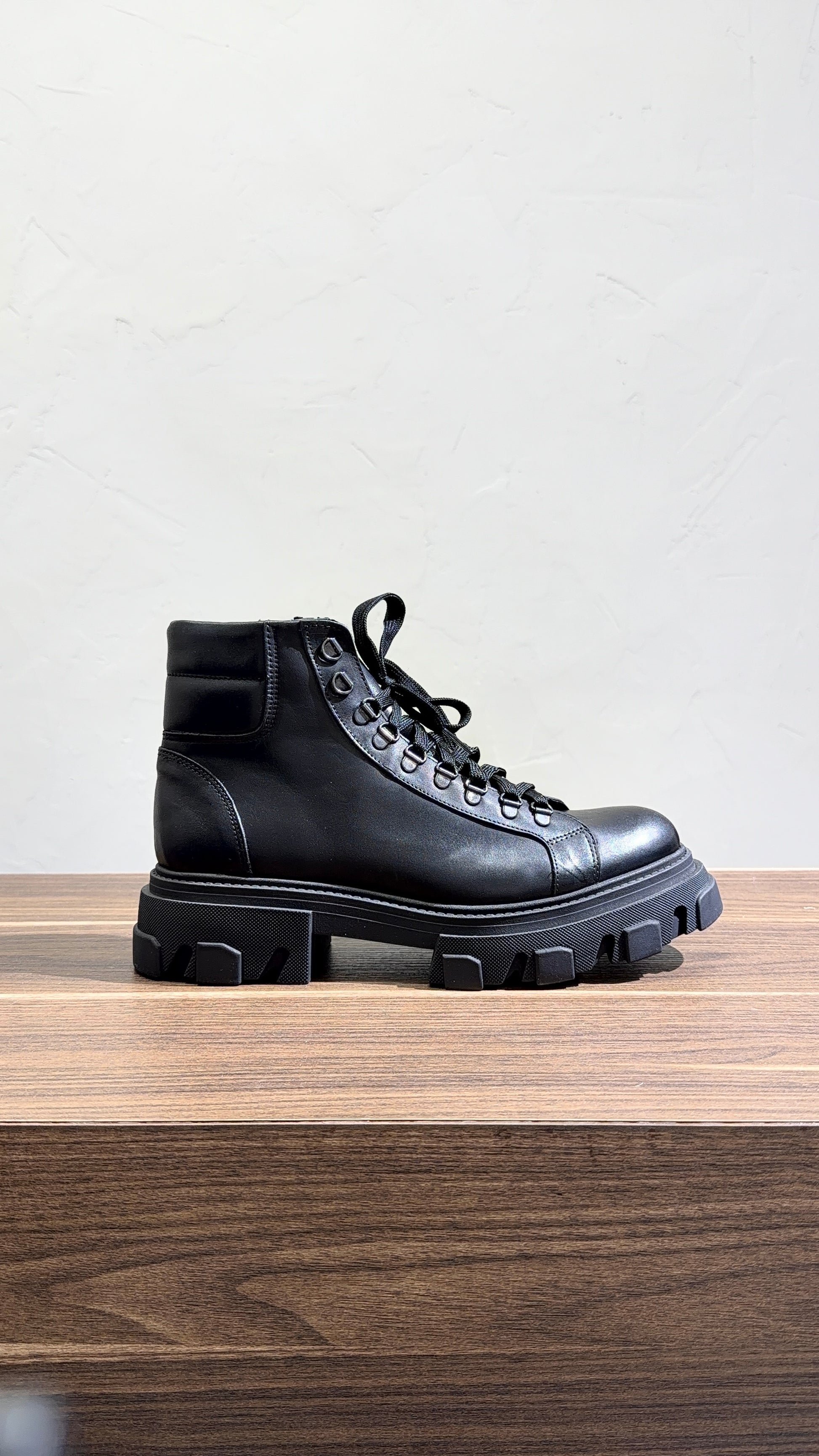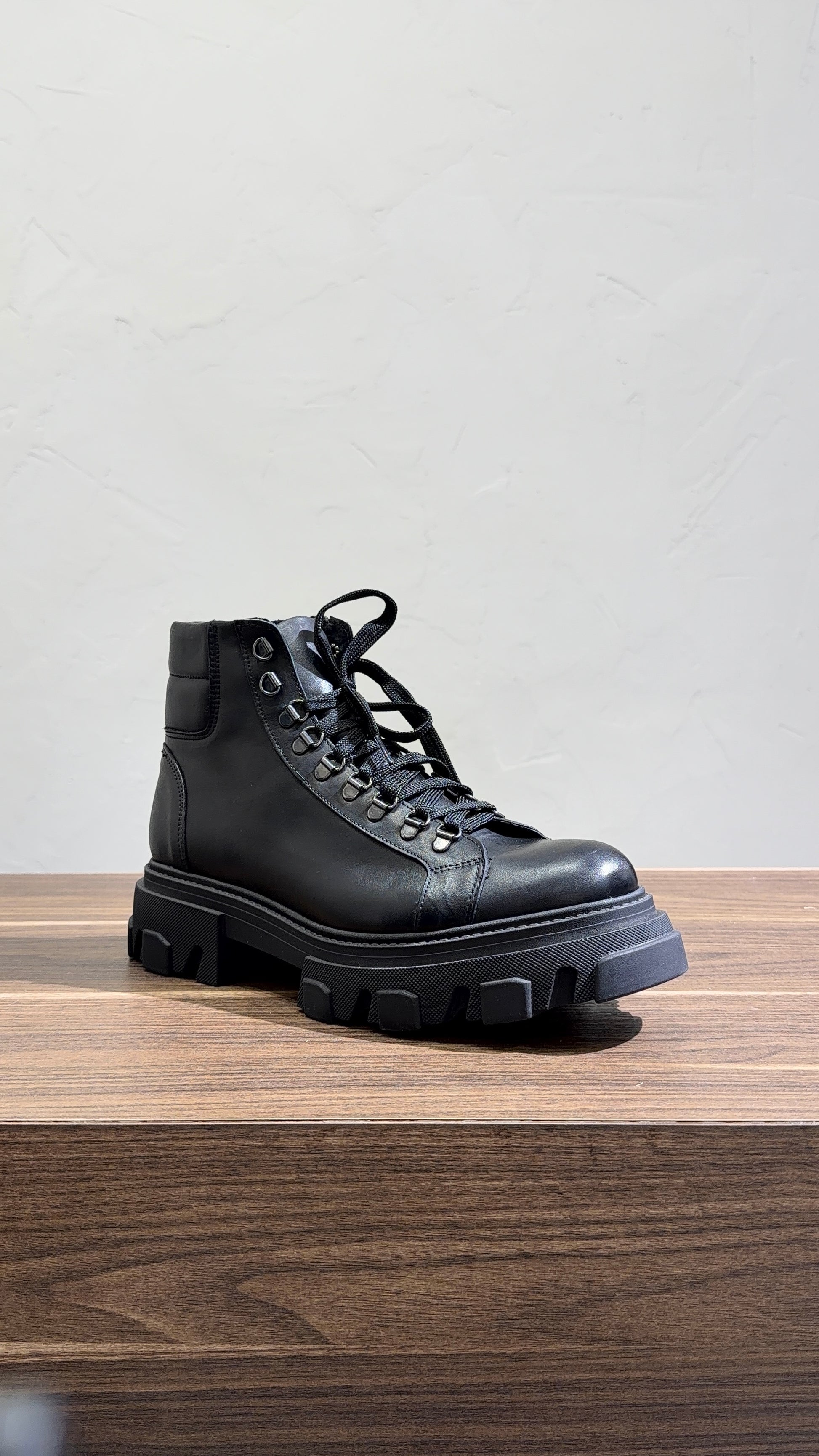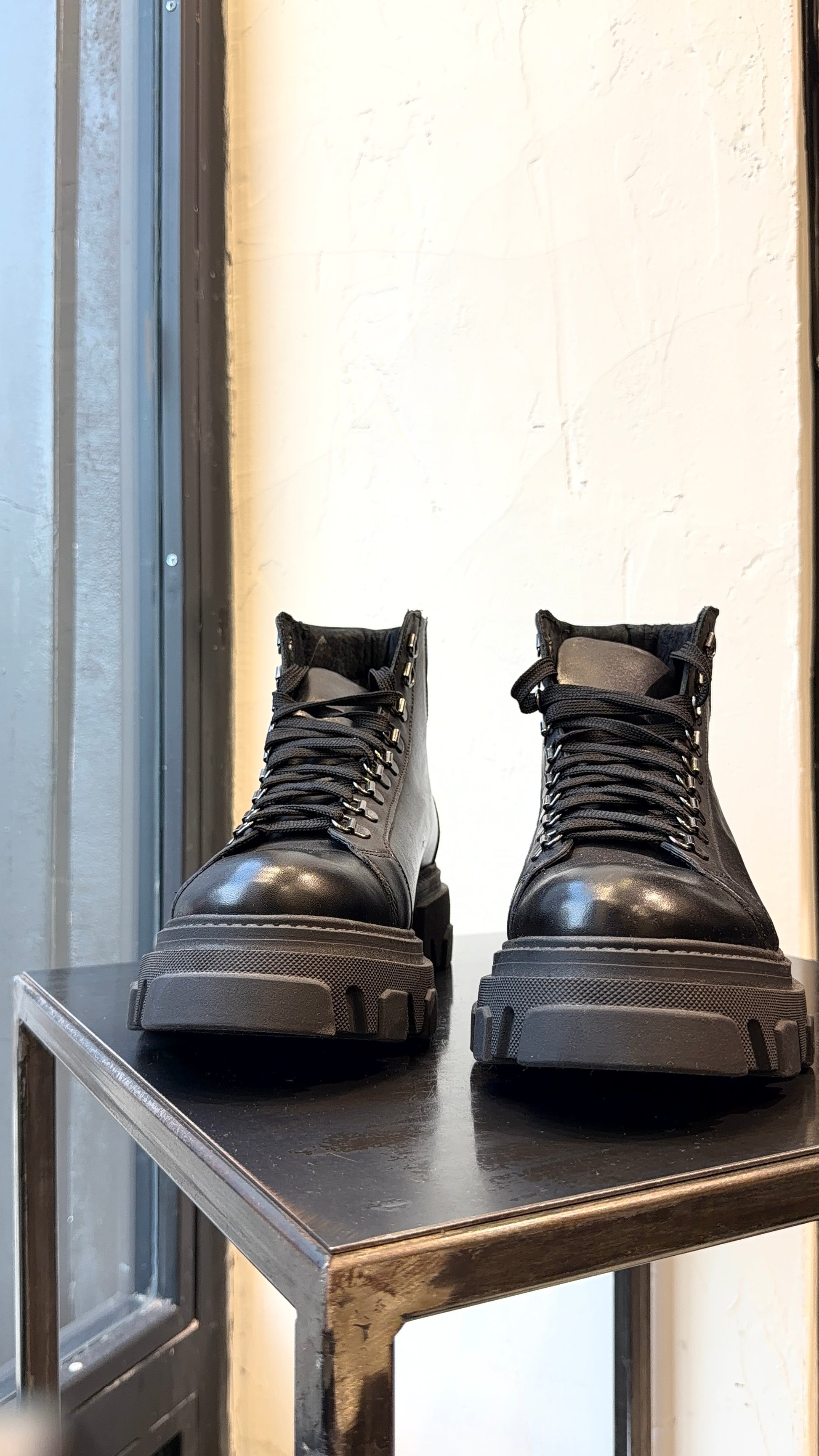 Tessuto pelle. Chiusura lacci frontale. Gomma alta con tacco largo.