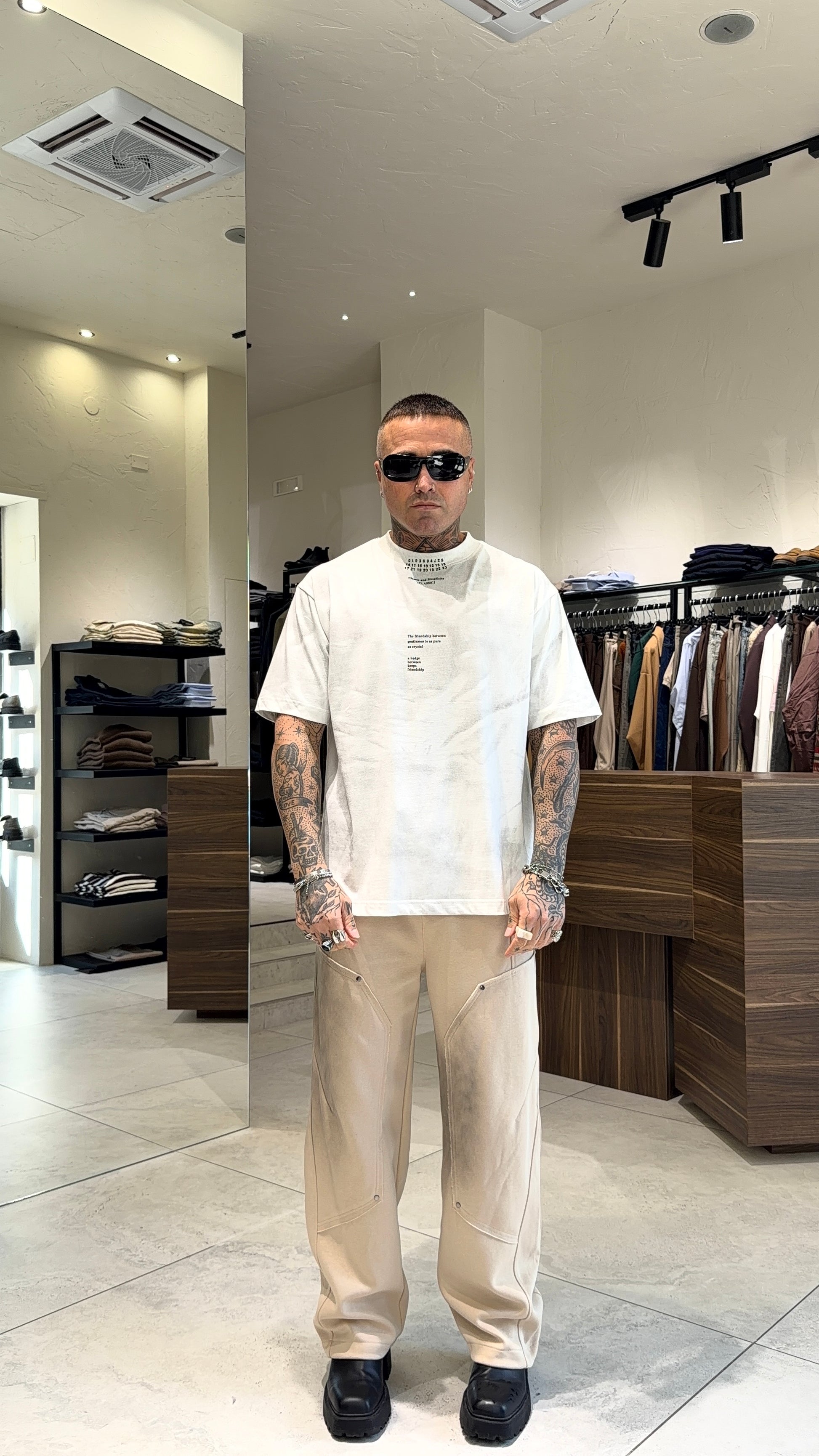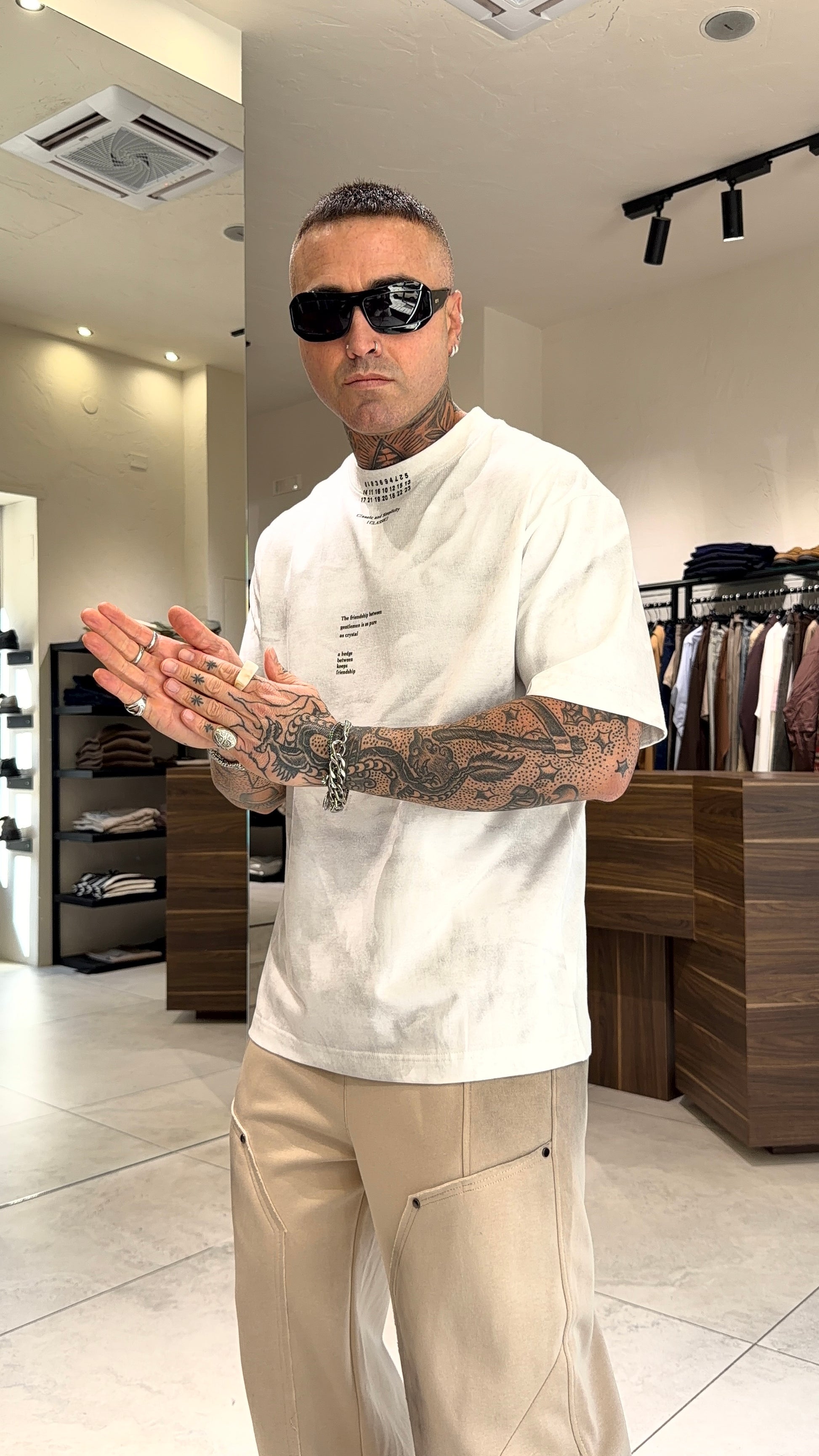 Modello H 1.83 X 85 kg indossa taglia L. Vestibilità larga. Stampa frontale. 100% cotone.