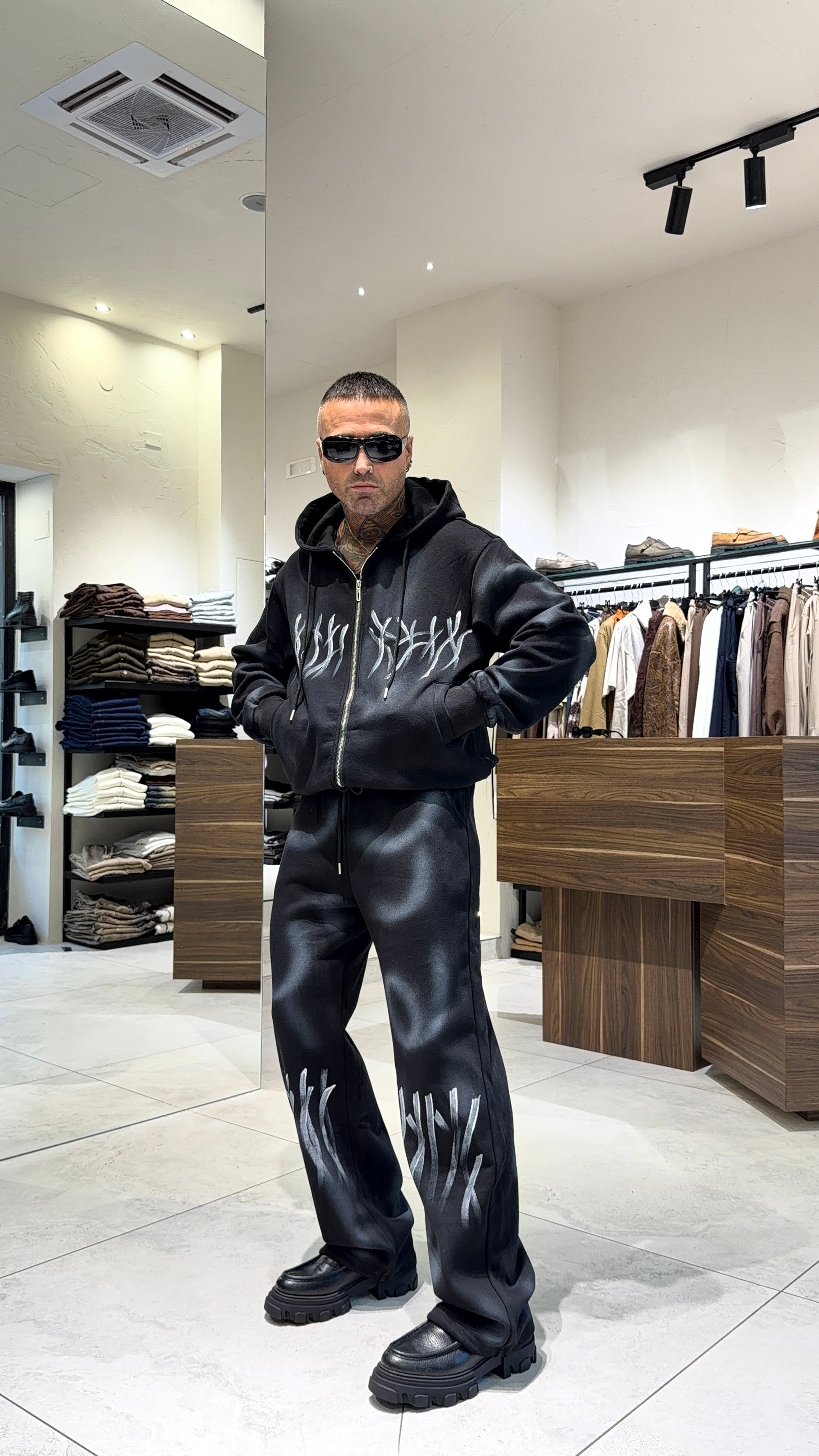 Modello H 1.83 x 85 kg indossa taglia XL. Vestibilità over. Felpa con chiusura zip, tasche, abrasioni, cappuccio, toppa ricamata. Pantalone con laccio regolabile in vita, gamba ampia, abrasioni, sfumature, toppa ricamata. Garzata internamente.