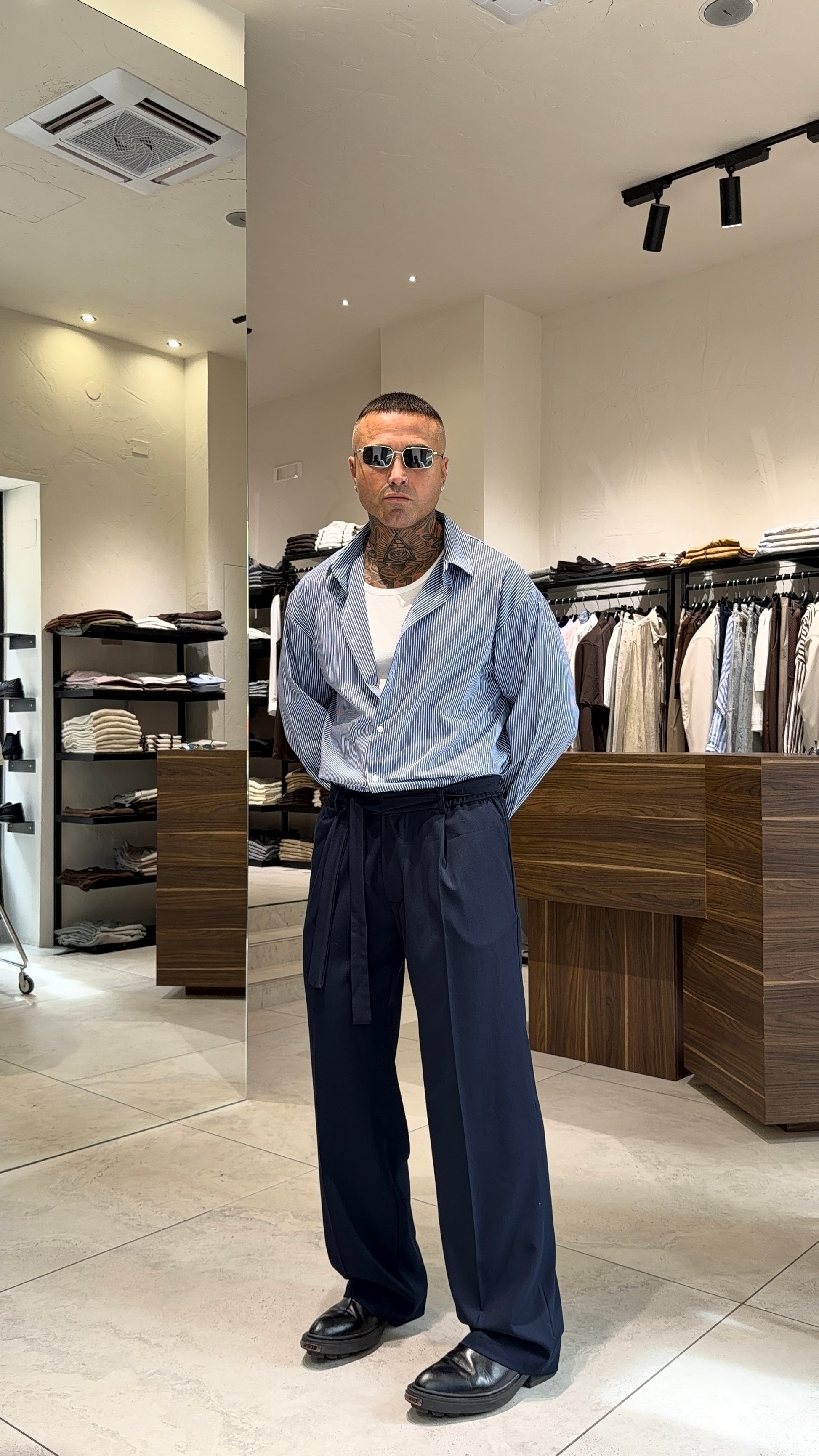 Modello H 1.83 X 85 kg indossa taglia XL. Vestibilità larga. Bustino elastico con chiusura zip e bottone. Cinta in tessuto nei passanti. Gamba ampia.