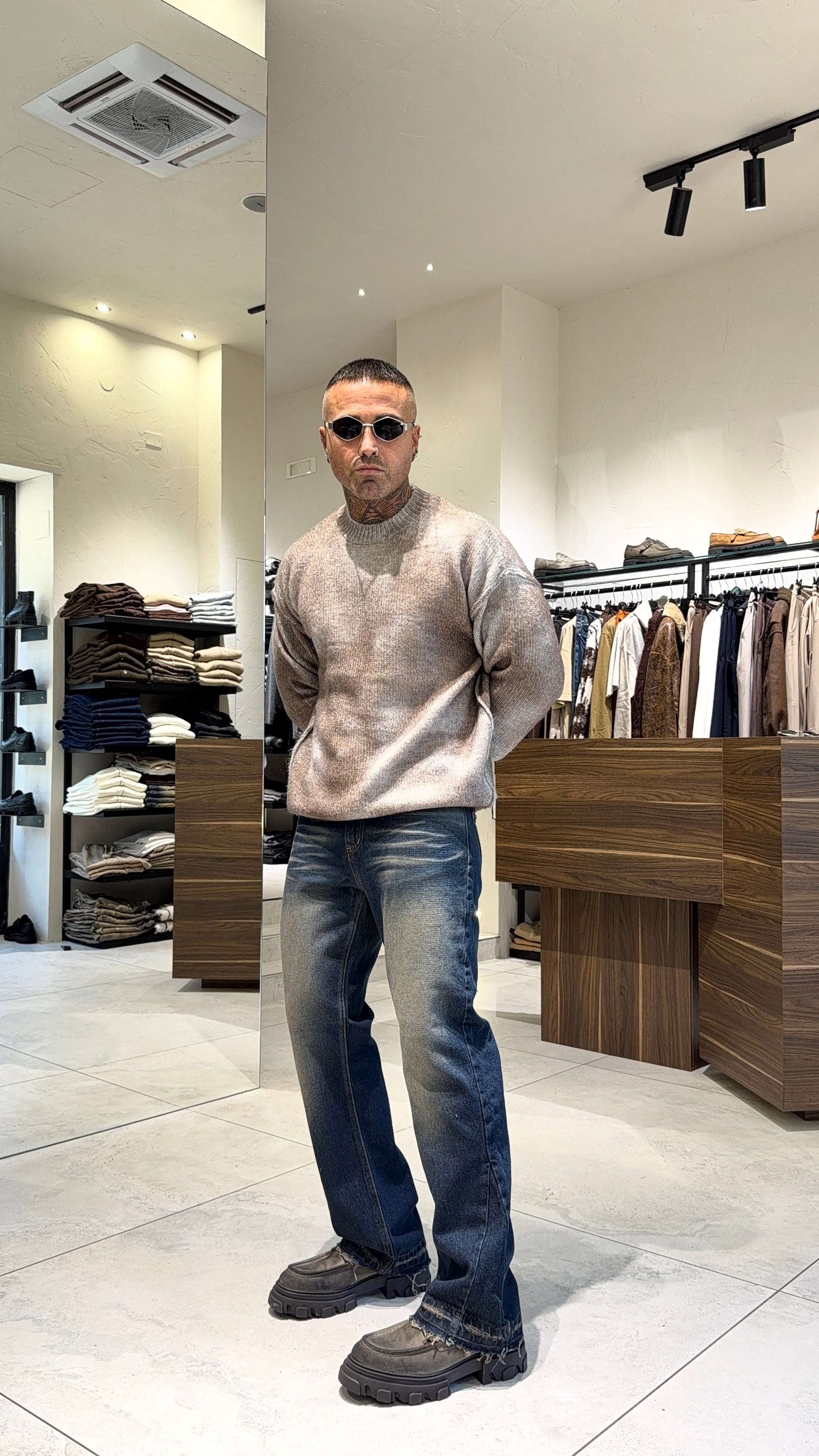 Modello H 1.83 X 85 kg indossa taglia L. Vestibilità over. Misto lana. Effetto maltinto.